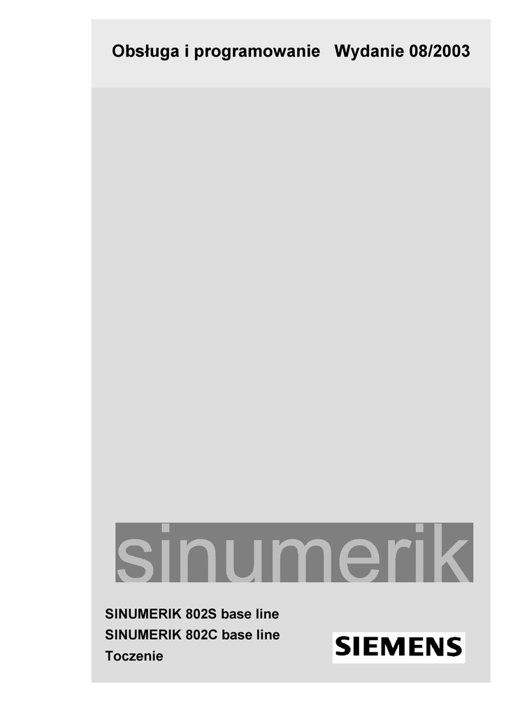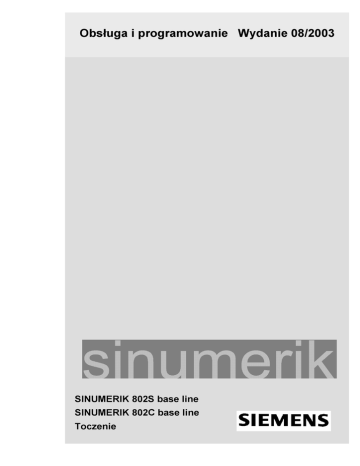 Obsługa i programowanie Wydanie 08/2003 SINUMERIK 802S base line SINUMERIK 802C base line Toczenie SINUMERIK 802S base line SINUMERIK 802C base line Obsługa i programowanie Toczenie Podręcznik uŜytkownika Podręcznik programowania Obowiązuje dla Sterowanie Wersja oprogramowania SINUMERIK 802S 4 SINUMERIK 802C 4 Wydanie 08.2003 Wprowadzenie 1 Włączenie i bazowanie do punktu odniesienia 2 Ustawianie 3 Praca ze sterowaniem ręcznym 4 Praca automatyczna 5 Programowanie obróbki 6 Usługi i diagnoza 7 Programowanie 8 Dokumentacja SINUMERIK ® Klucz wydań Przed niniejszym wydaniem ukazały się wydania wymienione niŜej. W kolumnie „Uwagi” zaznaczono literami, jaki status mają wydania dotychczasowe. Oznaczenie statusu w kolumnie „Uwagi”: A .... Nowa dokumentacja B .... Niezmieniony dodruk z nowym numerem zamówieniowym C .... Zmieniona wersja jako nowe wydanie. JeŜeli przedstawiony na stronie techniczny stan rzeczy zmienił się w stosunku do wydania poprzedniego, jest to sygnalizowane przez zmienione wydanie w nagłówku danej strony Wydanie 02.99 04.00 01.02 08.03 Nr zamówieniowy 6FC5 598-2AA00-0AP1 6FC5 598-3AA00-0AP1 6FC5 598-3AA00-0AP2 6FC5 598-4AA01-0AP0 Uwagi A A C A Marki SIMATIC®, SIMATIC HMI®, SIMATIC NET®, SIROTEC®, SINUMERIK® i SIMODRIVE® są zarejestrowanymi znakami towarowymi SIEMENS AG. Pozostałe określenia uŜyte w niniejszej dokumentacji mogą być znakami towarowymi, których uŜywanie przez strony trzecie do swoich celów moŜe naruszać prawa właścicieli. Wykluczenie odpowiedzialności Copyright Siemens AG 2003. Wszelkie prawa zastrzeŜone Przekazywanie jak teŜ powielanie niniejszej dokumentacji, spoŜytkowywanie jej i informowanie o jej treści jest niedozwolone, o ile nie wyraŜono na to wyraźnej zgody. Naruszenia zobowiązują do rekompensaty szkód. Wszystkie prawa zastrzeŜone, w szczególności na wypadek udzielenia patentu albo zarejestrowania wzoru uŜytkowego. Sprawdziliśmy treść dokumentacji na zgodność z opisanym sprzętem i oprogramowaniem. Mimo to rozbieŜności nie moŜna wykluczyć, tak Ŝe nie moŜemy zagwarantować pełnej zgodności. Dane w niniejszej dokumentacji są regularnie sprawdzane a niezbędne korekty są zawierane w kolejnych wydaniach. Za propozycje korekt będziemy wdzięczni. Zmiany techniczne zastrzeŜone © Siemens AG 2003 Wszelkie prawa zastrzeŜone Nr zamówieniowy 6FC5 598-4AA11-0AP0 Siemens Sp. z o.o. Wskazówki techniczne dotyczące bezpieczeństwa Niniejszy podręcznik zawiera wskazówki, których musicie przestrzegać dla swojego bezpieczeństwa jak teŜ w celu uniknięcia szkód rzeczowych. Wskazówki są uwidocznione trójkątem ostrzegawczym i w zaleŜności od stopnia zagroŜenia przedstawione następująco: Niebezpieczeństwo oznacza, Ŝe nastąpi śmierć, cięŜkie uszkodzenie ciała albo znaczna szkoda rzeczowa, gdy odpowiednie środki ostroŜności nie zostaną podjęte. OstrzeŜenie oznacza, Ŝe grozi śmierć, cięŜkie uszkodzenie ciała albo znaczna szkoda rzeczowa, gdy odpowiednie środki ostroŜności nie zostaną podjęte. OstroŜnie oznacza, Ŝe moŜe nastąpić lekkie uszkodzenie ciała albo szkoda rzeczowa, gdy odpowiednie środki ostroŜności nie zostaną podjęte. OstroŜnie bez trójkąta ostrzegawczego oznacza, Ŝe moŜe nastąpić szkoda rzeczowa, gdy odpowiednie środki ostroŜności nie zostaną podjęte. Wskazówka jest waŜną informacją o produkcie, obchodzeniu się z nim albo tej części dokumentacji, na którą ma być zwrócona szczególna uwaga. Personel kwalifikowany Uruchomienie urządzenia i pracę z nim wolno jest prowadzić tylko personelowi wykwalifikowanemu. Personel wykwalifikowany w rozumieniu dotyczących bezpieczeństwa wskazówek zawartych w niniejszym podręczniku są to osoby, które są uprawnione do uruchamiania, uziemiania i oznakowywania urządzeń, systemów i obwodów prądu według standardów techniki bezpieczeństwa. UŜycie zgodnie z przeznaczeniem Przestrzegajcie co następuje: OstrzeŜenie Urządzenia wolno jest uŜywać tylko zastosowań przewidzianych w katalogu i w opisie technicznym i tylko w połączeniu z zalecanymi wzgl. dopuszczonymi przez firmę Siemens urządzeniami i komponentami obcymi. Nienaganna i bezpieczna praca produktu zakłada jego naleŜyty transport, naleŜyte magazynowanie jak teŜ staranną obsługę i konserwację. SINUMERIK 802S/802C base line 6FC5 598-4AA01-0AP0 (03.08) (BP-D) V Treść Treść 1 2 3 4 SINUMERIK 802S base line płaski pulpit obsługi OP ....................................VI Wprowadzenie ..........................................................................................................1-11 1.1 Podział ekranu.............................................................................................1-11 1.2 Zakresy czynności obsługowych ..................................................................1-14 1.3 Przegląd najwaŜniejszych funkcji przycisków programowanych....................1-15 1.4 Kalkulator ....................................................................................................1-16 1.5 Układy współrzędnych .................................................................................1-20 Włączenie i bazowanie do punktu odniesienia .......................................................2-23 Ustawianie ................................................................................................................3-25 3.1 3.1.1 3.1.2 3.1.3 3.2 3.2.1 3.3 3.4 Wprowadzenie narzędzi i ich korekcji...........................................................3-25 Utworzenie nowego narzędzia .....................................................................3-26 Dane korekcyjne narzędzia..........................................................................3-27 Określenie korekcji narzędzia ......................................................................3-28 Wprowadzenie / zmiana przesunięcia punktu zerowego...............................3-30