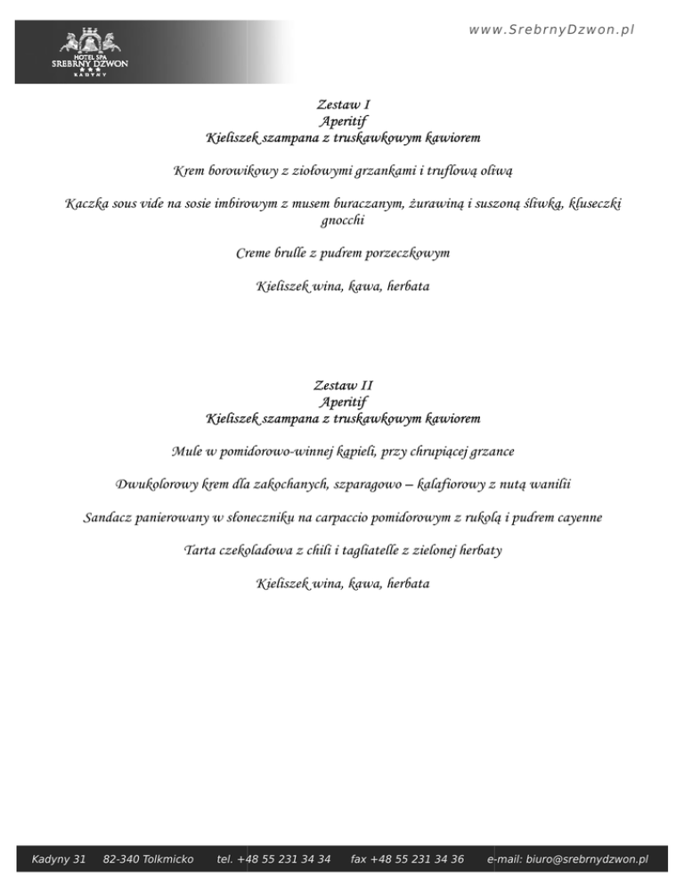 w w w. Sr ebr nyDzw o n . pl Zestaw I Aperitif Kieliszek szampana z truskawkowym kawiorem Krem borowikowy z ziołowymi ziołowymi grzankami i truflową oliwą Kaczka sous vide na sosie imbirowym z musem buraczanym, żurawiną i suszoną śliwką, kluseczki gnocchi Creme brulle z pudrem porzeczkowym Kieliszek wina, kawa, herbata Zestaw II Aperitif Kieliszek szampana z truskawkowym kawiorem Mule ule w pomidorowo-winnej pomidorowo winnej kąpieli, przy chrupiącej grzance Dwukolorowy krem dla zakochanych, z szparagowo – kalafiorowy z nutą wanilii Sandacz panierowany w słoneczniku na carpaccio carpacci pomidorowym z rukolą i pudrem cayenne Tarta czekoladowa z chili i tagliatelle tag iatelle z zielonej herbaty Kieliszek wina, kawa, herbata Kadyny 31 82-340 340 Tolkmicko tel. +48 55 231 34 34 fax +48 55 231 34 36 e--mail: [email protected]