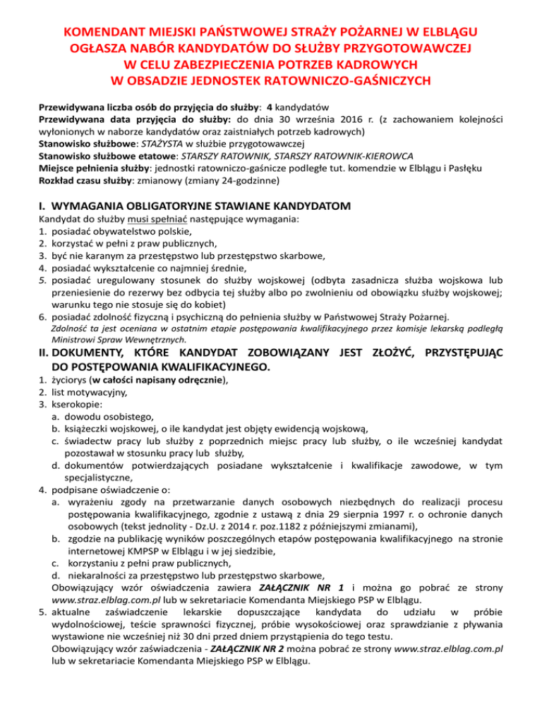 KOMENDANT MIEJSKI PAŃSTWOWEJ STRAŻY POŻARNEJ W ELBLĄGU OGŁASZA NABÓR KANDYDATÓW DO SŁUŻBY PRZYGOTOWAWCZEJ W CELU ZABEZPIECZENIA POTRZEB KADROWYCH W OBSADZIE JEDNOSTEK RATOWNICZO-GAŚNICZYCH Przewidywana liczba osób do przyjęcia do służby: 4 kandydatów Przewidywana data przyjęcia do służby: do dnia 30 września 2016 r. (z zachowaniem kolejności wyłonionych w naborze kandydatów oraz zaistniałych potrzeb kadrowych) Stanowisko służbowe: STAŻYSTA w służbie przygotowawczej Stanowisko służbowe etatowe: STARSZY RATOWNIK, STARSZY RATOWNIK-KIEROWCA Miejsce pełnienia służby: jednostki ratowniczo-gaśnicze podległe tut. komendzie w Elblągu i Pasłęku Rozkład czasu służby: zmianowy (zmiany 24-godzinne) I. WYMAGANIA OBLIGATORYJNE STAWIANE KANDYDATOM Kandydat do służby musi spełniać następujące wymagania: 1. posiadać obywatelstwo polskie, 2. korzystać w pełni z praw publicznych, 3. być nie karanym za przestępstwo lub przestępstwo skarbowe, 4. posiadać wykształcenie co najmniej średnie, 5. posiadać uregulowany stosunek do służby wojskowej (odbyta zasadnicza służba wojskowa lub przeniesienie do rezerwy bez odbycia tej służby albo po zwolnieniu od obowiązku służby wojskowej; warunku tego nie stosuje się do kobiet) 6. posiadać zdolność fizyczną i psychiczną do pełnienia służby w Państwowej Straży Pożarnej. Zdolność ta jest oceniana w ostatnim etapie postępowania kwalifikacyjnego przez komisje lekarską podległą Ministrowi Spraw Wewnętrznych. II. DOKUMENTY, KTÓRE KANDYDAT ZOBOWIĄZANY JEST ZŁOŻYĆ, PRZYSTĘPUJĄC DO POSTĘPOWANIA KWALIFIKACYJNEGO. 1. życiorys (w całości napisany odręcznie), 2. list motywacyjny, 3. kserokopie: a. dowodu osobistego, b. książeczki wojskowej, o ile kandydat jest objęty ewidencją wojskową, c. świadectw pracy lub służby z poprzednich miejsc pracy lub służby, o ile wcześniej kandydat pozostawał w stosunku pracy lub służby, d. dokumentów potwierdzających posiadane wykształcenie i kwalifikacje zawodowe, w tym specjalistyczne, 4. podpisane oświadczenie o: a. wyrażeniu zgody na przetwarzanie danych osobowych niezbędnych do realizacji procesu postępowania kwalifikacyjnego, zgodnie z ustawą z dnia 29 sierpnia 1997 r. o ochronie danych osobowych (tekst jednolity - Dz.U. z 2014 r. poz.1182 z późniejszymi zmianami), b. zgodzie na publikację wyników poszczególnych etapów postępowania kwalifikacyjnego na stronie internetowej KMPSP w Elblągu i w jej siedzibie, c. korzystaniu z pełni praw publicznych, d. niekaralności za przestępstwo lub przestępstwo skarbowe, Obowiązujący wzór oświadczenia zawiera ZAŁĄCZNIK NR 1 i można go pobrać ze strony www.straz.elblag.com.pl lub w sekretariacie Komendanta Miejskiego PSP w Elblągu. 5. aktualne zaświadczenie lekarskie dopuszczające kandydata do udziału w próbie wydolnościowej, teście sprawności fizycznej, próbie wysokościowej oraz sprawdzianie z pływania wystawione nie wcześniej niż 30 dni przed dniem przystąpienia do tego testu. Obowiązujący wzór zaświadczenia - ZAŁĄCZNIK NR 2 można pobrać ze strony www.straz.elblag.com.pl lub w sekretariacie Komendanta Miejskiego PSP w Elblągu. III. TERMIN I MIEJSCE SKŁADANIA DOKUMENTÓW Ww. wymagane dokumenty należy złożyć w nieprzekraczalnym terminie do 20 listopada 2015 r. do godz. 9.00 : 1. osobiście do sekretariatu Komendanta Miejskiego PSP w Elblągu od poniedziałku do piątku w godzinach 8:00-15:00 w każdy dzień roboczy, 2. przesłać listownie na adres: Komenda Miejska Państwowej Straży Pożarnej w Elblągu 82-300 Elbląg, ul. Generała Józefa Bema 17 Inne ważne informacje: Oferty otrzymane po terminie (decyduje data wpływu, a nie data stempla pocztowego) nie będą brane pod uwagę w postępowaniu kwalifikacyjnym. Osoby, które złożyły dokumenty aplikacyjne o przyjęcie do służby w KMPSP w Elblągu w terminie od dnia 01.09.2015 r. do dnia opublikowania niniejszego ogłoszenia są zobowiązane do ponownego złożenia wymaganej dokumentacji lub uzupełnienia brakujących dokumentów, zgodnie z wymaganiami niniejszego ogłoszenia. List motywacyjny, życiorys oraz wymagane oświadczenia załączone do dokumentów aplikacyjnych należy opatrzyć odręcznym i czytelnym podpisem. Złożenie niekompletnych dokumentów lub nie spełniających wymagań określonych w ogłoszeniu może spowodować wyłączenie kandydata z postępowania kwalifikacyjnego. Dokumentacja kandydatów niezakwalifikowanych do służby w niniejszym naborze, nieodebrana przez kandydatów w terminie 14 dni roboczych od zakończenia postępowania kwalifikacyjnego, zostanie zniszczona. W dniu 23 listopada 2015 r. do godz.15.30 zostanie podany komunikat z wykazem kandydatów, którzy w terminie złożyli swoje oferty i tym samym zostali dopuszczeni do I etapu – oceny sprawności fizycznej. Komunikat zostanie opublikowany na stronie internetowej www.straz.elblag.com.pl oraz wywieszony w siedzibie tut. komendy. W komunikacie zostanie również określony termin rozpoczęcia próby wydolnościowej, co uzależnione jest przede wszystkim od ilości złożonych aplikacji. (Próbę wydolnościową planuje się przeprowadzić w dniach 24 i/lub 25 listopada 2015 r.) IV. PRZEBIEG POSTĘPOWANIA KWALIFIKACYJNEGO Rekrutację przeprowadzi Komisja Kwalifikacyjna powołana przez Komendanta Miejskiego Państwowej Straży Pożarnej w Elblągu w oparciu o wytyczne dotyczące procesu postępowania kwalifikacyjnego w stosunku do kandydatów ubiegających się o przyjęcie do służby przygotowawczej w państwowej straży pożarnej (pismo KGPSP o znaku BK-I-100/18-2/2012 z dnia 28 grudnia 2012 r. oraz pismo BK-I-100/3/2013 z dnia 29 stycznia 2013 r.). Z wytycznymi można zapoznać się na naszej stronie www.straz.elblag.com.pl bądź w Wydziale Kadrowo-Organizacynym tut. komendy. Postępowanie kwalifikacyjne składa się z następujących etapów podlegających ocenie: I ETAP – OCENA SPRAWNOŚCI FIZYCZN