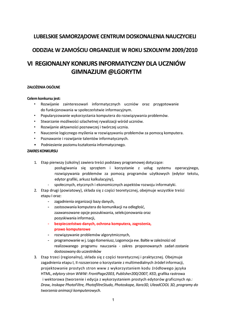 LUBELSKIE SAMORZĄDOWE CENTRUM DOSKONALENIA NAUCZYCIELI ODDZIAŁ W ZAMOŚCIU ORGANIZUJE W ROKU SZKOLNYM 2009/2010 VI REGIONALNY KONKURS INFORMATYCZNY DLA UCZNIÓW GIMNAZJUM @LGORYTM ZAŁOŻENIA OGÓLNE Celem konkursu jest: • Rozwijanie zainteresowań informatycznych uczniów oraz przygotowanie do funkcjonowania w społeczeństwie informacyjnym. • Popularyzowanie wykorzystania komputera do rozwiązywania problemów. • Stwarzanie możliwości szlachetnej rywalizacji wśród uczniów. • Rozwijanie aktywności poznawczej i twórczej ucznia. • Nauczenie logicznego myślenia w rozwiązywaniu problemów za pomocą komputera. • Poznawanie i rozwijanie talentów informatycznych. • Podniesienie poziomu kształcenia informatycznego. ZAKRES KONKURSU 1. Etap pierwszy (szkolny) zawiera treści podstawy programowej dotyczące: posługiwania się sprzętem i korzystanie z usług systemu operacyjnego, rozwiązywania problemów za pomocą programów użytkowych (edytor tekstu, edytor grafiki, arkusz kalkulacyjny), - społecznych, etycznych i ekonomicznych aspektów rozwoju informatyki. 2. Etap drugi (powiatowy), składa się z części teoretycznej, obejmuje wszystkie treści etapu I oraz: - zagadnienia organizacji bazy danych, - zastosowania komputera do komunikacji na odległość, zaawansowane opcje poszukiwania, selekcjonowania oraz pozyskiwania informacji, - bezpieczeństwo danych, ochrona komputera, zagrożenia, prawo komputerowe - rozwiązywanie problemów algorytmicznych, - programowanie w j. Logo Komeniusz, Logomocja ew. Baltie w zależności od realizowanego programu nauczania - zakres proponowanych zadań zostanie dostosowany do uczestników 3. Etap trzeci (regionalny), składa się z części teoretycznej i praktycznej. Obejmuje zagadnienia etapu I, II rozszerzone o korzystanie z multimedialnych źródeł informacji, projektowanie prostych stron www z wykorzystaniem kodu źródłowego języka HTML, edytory stron WWW: FrontPage2003, Publisher200/2007, KED, grafika rastrowa i wektorowa (tworzenie i edycja z wykorzystaniem prostych edytorów graficznych np.: Draw, Inskape PhotoFiltre, PhotofiltreStudo, Photoskape, Xara3D, UleadCOOL 3D, programy do tworzenia animacji komputerowych. 1 ORGANIZACJA KONKURSU 1. W konkursie biorą udział uczniowie gimnazjów powiatów: Biłgoraj, Hrubieszów, Tomaszów, Zamość. 2. Konkurs przebiega w trzech etapach. • • • Etap szkolny Etap powiatowy Etap regionalny ZASADY KONKURSU 1. Eliminacje szkolne do etapu powiatowego przeprowadzają nauczyciele informatyki (nauczyciel sam tworzy zestaw zadań konkursowych) - wybierając maksymalnie 4 uczniów ze szkoły. 2. Eliminacje powiatowe i regionalne przeprowadza komisja powołana przez Kierownika LSCDN - Oddział w Zamościu. 3. Do etapu regionalnego przechodzą uczniowie, którzy zdobyli co najmniej 80% możliwych do uzyskania punktów. 4. Laureatami konkursu zostają uczniowie, którzy w konkursie regionalnym zdobyli łącznie z części teoretycznej i praktycznej 80% punktów. 5. Finaliści konkursu otrzymują dyplomy, laureaci - dyplomy i nagrody. 6. Komisja konkursowa zastrzega sobie prawo do weryfikacji prac konkursowych w przypadku nie uzyskania przez żadnego z uczestników II i III etapu wymaganej ilości punktów. 7. Protokoły konkursu wraz z pracami uczniów, którzy zakwalifikowali się do III etapu zostają przesłane do Komisji Regionalnej w LSCDN w Zamościu. TERMINY KONKURSU 1. Eliminacje szkolne - zgłoszenia uczestników należy dokonać do 15 lutego 2010 r. przesyłając kartę zgłoszenia drogą elektroniczną do przewodniczącego komisji konkursowej etapu powiatowego. 2. Etap powiatowy: termin zostanie podany na stronie www (marzec 2010) 3. Etap regionalny (finał konkursu) - termin zostanie podany na stronie www (kwiecień 2010) 4. Miejsca konkursów zostaną podane w stosownym terminie na stronie internetowej LSCDN w Zamościu. PRZEBIEG KONKURSU ETAP POWIATOWY (część teoretyczna): • • • Test Czas - 45 minut ETAP REGIONALNY (część praktyczna i teoretyczna) • Uczeń wykonuje zadania praktyczne na komputerze typu IBM PC w opraciu o oprogramowanie: pakiet MS OFFICE 2003/2007, FrontPage2003, KED, Logo Komeniusz, Logomocja, Baltie, programy graficzne. • Czas - 90 minut (część teoretyczna - 45 minut, część praktyczna - 45 minut). • Pomiędzy częścią teoretyczną a praktyczną przewidywana jest przerwa 20 minut. OCENA: 2 • Prace oceniane będą przez Komisję Konkursową. • Ocenie podlegać będą: poprawność rozwiązań, pomysłowość, oryginalność. Informacja o wynikach etapu powiatowego. • • Informacje o finalistach zostaną opublikowane na stronie LSCDN po eliminacjach konkursowych. Pozostali uczestnicy mogą uzyskać informacje u przewodniczących rejonowych komisji konkursowych. Do zadań komisji należy: • • • przygotowanie zadań konkursowych, czuwanie nad prawidłowym przebiegiem konkursu, ustalenie listy finalistów, osób wyróżnionych, podsumowanie konkursu. Literatura: 1. Praca zbiorowa: Zbiór zadań z informatyki dla ucznia gimnazjum, wyd. WODN, 2004 2. G. Koba - Informatyka. Podstawowe tematy nie tylko dla gimnazjum, PWN. 3. B. Kwaśny, A. Szymczak, M. Wiłun - Informatyka w ćwiczeniach, PWN. (Batlie) 4. M. Mordaka, J. Lipski, M. Gulgowski - Informatyka 2000. CZARNY KRUK 5. B. Bogucka - Zbiór zadań z informatyki, MIKOM. 6. M. Luliński - Zadania konkursowe z informatyki, MIKOM. 7. Praca zbiorowa, Konkursy informatyczne 2005-2006, WODN Zamość, 2006. 8. Strona www WSZPWN - zagadnienia dotyczące programowania z wykorzystaniem j. Batlie. Oraz inna literatura dostępna i preferowana przez nauczyciela a dotycząca treści konkursu oraz specyfiki pracy w wybranych aplikacjach! Serdecznie zapraszamy wszystkich chętnych do uczestnictwa w konkursie! 3