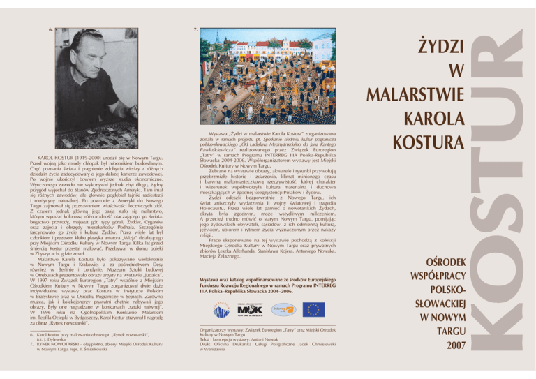 KAROL KOSTUR [1919-2000] urodził się w Nowym Targu. Przed wojną jako młody chłopak był robotnikiem budowlanym. Chęć poznania świata i pragnienie zdobycia wiedzy z różnych dziedzin życia zadecydowały o jego dalszej karierze zawodowej. Po wojnie ukończył bowiem wyższe studia ekonomiczne. Wyuczonego zawodu nie wykonywał jednak zbyt długo, żądny przygód wyjechał do Stanów Zjednoczonych Ameryki. Tam imał się różnych zawodów, ale głównie pogłębiał tajniki radiestezji i medycyny naturalnej. Po powrocie z Ameryki do Nowego Targu zajmował się poznawaniem właściwości leczniczych ziół. Z czasem jednak główną jego pasją stało się malarstwo, którym wyrażał kolorową różnorodność otaczającego go świata: bogactwo przyrody, majestat gór, typy górali, Żydów, Cyganów oraz zajęcia i obrzędy mieszkańców Podhala. Szczególnie fascynowało go życie i kultura Żydów. Przez wiele lat był członkiem i prezesem klubu plastyka amatora „Wizja” działającego przy Miejskim Ośrodku Kultury w Nowym Targu. Kilka lat przed śmiercią Kostur przestał malować. Przebywał w domu opieki w Zbyszycach, gdzie zmarł. Malarstwo Karola Kostura było pokazywane wielokrotnie w Nowym Targu i Krakowie, a za pośrednictwem Desy również w Berlinie i Londynie. Muzeum Sztuki Ludowej w Otrębusach prezentowało obrazy artysty na wystawie „Judaica”. W 1997 roku Związek Euroregion „Tatry” wspólnie z Miejskim Ośrodkiem Kultury w Nowym Targu zorganizował dwie duże indywidualne wystawy prac Kostura w Instytucie Polskim w Bratysławie oraz w Ośrodku Pogranicze w Sejnach. Zarówno muzea, jak i kolekcjonerzy prywatni chętnie nabywali jego obrazy. Były one nagradzane w konkursach „sztuki naiwnej”. W 1996 roku na Ogólnopolskim Konkursie Malarskim im. Teofila Ociepki w Bydgoszczy, Karol Kostur otrzymał I nagrodę za obraz „Rynek nowotarski”. 6. Karol Kostur przy malowaniu obrazu pt. „Rynek nowotarski”, fot. J. Dylewska 7. RYNEK NOWOTARSKI – olej/płótno, zbiory: Miejski Ośrodek Kultury w Nowym Targu, repr. T. Śmiałkowski 7. Wystawa „Żydzi w malarstwie Karola Kostura” zorganizowana została w ramach projektu pt. Spotkanie siedmiu kultur pogranicza polsko-słowackiego „Od Ladislava Mednyánszkého do Jana Kantego Pawluśkiewicza” realizowanego przez Związek Euroregion „Tatry” w ramach Programu INTERREG IIIA Polska-Republika Słowacka 2004-2006. Współorganizatorem wystawy jest Miejski Ośrodek Kultury w Nowym Targu. Zebrane na wystawie obrazy, akwarele i rysunki przywołują przebrzmiałe historie i zdarzenia, klimat minionego czasu i barwną małomiasteczkową rzeczywistość, której charakter i wizerunek współtworzyła kultura materialna i duchowa mieszkających w zgodnej koegzystencji Polaków i Żydów. Żydzi odeszli bezpowrotnie z Nowego Targu, ich świat zniszczyły wydarzenia II wojny światowej i tragedia Holocaustu. Przez wiele lat pamięć o nowotarskich Żydach, okryta była zgodnym, może wstydliwym milczeniem. A przecież trudno mówić o starym Nowym Targu, pomijając jego żydowskich obywateli, sąsiadów, z ich odmienną kulturą, językiem, ubiorem i rytmem życia wyznaczonym przez nakazy religii. Prace eksponowane na tej wystawie pochodzą z kolekcji Miejskiego Ośrodka Kultury w Nowym Targu oraz prywatnych zbiorów Leszka Allerhanda, Stanisława Kojera, Antoniego Nowaka, Macieja Żelaznego. Wystawa oraz katalog współfinansowane ze środków Europejskiego Funduszu Rozwoju Regionalnego w ramach Programu INTERREG IIIA Polska–Republika Słowacka 2004–2006. Organizatorzy wystawy: Związek Euroregion „Tatry” oraz Miejski Ośrodek Kultury w Nowym Targu Tekst i koncepcja wystawy: Antoni Nowak Druk: Oficyna Drukarska Usługi Poligraficzne Jacek Chmielewski w Warszawie KOSTUR 6. ŻYDZI W MALARSTWIE KAROLA KOSTURA OŚRODEK WSPÓŁPRACY POLSKOSŁOWACKIEJ W NOWYM TARGU 2007 Wystawa „Żydzi w malarstwie Karola Kostura”, nowotarskiego malarza naiwnego, jest próbą pokazania wizerunku miasteczek polskich, jakich już nie ma, w których pejzaż wpisana była społeczność żydowska. Artysta odtwarza w swoich obrazach ludzi i zdarzenia z minionych lat, jakie utrwaliły się w jego pamięci i wyobraźni. Malarstwo Karola Kostura, jak trafnie zauważa Aleksander Jackowski1, to: świat jakby z oddali widziany, ludzie zajęci krzątaniem się, każdy z osobna /…/ gdzie artysta maluje to, co wie, a nie co widzi. Postaci dalszego planu rysują się równie wyraźnie jak bliskiego. Ale już wzrok nasz przeskakuje na przejmującą piękną scenę, w której Żydzi krążą dookoła synagogi, na horyzoncie rozczapierzone gałęzie drzew, akcentujące rytm symetrycznego układu kompozycji. Nie wiem, czy to tylko wiedza o tym co się stało, ale w scenie tej czuję ciszę śmierci – minionego czasu. Szczególną wymowę posiadają portrety: zarówno te indywidualne, jak i grupowe – gwasze i obrazy olejne, niekiedy z krajobrazem lub detalem architektonicznym w tle. Na uwagę zasługują portrety: „Dawid Grassgrün”, „Żyd w tałesie”, „Cadyk z uczniami”, „Rabin”. Kostur chętnie maluje różne sceny rodzajowe stanowiące swoisty dokument etnologiczny i architektoniczny. To jakby zatrzymane w kadrze wydarzenia z odległej przeszłości, które zaskakują powtarzalnością formy i treści oraz podobieństwem licznie występujących tam postaci. Ten swoisty teatr losu ludzkiego, w którym Żydzi, mężczyźni, starcy, kobiety i dzieci wydają się patrzeć prosto na nas i mówić o sprawach codziennych, a zarazem o ludzkiej egzystencji przypomina prozę życia Szai Ajzensztoka, tytułowego bohatera wiersza Jana Kasprowicza: 1. 3. 4. 2. Lat może dziesięć przesiedział Na nowotarskim szlabanie I czekał, zbierając myto, Na Pańskie zmiłowanie. Pan będzie łaskaw na niego, Pobłogosławi mu pracę, Pozwoli mu w Jeruzalem Zjeść wielkanocną macę. Do najciekawszych przedstawień należy cykl 
