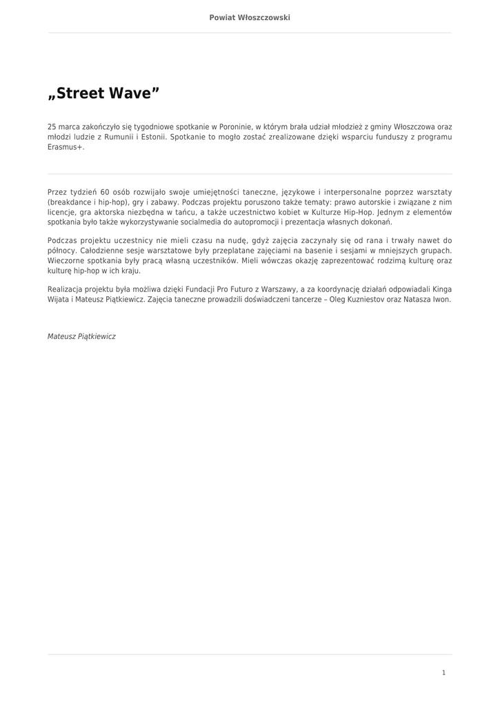 Powiat Włoszczowski „Street Wave” 25 marca zakończyło się tygodniowe spotkanie w Poroninie, w którym brała udział młodzież z gminy Włoszczowa oraz młodzi ludzie z Rumunii i Estonii. Spotkanie to mogło zostać zrealizowane dzięki wsparciu funduszy z programu Erasmus+. Przez tydzień 60 osób rozwijało swoje umiejętności taneczne, językowe i interpersonalne poprzez warsztaty (breakdance i hip-hop), gry i zabawy. Podczas projektu poruszono także tematy: prawo autorskie i związane z nim licencje, gra aktorska niezbędna w tańcu, a także uczestnictwo kobiet w Kulturze Hip-Hop. Jednym z elementów spotkania było także wykorzystywanie socialmedia do autopromocji i prezentacja własnych dokonań. Podczas projektu uczestnicy nie mieli czasu na nudę, gdyż zajęcia zaczynały się od rana i trwały nawet do północy. Całodzienne sesje warsztatowe były przeplatane zajęciami na basenie i sesjami w mniejszych grupach. Wieczorne spotkania były pracą własną uczestników. Mieli wówczas okazję zaprezentować rodzimą kulturę oraz kulturę hip-hop w ich kraju. Realizacja projektu była możliwa dzięki Fundacji Pro Futuro z Warszawy, a za koordynację działań odpowiadali Kinga Wijata i Mateusz Piątkiewicz. Zajęcia taneczne prowadzili doświadczeni tancerze – Oleg Kuzniestov oraz Natasza Iwon. Mateusz Piątkiewicz 1