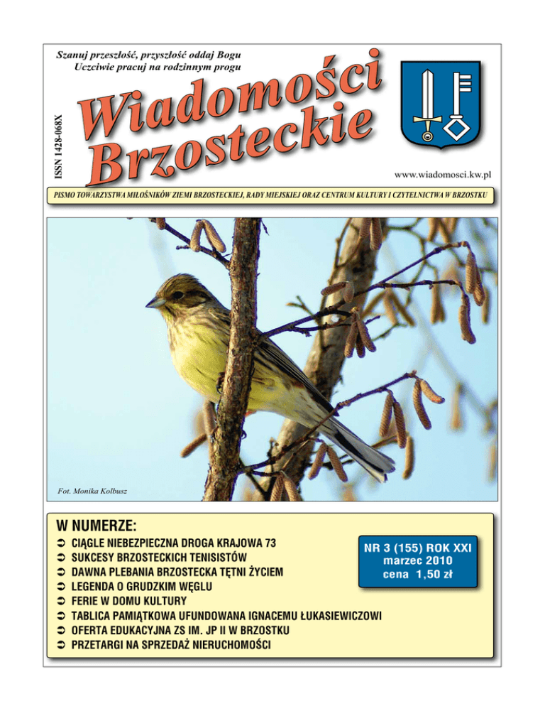 i c ś o m o d a Wi steckie o z r B ISSN 1428-068X Szanuj przeszłość, przyszłość oddaj Bogu Uczciwie pracuj na rodzinnym progu www.wiadomosci.kw.pl PISMO TOWARZYSTWA MIŁOŚNIKÓW ZIEMI BRZOSTECKIEJ, RADY MIEJSKIEJ ORAZ CENTRUM KULTURY I CZYTELNICTWA W BRZOSTKU Fot. Monika Kolbusz W NUMERZE: Ciągle niebezpieczna droga krajowa 73 NR 3 (155) ROK XXI Sukcesy brzosteckich tenisistów marzec 2010 Dawna plebania brzostecka tętni życiem cena 1,50 zł LEGENDA O GRUDZKIM WĘGLU Ferie w Domu Kultury Tablica pamiątkowa ufundowana Ignacemu Łukasiewiczowi Oferta edukacyjna ZS im. JP II w Brzostku PRZETARGI NA SPRZEDAŻ NIERUCHOMOŚCI 2 WIADOMOŚCI BRZOSTECKIE Ferie w Domu Kultury Fot. M. Król, J. Nosal Największym powodzeniem cieszyły się zajęcia taneczne Mali amatorzy zabawy w teatr trzy razy w tygodniu mogli atrakcyjnie spędzać wolny czas na scenie Można było także spędzić czas przy różnych grach i zabawach Prawdziwą atrakcją dla najmłodszych był program rozrywkowy pt. „Czarodziejka i czarny kot” WIADOMOŚCI BRZOSTECKIE Ferie w Domu Kultury czasie tegorocznych zimowych ferii w brzosteckim domu kultury, jak W zwykle było wyjątkowo rojno i gwarno. Dom kultury tradycyjnie starał się zagospodarować czas wszystkim, którzy na feriach pozostali w mieście. Dla tych którzy szukali przede wszystkim rekreacji i zabawy w gronie swych rówieśników, codziennie od rana do wieczora (również w soboty i niedziele) czynne były klub i świetlica, gdzie można było pograć w bilarda, darta, na stole hokejowym - gra w tzw. cymbergaja, czy też w grę świetlicową pod nazwą „Piłkarzyki”, a także w różne planszowe gry i zabawy świetlicowe. Dla miłośników gier komputerowych codziennie od godz. południowych do wieczornych udostępniono komputery w Centrum Kształcenia na Odległość. Starano się również zagospodarować czas wolny amatorom różnorodnych kółek zainteresowań. Znowu, jak zawsze, największym powodzeniem cieszyły się zajęcia taneczne prowadzone w sposób profesjonalny przez instruktora tańca z Jasła Adama Berkowicza oraz jego syna. Tu około 20 osób - w większości uczniów z gimnazjum oraz dzieci ze szkoły podstawowej uczyło się tańca towarzyskiego i współczesnego. Dzieci lubiące rysować i malować mogły kształcić swe umiejętności na zajęciach plastycznych prowadzonych codziennie w godzinach dopołudniowych przez instruktora Rafała Szczygła. Natomiast mali amatorzy zabawy w teatr trzy razy w tygodniu mogli atrakcyjnie spędzać wolny czas na scenie, gdzie dawali upust swej wyobraźni bawiąc się w różne gry i zabawy ruchowe. A także wspólnie tworzyli nowe bajki, prze- Ciągle niebezpieczna droga krajowa 73 3 bierając się w różnorakie baśniowe stroje. W czasie tych zabaw zrodził się pomysł przedstawienia bajek na wesoło. W ten sposób powstała współczesna, wesoła wersja bajki o Czerwonym Kapturku, przy której dzieci znakomicie się bawiły. Zaś fani ćwiczeń siłowych mogli wyrabiać swą tężyznę dwa razy w tygodniu na siłowni pod okiem nauczyciela wychowania fizycznego i instruktora - Piotra Sieńkowskiego. Prawdziwą atrakcją dla najmłodszych był program rozrywkowy pt. „Czarodziejka i czarny kot” prowadzony przez zawodowych artystów-aktorów z Agencji Artystycznej „Fama” z Dębicy. Wszystkie zajęcia i propozycje dla dzieci i młodzieży uczącej się były nieodpłatne. Skorzystało z nich wielu uczniów, którzy z różnych względów nie mogli wyjechać na zorganizowane zimowe wakacje. E.M. Od ówczesnego pisma minęło kilkanaście miesięcy, na poboczu pojawił się kolejny krzyż, po jednym z wypadków nie ma już kapliczki, która miała być przeniesiona w związku z przebudową drogi i odbyło się roku na rok, na drodze krajowej nr 73, procedur,… i.t.p. i.t.d. (więcej o tym w kolejne (ciekawe ile ich jeszcze musi być) rośnie zła sława zakrętu w Kamienicy grudniowym artykule Wiadomości Brzo- spotkanie z przedstawicielami GDDKiA. Dolnej. Przybywa też krzyży na poboczu steckich z 2008 roku). Był w tym piśmie 23 lutego na drogę krajową 73, a potem i domów, w których kogoś już nie ma, bo też taki fragment: „W poruszonej na spo- do Urzędu Miejskiego w Brzostku przyjezostał na tym zakręcie. Rośnie też frustra- tkaniu kwestii przebudowy mostu przez chali pracownicy GDDKiA, policjanci Kocja ludzi, którzy z racji swojego zawodu, rzekę Kamienica w m. Kamienica Dolna mendy Wojewódzkiej, Powiatowej i Brzoalbo miejsca zamieszkania, muszą kilka informujemy, że w ramach robót plano- steckiej, Przewodnicząca Rady Miejskiej razy w roku przeżywać tę samą sekwencję wanych na rok 2010 wykonana zostanie Zofia Skórska, Zastępca Przewodniczącej zdarzeń: deszcz – wyRady Miejskiej Mapadek – straż, pogorian Ptaszek – inicjator towie, policja – kolejtego spotkania, sołtys na wzmianka w meKamienicy Dolnej Padiach – kolejny krzyż weł Machaj, mieszkaza rowem. Pomimo niec Kamienicy Dolpowtarzającego się ciąnej Adam Oszkandy, gle schematu, nikt z przedstawiciele memieszkańców Kamienidiów, oraz Burmistrz cy Dolnej nie przyzwyBrzostku Leszek Bieczaił się do tego i na niek z pracownikami szczęście ciągle wyraurzędu. W protokole z żają oni swoją niezgotego spotkania zapisadę na wypadki, powtano działania, które zorzające się na tej krajostaną podjęte: wej drodze od lat. Było 1.Gmina Brzostek zajuż wiele pism, spotkań deklarowała sfinansoi propozycji w tej sprawanie zakupu i montawie, jednak nie wywożu dwóch masztów fołały one specjalnego toradaru. wrażenia na zarządcy 2.W miejsce istniejątej drogi, czyli GDDcych tablic prowadząKiA – Generalnej Dycych U-3A (biało-czerrekcji Dróg Krajowych wonych tzw. sierżani Autostrad. Można na- Burmistrz Leszek Bieniek przekonuje przedstawicieli GDDKiA o potrze- tów) zamontowane zowet powiedzieć, że te bie zainstalowania fotoradaru i przebudowy tego odcinka (fot. J. Grajcar) 