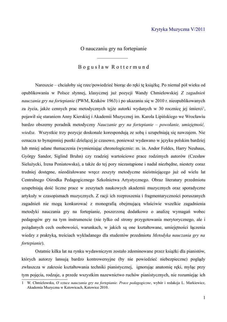 Krytyka Muzyczna V/2011 O nauczaniu gry na fortepianie Bogusław Rottermund Nareszcie – chciałoby się rzec/powiedzieć biorąc do ręki tę książkę. Po niemal pół wieku od opublikowania w Polsce słynnej, klasycznej już pozycji Wandy Chmielowskiej Z zagadnień nauczania gry na fortepianie (PWM, Kraków 1963) i po ukazaniu się w 2010 r. nieopublikowanych za życia, jakże cennych prac metodycznych tejże autorki wydanych w 30 rocznicę jej śmierci 1, pojawił się staraniem Anny Kierskiej i Akademii Muzycznej im. Karola Lipińskiego we Wrocławiu bardzo obszerny poradnik metodyczny Nauczanie gry na fortepianie – powołanie, umiejętność, wiedza. Wszystkie trzy pozycje doskonale korespondują ze sobą i uzupełniają się nawzajem. Nie oznacza to bynajmniej pustki dzielącej je czasowo, ponieważ wydawano w języku polskim bardziej lub mniej udane tłumaczenia (wymieniając chronologicznie: m. in. Andor Foldes, Harry Neuhaus, György Sandor, Siglind Bruhn) czy rzadziej wartościowe prace rodzimych autorów (Czesław Sielużycki, Irena Poniatowska), a także do tej pory niezastąpione i nadal niezbędne, niestety coraz trudniej dostępne, nieodżałowane wręcz zeszyty metodyczne nieistniejącego już od wielu lat Centralnego Ośrodka Pedagogicznego Szkolnictwa Artystycznego. Obraz literatury przedmiotu uzupełniają dość liczne prace w zeszytach naukowych akademii muzycznych oraz sporadyczne artykuły w czasopismach muzycznych. Z racji ich rozproszenia i fragmentaryczności poruszanych zagadnień nie mogą konkurować z monografią obejmującą właściwie wszelkie zagadnienia metodyki nauczania gry na fortepianie, poszerzoną dodatkowo o analizę wymagań wobec pedagogów gry na tym instrumencie (nie tylko od strony przygotowania merytorycznego, ale i pożądanych cech osobowości, warunkach, w jakich są one kształtowane, umiejętności łączenia wiedzy z praktyką, treściach wykładanego dla studentów przedmiotu Metodyka nauczania gry na fortepianie). Ostatnie kilka lat na rynku wydawniczym zostało zdominowane przez książki dla pianistów, których autorzy lansują bardzo kontrowersyjne (by nie powiedzieć niebezpieczne) poglądy zwłaszcza w zakresie kształtowania techniki pianistycznej, ignorując anatomię ręki, myląc przy tym pojęcia, rodzaje, a przede wszystkim nazewnictwo ruchów pianistycznych, nie rozumiejąc ich 1 W. Chmielowska, O sztuce nauczania gry na fortepianie. Prace pedagogiczne, wybór i redakcja L. Markiewicz, Akademia Muzyczna w Katowicach, Katowice 2010. 1 Krytyka Muzyczna V/2011 fizjologii, co nie przeszkadza im nieustanne odwoływać się do powyższego. Ponieważ historyczny spór o to, czy należy grać palcami czy „ciężarrem” (jak mawiał Józef Śliwiński) został już dawno definitywnie rozstrzygnięty na na korzyść uniwersalnej techniki palcowo-ramieniowej, modne stało się promowanie „trzeciej drogi” (czytaj: drogi prowadzącej donikąd), mianowicie „zadrapywania klawisza koniuszkiem palca, jego chwytliwym czubkiem.” Autorzy tego sposobu ignorują cały dorobek metodyki XX wieku, nie analizują gry wielkich pianistów utrwalonej w coraz bardziej dostępnych nagraniach wideofonicznych (zwolniony podgląd, tzw. Zeitlupe, rozwiewa wątpliwości i złudzenia – jeśli ktoś je jeszcze posiada – co do ruchów palców i rąk). Powołują się za to na niepewne, amatorskie świadectwa dotyczące gry samego Liszta oraz najbardziej typowy ruch ręki – chwytny, „zapominając” przy okazji, że praczłowiek zszedł z drzewa kilka milionów lat temu, a gra na fortepianie jest zestrojem wielu złożonych ruchów oraz ich właściwą koordynacją w czasie, przestrzeni/kierunku i ciężarze/sile, pomijając oczywiście całą sferę psyche. Dobrze więc, że Anna Kierska rozprawia się w rozdziale 11 (Kształtowanie aparatu gry – praca nad techniką) dyskretnie i taktownie z tym mitem wspierając się przy tym o autorytet H. Neuhausa (s. 114) oraz Lwa Barenboima (s. 148, a także s. 152 w rozdziale 12 Korekta aparatu gry). Zalet jej praca ma jeszcze wiele, ponieważ została przygotowana na wysokim poziomie merytorycznym i edytorskim, jest udokumentowana licznymi przykładami nutowymi, ikonografią i cytatami. Kilkudziesięcioletnie doświadczenie autorki w pracy na wszystkich szczeblach szkolnictwa muzycznego oraz w prowadzeniu przedmiotu Metodyka dla studentów pianistyki, skrupulatność autorki, logiczność wywodów i argumentacji zostały wsparte przejrzystym układem książki pozwalającym na jej wybiórcze czytanie, gdyż łatwo odnaleźć interesujący czytelnika w danym momencie temat czy zagadnienie. Bezcenna wydaje się „homeopatyczność” publikacji, bowiem autorka z jednej strony w sposób syntetyczny traktuje poruszaną problematykę, z drugiej wnikliwie analizuje ją z różnych punktów widzenia, w tym także własnego. Analitycznosyntetyczny zmysł A. Kierskiej pozwala jej na głębokie, wnikliwe i trafne ujęcie prezentowanych zagadnień. Mimo zwięzłości wykładu (a książka liczy i tak niemal 350 stron), poruszane są wszelkie możliwe aspekty nauczania gry na fortepianie (także psychologiczne – szeroko potraktowane, pedagogiczne a nawet uwarunkowania kulturowe) w sposób wyczerpujący i satysfakcjonujący, choć np. tzw. metodzie beznutowej nie poświęcono osobnego rozdziału. Uwadze autorki nie uszły stosunkowo rzadko opisywane tematy, jak znaczenie tłumików w kształtowaniu dźwięku, samoocena nauczyciela, a także elementy kształcenia słuchu w pedagogice pianistycznej. Znalazło się także miejsce na grę zespołową, a nawet fortepian obowiązkowy (dla niepianistów). 2 Krytyka Muzyczna V/2011 Nie oznacza to, że w pracy nie występują żadne niedociągnięcia czy niedopowiedzenia. W rozdziale 17 Pamięć zabrakło piątego jej typu, nie opisywanego w klasycznej literaturze przedmiotu, na szczęście coraz częściej docenianego, bo przecież fundamentalnego dla muzyka 