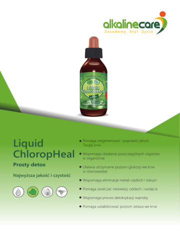 Zasadowy Liquid ChloropHeal Prosty detox Najwyższa jakość i czystość Styl Życia Pomaga zregenerować i poprawić jakość Twojej krwi Wspomaga działanie poszczególnych organów w organizmie Ułatwia utrzymanie poziom glukozy we krwi w równowadze Wspomaga eliminacje metali ciężkich i toksyn Pomaga zwalczać nieświeży oddech i wzdęcia Wspomaga proces detoksykacji wątroby Pomaga ustabilizować poziom żelaza we krwi naturalnego chlorofilu Ingredients:100%Barleygrass(HordeumvulgareL.), Składniki: Avocado(PerseaamericanaMill.),Broccoli (Brassicaoleraceavar.italica),Couchgrass Waga netto: 120 ml (Cynodondactylon(L.)Pers.),Cabbage (BrassicaoleraceaL.varcapitata),Lemon (CitruslimonBF.),Cucumber(Cucumis sativusL.),Lemongrass(Cymbopogon nardusL.Rendle),Wheatgrass(Triticum aestivumL.),FieldHorsetail(Equisetum arvenseL.),Oatgrass(AvenasativaL.), Fennel(FoenuculumvulgareM.),Tomatoe (SolanumlycopersicumL.),Spinach (SpinaciaoleraceaL.),Oregano(Origanum vulgareL.),Parsley(PetroselinumcrispumL.) Pij wodę z kropelkami Liquid Jak stosować?Net weight:40g/220g ChloropHeal. Możesz je także How to take it? Dodaj 15 kropelek chlorofilu (0,75 ml) do szklanki wody (250 ml) dziennie dodawać do soków warzywnych, zimnych warzywnych itisalsopossibletoadd zup lub sałatek. Alkaline16Greensto greenjuices,smoothies, coldveggiesoupsor salads. Takeasachet 1-3timesperday inaglass of water. 1-3 Takeascoop 1-3timesperday inaglass of water. 1-3 Dodaj 5 kropelek chlorofilu (0,25 ml) do szklanki Zielonego Koktajlu lub soku warzywnego dziennie Alkaline Care S.L. C/Corders,12-20 · 08911 · Badalona (Spain) www.alkalinecare.com / [email protected] Tel. (+34) 93 384 45 02 Zasadowy AF Ficha Alkaline 16 Greens.indd 2 Styl Życia 8/4/16 14:32