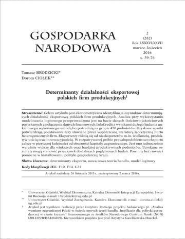 Tomasz Brodzicki, Dorota Ciołek, Determinanty działalności eksportowej polskich firm... Gospodarka narodowa 59 2 (282) Rok LXXXVI/XXVII marzec–kwiecień 2016 s. 59–76 Tomasz BRODZICKI* Dorota CIOŁEK** Determinanty działalności eksportowej polskich firm produkcyjnych1 Streszczenie: Celem artykułu jest ekonometryczna identyfikacja czynników determinujących działalność eksportową polskich firm produkcyjnych. Analiza przy wykorzystaniu modelowania logitowego przeprowadzona jest na bazie danych ilościowo-jakościowych pozyskanych z połączenia danych finansowych InfoCredit z wynikami dużego badania ankietowego wykonanego metodą bezpośrednią na grupie 470 podmiotów. Uzyskane wyniki potwierdzają podstawowe tezy stawiane przez współczesną literaturę teoretyczną nurtu heterogenicznych firm. Eksporterzy różnią się od nieeksporterów m.in. wielkością, produktywnością oraz innowacyjnością. W rozpatrywanej próbie prawdopodobieństwo eksportu zależy w pierwszej kolejności od obecności kapitału zagranicznego. Jest ono jednocześnie wyraźnie wyższe dla większych oraz bardziej produktywnych podmiotów. Uzyskane rezultaty mogą stanowić przyczynek do dalszych pogłębionych badań. Powinny być również pomocne w kształtowaniu polityki gospodarczej kraju. Słowa kluczowe: determinanty eksportu, nowa nowa teoria handlu, model logitowy Kody klasyfikacji JEL: F10, F14, C21 Artykuł nadesłany 26 listopada 2015 r., zaakceptowany 2 marca 2016 r. * ** 1 Uniwersytet Gdański, Wydział Ekonomiczny, Katedra Ekonomiki Integracji Europejskiej, Instytut Rozwoju; e-mail: [email protected] Uniwersytet Gdański, Wydział Zarządzania, Katedra Ekonometrii; e-mail: dorota.ciolek@ ug.edu.pl Artykuł jest wynikiem realizacji przez Instytutu Rozwoju projektu badawczego pt. „Analiza wymiany zagranicznej Polski w świetle nowych teorii handlu. Implikacje dla polityki gospodarczej w czasie kryzysu” finansowanego ze środków Narodowego Centrum Nauki (NCN) (2012/05/B/HS4/04209). Kierownikiem projektu jest prof. Krystyna Gawlikowska-Hueckel. 60 GOSPODARKA NARODOWA nr 2/2016 Wprowadzenie Współczesne badania dotyczące eksportu od ponad dekady koncentrują się przede wszystkim na koncepcji heterogeniczności firm. Dopuszcza ona możliwość jednoczesnego współwystępowania firm eksporterów i firm nieeksporterów w ramach tych samych sektorów [WTO, 2008]. Ze względów poznawczych, jak i z uwagi na potrzebę kształtowania polityki gospodarczej ważne jest, aby właściwie zidentyfikować czynniki, które zwiększają prawdopodobieństwo eksportu. Ze względu na ograniczony dostęp do baz danych liczba badań poświęconych powyższej problematyce w przypadku Polski jest ograniczona. W niniejszym artykule przy wykorzystaniu modelowania logitowego przeprowadzona została ekonometryczna identyfikacja czynników zwiększających prawdopodobieństwo eksportu polskich firm produkcyjnych. Wykorzystano bazę danych ilościowo-jakościowych powstałą z połączenia danych finansowych z InfoCredit oraz przeprowadzonego przez zespół Instytutu Rozwoju dużego badania ankietowego wykonanego metodą bezpośrednią przez wyspecjalizowaną agencję ankietową. Przegląd literatury teoretycznej i empirycznej Nowa nowa teoria handlu podkreśla szczególną rolę firm w wyjaśnieniu intensywności i struktury międzynarodowej wymiany handlowej [Ottaviano, 2010]. Dostęp do danych statystycznych na poziomie mikro – indywidualnych przedsiębiorstw wskazał na ich ogromne zróżnicowanie. Okazało się, iż tylko niewielka liczba przedsiębiorstw wychodzi poza rynki krajowe, rozpoczynając eksport na jeden bądź kilka rynków zagranicznych. Potencjał eksportowy jest jednocześnie silnie skoncentrowany w poszczególnych państwach w grupie największych podmiotów [Mayer, Ottaviano, 2008] przy czym stopień koncentracji eksportu różni się między państwami. Bernard i in. [2007] wskazali, że pomimo różnic między państwami, można zidentyfikować, w ramach analizy porównawczej, pewne prawidłowości w odniesieniu do zachowań firm pochodzących z różnych państw. Wyniki badań empirycznych wskazują, iż spośród eksporterów tylko niewielka część firm eksportuje większość swojej produkcji sprzedanej, nadal koncentrując się przede wszystkim na rynkach rodzimych. Udział firm eksportujących w danym sektorze jest natomiast rosnącą funkcją przewagi komparatywnej sektora. Firmy eksportujące zdecydowanie różnią się od nieeksportujących w wielu płaszczyznach [WTO, 2008]. Nowe wyniki badań empirycznych wymusiły odrzucenia charakterystycznego dla modeli nowej teorii handlu założenia o reprezentatywnej firmie (Krugmana [1979], Krugamana [1980], Krugmana i Brandera [1983])2 na rzecz 2 Modele te bazowały na koncepcji konkurencji monopolistycznej Dixita i Stiglitza [1977] uwzględniającej upodobanie konsumentów do różnorodności ang. love for variety. Tomasz Brodzicki, Dorota Ciołek, Determinanty działalności eksportowej polskich firm... 61 uwzględnienia realnej heterogeniczności. Przełomowe znaczenie dla rozwoju NNTH miał model Melitza [2003], który w swojej strukturze uwzględnił silnie skośny w prawo losowy rozkład produktywności (tzw. rozkład Pareto). Jedynie podmioty, które przekroczą pewien progowy poziom produktywności są w stanie wejść na rynki zagraniczne. Występuje naturalny efekt selekcji firm do eksportu. Większość firm działa tym samym wyłącznie na rynku krajowym, a te z za niskim poziomem produktywności są eliminowane nawet z rynku krajowego (tzw. efekt wypychania rynkowego). Jednocześnie Bernard i in. [2007] wykazali, iż samo rozpoczęcie eksportu nie podnosi produktywności firm (wyższa produktywność poprzedza wejście na rynki zagraniczne, brak efektu uczenia się przez eksport). Eksport na rynki zagraniczne często poprzedza import z zagranicy – proces ten określany jest uczeniem się przez import (ang. lea