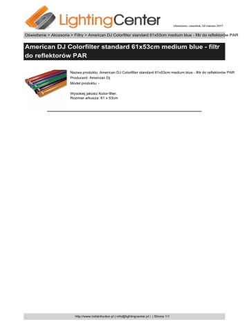 Utworzono: czwartek, 02 marzec 2017 Oświetlenie > Akcesoria > Filtry > American DJ Colorfilter standard 61x53cm medium blue - filtr do reflektorów PAR American DJ Colorfilter standard 61x53cm medium blue - filtr do reflektorów PAR Nazwa produktu: American DJ Colorfilter standard 61x53cm medium blue - filtr do reflektorów PAR Producent: American Dj Model produktu: Wysokiej jakości Kolor-filter. Rozmiar arkusza: 61 x 53cm http://www.lcdistribution.pl | [email protected] | | Strona 1/1
