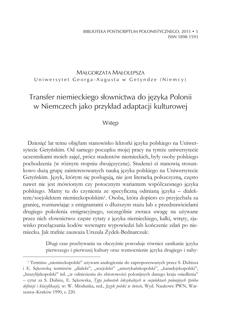 BIBLIOTEKA POSTSCRIPTUM POLONISTYCZNEGO, 2015 • 5 ISSN 1898-1593 MAGORZATA MAOLEPSZA Uniwersytet Georga-Augusta w Getyndze (Niemcy) Transfer niemieckiego sownictwa do jÆzyka Polonii w Niemczech jako przykad adaptacji kulturowej WstÆp Dziesięý lat temu objęâam stanowisko lektorki języka polskiego na Uniwersytecie Getyľskim. Od samego poczĊtku mojej pracy na tymůe uniwersytecie uczestnikami moich zajęý, prócz studentów niemieckich, byây osoby polskiego pochodzenia (w róůnym stopniu dwujęzyczne). Studenci ci stanowiĊ stosunkowo duůĊ grupę zainteresowanych naukĊ języka polskiego na Uniwersytecie Getyľskim. Język, którym się posâugujĊ, nie jest literackĊ polszczyznĊ, często nawet nie jest mówionym czy potocznym wariantem wspóâczesnego języka polskiego. Mamy tu do czynienia ze specyficznĊ odmianĊ języka – dialektem/socjolektem niemieckopolskim1. Osoba, która dopiero co przyjechaâa za granicę, rozmawiajĊc z emigrantami o dâuůszym staůu lub z przedstawicielami drugiego pokolenia emigracyjnego, szczególnie zwraca uwagę na uůywane przez nich sâownictwo: częste cytaty z języka niemieckiego, kalki, wtręty, zjawisko przeâĊczania kodów wewnĊtrz wypowiedzi lub koľczenie zdaľ po niemiecku. Jak trafnie zauwaůa Urszula Ůydek-Bednarczuk: Dâugi czas przebywania na obczyŭnie powoduje równieů zanikanie języka pierwszego i pierwszej kultury oraz wzmocnienie języka drugiego i nabyTerminu „niemieckopolski” uůywam analogicznie do zaproponowanych przez S. Dubisza i E. SękowskĊ terminów „dialekt”, „socjolekt” „amerykaľskopolski”, „kanadyjskopolski”, „brazylijskopolski” itd. „w odniesieniu do zbiorowoœci polonijnych danego kraju osiedlenia” – cytat za S. Dubisz, E. Sękowska, Typy jednostek leksykalnych w socjolektach polonijnych (próba definicji i klasyfikacji), w: W. Miodunka, red., Język polski w œwiecie, Wyd. Naukowe PWN, Warszawa–Kraków 1990, s. 220. 1 166 BIBLIOTEKA POSTSCRIPTUM POLONISTYCZNEGO, 2015 • 5 tej, drugiej kultury. Jeůeli dwa języki wzajemnie na siebie wpâywajĊ, co występuje w przypadku emigrantów/imigrantów lub osób przebywajĊcych za granicĊ, mamy do czynienia z kontaktem językowym. KonsekwencjĊ kontaktu językowego sĊ transfer pozytywny lub negatywny, interferencja, zapoůyczenia, kalki językowe, przeâĊczanie kodów, interjęzyk […]2. Uůywanie tego wariantu języka przez moich rozmówców poczĊtkowo budziâo moje zdumienie, szczególnie w sytuacjach, gdy zapoůyczenie niemieckie âatwo moůna byâo zastĊpiý polskim odpowiednikiem. To „naszpikowanie języka germanizmami”3 bardzo kâuâo mnie w uszy, wydawaâo mi się nienaturalne i niezrozumiaâe. Myœlę, ůe moje odczucia – „œwieůej” emigrantki – porównaý moůna do odczuý Polaków mieszkajĊcych na staâe w Polsce sâyszĊcych język, którym posâugujĊ się ich rodacy przebywajĊcy dâuůej za granicĊ. W ciĊgu ostatnich dziesięciu lat sama przeszâam przez wszystkie etapy adaptacyjne zwiĊzane z emigracjĊ, przez które takůe przeszli rodzice moich studentów: zanurzenie w języku niemieckim, szok językowy i kulturowy (chociaů w momencie wyjazdu dobrze znaâam juů zarówno język, jak i kulturę niemieckĊ), pogâębienie znajomoœci języka i kultury, poczucie tracenia znajomoœci języka polskiego, wreszcie dwujęzyczne i dwukulturowe funkcjonowanie w ůyciu zawodowym i prywatnym oraz œwiadome uůywanie dialektu niemieckopolskiego w kontaktach prywatnych z innymi przedstawicielami Polonii. Naleůę do bardzo maâej, uprzywilejowanej grupy emigrantów: nauczycieli akademickich – lektorów języka polskiego, która utrzymuje z PolskĊ kontakty zawodowe i para się wâaœnie nauczaniem języka polskiego. Jest on integralnĊ częœciĊ mojej pracy – treœciĊ, formĊ, tworzywem. Dbanie o język, praca nad jego zachowaniem i aktywne posâugiwanie się literackĊ odmianĊ wspóâczesnej polszczyzny jest równoczeœnie mojĊ pasjĊ, obowiĊzkiem i strategiĊ adaptacyjnĊ. Jednak większoœý emigrantów nie ma na to po prostu czasu i wybiera bardziej ekonomiczny w uůyciu dialekt polonijny. Problematyczny jest jednak fakt, iů w zaleůnoœci od zdolnoœci, poziomu wyksztaâcenia, stycznoœci z językiem polskim (radio, telewizja, filmy, internet), częstoœci kontaktów z Polakami w Polsce (prywatnych, zawodowych), wolnego czasu, chęci indywidualnych oraz wielu innych czynników przedU. Ůydek-Bednarczuk, Bilingwizm w badaniach glottodydaktycznych, spoâecznych i kulturowych, w: A. Achtelik, J. Tambor, red., Sztuka czy rzemiosâo? Nauczyý Polski i polskiego, Wyd. Gnome, Katowice 2007, s. 235. 3 M. Warchoâ-Schlottmann, Próba opisu kompetencji językowej w niemieckim i polskim u Polaków w Niemczech – studium socjolingwistyczne, rozprawa doktorska, Uniwersytet Jagielloľski, Kraków 1994, s. 184. 2 MAGORZATA MAOLEPSZA: Transfer niemieckiego sownictwa… 167 stawiciele pierwszego pokolenia emigracyjnego przekazujĊ swoim dzieciom często jedynie polonijny wariant języka polskiego. Nie zdajĊ sobie sprawy z tego, ůe przebywajĊc i pracujĊc dâuůej za granicĊ, z czasem przestajĊ posâugiwaý się ogólnĊ odmianĊ polszczyzny. Jak trafnie zauwaůa Stanisâaw Dubisz: Dla większoœci z nich [przedstawicieli Polonii – M.M.] pojęcie normy polszczyzny ogólnej w praktyce językowej w gruncie rzeczy nie istnieje. RozumiejĊ jĊ tylko ci, których charakteryzuje najbardziej wyrobiona œwiadomoœý i kompetencja językowa […], pozostali zaœ odnoszĊ to pojęcie do znanego im – zgodnie z uzusem lokalno-œrodowiskowym – wariantu językowego4. W publikacjach naukowych znajdziemy analizy dotyczĊce stopnia zachowania czy teů utraty języka polskiego na emigracji i często teů ubolewanie nad jego rozpadem, erozjĊ. Jeœli chodzi o badania języka Polonii niemieckiej, prowadzili je między innymi: Maria Teresa Michalewska w swojej rozprawie habilitacyjnej5, Maâgorzata Warchoâ-S