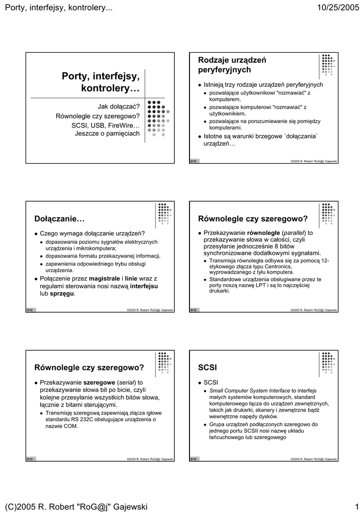 Porty, interfejsy, kontrolery... 10/25/2005 Rodzaje urządzeń peryferyjnych Porty, interfejsy, kontrolery… ! Istnieją trzy rodzaje urządzeń peryferyjnych ! Jak dołączać? Równolegle czy szeregowo? SCSI, USB, FireWire… Jeszcze o pamięciach ! ! ! pozwalające użytkownikowi "rozmawiać" z komputerem, pozwalające komputerowi "rozmawiać" z użytkownikiem, pozwalające na porozumiewanie się pomiędzy komputerami. Istotne są warunki brzegowe `dołączania` urządzeń… 2/12 Dołączanie… ! ! ! ! Równolegle czy szeregowo? Czego wymaga dołączanie urządzeń? ! ! dopasowania poziomu sygnałów elektrycznych urządzenia i mikrokomputera; dopasowania formatu przekazywanej informacji, zapewnienia odpowiedniego trybu obsługi urządzenia. ©2005 R. Robert ‘RoG@j’ Gajewski ! 5/12 ! SCSI ! Transmisję szeregową zapewniają złącza igłowe standardu RS 232C obsługujące urządzenia o nazwie COM. (C)2005 R. Robert "RoG@j" Gajewski ©2005 R. Robert ‘RoG@j’ Gajewski SCSI Przekazywanie szeregowe (serial) to przekazywanie słowa bit po bicie, czyli kolejne przesyłanie wszystkich bitów słowa, łącznie z bitami sterującymi. ©2005 R. Robert ‘RoG@j’ Gajewski Transmisja równoległa odbywa się za pomocą 12stykowego złącza typu Centronics, wyprowadzanego z tyłu komputera. Standardowe urządzenia obsługiwane przez te porty noszą nazwę LPT i są to najczęściej drukarki. 4/12 Równolegle czy szeregowo? ! Przekazywanie równoległe (parallel) to przekazywanie słowa w całości, czyli przesyłanie jednocześnie 8 bitów synchronizowane dodatkowymi sygnałami. ! Połączenie przez magistrale i linie wraz z regułami sterowania nosi nazwą interfejsu lub sprzęgu. 3/12 ! ©2005 R. Robert ‘RoG@j’ Gajewski ! 6/12 Small Computer System Interface to interfejs małych systemów komputerowych, standard komputerowego łącza do urządzeń zewnętrznych, takich jak drukarki, skanery i zewnętrzne bądź wewnętrzne napędy dysków. Grupa urządzeń podłączonych szeregowo do jednego portu SCSII nosi nazwę układu łańcuchowego lub szeregowego ©2005 R. Robert ‘RoG@j’ Gajewski 1 Porty, interfejsy, kontrolery... 10/25/2005 USB ! USB USB ! ! Pod skrótem USB (Universal Serial Bus) kryje się nazwa nowoczesnego standardu uniwersalnej magistrali szeregowej umożliwiającej podłączenie do komputera zewnętrznych urządzeń peryferyjnych. 7/12 ©2005 R. Robert ‘RoG@j’ Gajewski ! 8/12 FireWire ! ! ! IEEE 1394, FireWire lub I-Link, to zewnętrzny interfejs, opracowany w 1986 r. w laboratoriach firmy Apple, za pomocą którego można podłączyć do komputera różne urządzenia peryferyjne. Standard ten umożliwia transmisję danych z szybkością nawet 400 MB/s, co ma zastosowanie głównie przy obróbce dźwięku i obrazu o wysokiej rozdzielczości. 9/12 ©2005 R. Robert ‘RoG@j’ Gajewski ! ! ©2005 R. Robert ‘RoG@j’ Gajewski Pamięci buforowe (cache) Każda komórka pamięci przeznaczona do przechowywania informacji, ma w rzeczywistości miejsce na zapisanie 9 bitów. ! Do pojedynczego portu IEEE 1394 można podłączyć maksymalnie 63 urządzenia zewnętrzne. Potrzebny jest do tego specjalny kabel sześciożyłowy w którego skład wchodzą dwie pary oddzielnie ekranowanych kanałów danych oraz dwa przewody zasilające. 10/12 Kontrola parzystości… ! ©2005 R. Robert ‘RoG@j’ Gajewski FireWire FireWire ! ! ! Układy kontrolujące pracę pamięci zaprogramowane są w ten sposób, że zapisują w komórce zawsze nieparzystą liczbę bitów Jeżeli wszystko działa poprawnie, to w każdej komórce pamięci zawierającej 8 bitów plus 1 bit kontrolny, suma musi być nieparzysta ! Szybkość pobierania lub zapisywania informacje z pamięci decyduje o wydajności Układ pamięci o bardzo krótkim czasie dostępu < 60 ns są na tyle drogie, że nie montuje się ich w komputerach, jako podstawowe pamięci. Stosuje się je do specjalnych pamięci buforowych (cache). ! 11/12 Interfejs ten umożliwia jednoczesne przesyłanie różnego typu informacji (np. danych dla drukarki w czasie realizacji połączenia telefonicznego) nie powodując przy tym wzajemnych zakłóceń (przewód połączeniowy zapewnia przy tym również zasilanie urządzenia). Transmisja odbywa się przy wykorzystaniu różnego, zależnego od specyfikacji danego urządzenia pasma. Jego odpowiednim dostosowaniem zajmuje się zintegrowany z płytą specjalizowany kontroler ©2005 R. Robert ‘RoG@j’ Gajewski (C)2005 R. Robert "RoG@j" Gajewski 12/12 Jest ona umieszczona między procesorem i resztą pamięci RAM, już znacznie wolniejszą. ©2005 R. Robert ‘RoG@j’ Gajewski 2