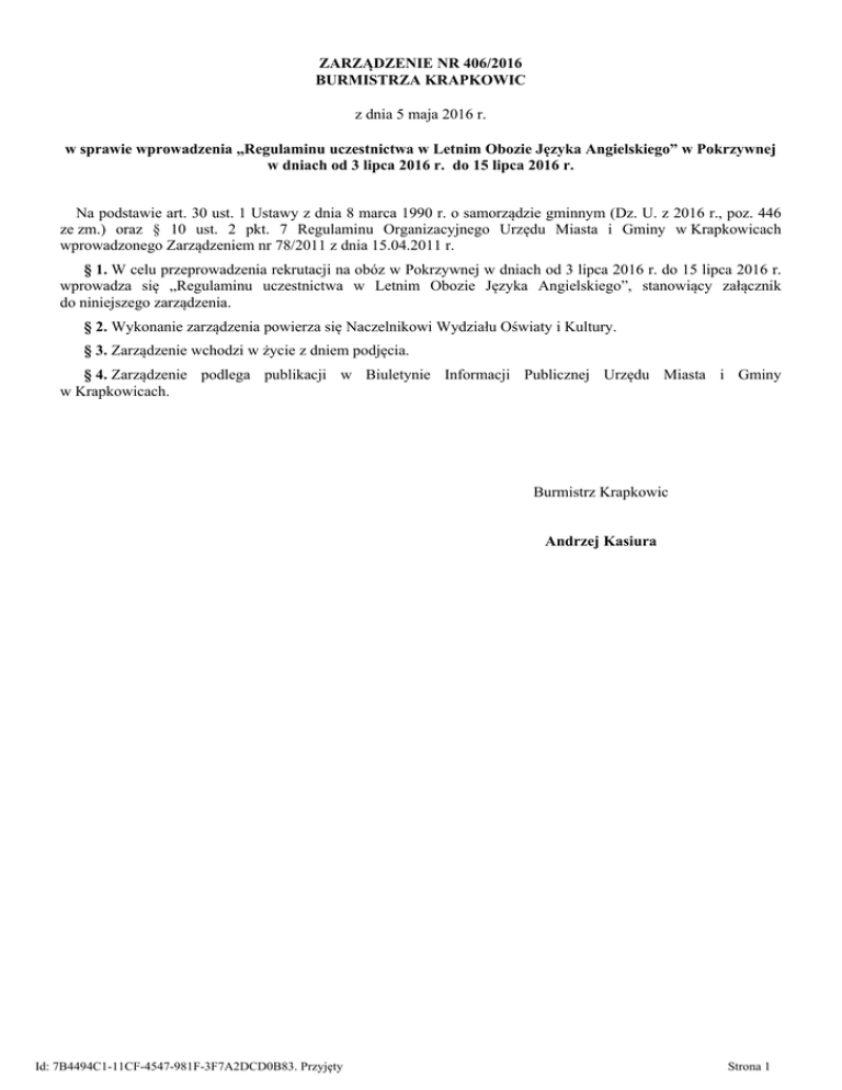 ZARZĄDZENIE NR 406/2016 BURMISTRZA KRAPKOWIC z dnia 5 maja 2016 r. w sprawie wprowadzenia „Regulaminu uczestnictwa w Letnim Obozie Języka Angielskiego” w Pokrzywnej w dniach od 3 lipca 2016 r. do 15 lipca 2016 r. Na podstawie art. 30 ust. 1 Ustawy z dnia 8 marca 1990 r. o samorządzie gminnym (Dz. U. z 2016 r., poz. 446 ze zm.) oraz § 10 ust. 2 pkt. 7 Regulaminu Organizacyjnego Urzędu Miasta i Gminy w Krapkowicach wprowadzonego Zarządzeniem nr 78/2011 z dnia 15.04.2011 r. § 1. W celu przeprowadzenia rekrutacji na obóz w Pokrzywnej w dniach od 3 lipca 2016 r. do 15 lipca 2016 r. wprowadza się „Regulaminu uczestnictwa w Letnim Obozie Języka Angielskiego”, stanowiący załącznik do niniejszego zarządzenia. § 2. Wykonanie zarządzenia powierza się Naczelnikowi Wydziału Oświaty i Kultury. § 3. Zarządzenie wchodzi w życie z dniem podjęcia. § 4. Zarządzenie podlega publikacji w Biuletynie Informacji Publicznej Urzędu Miasta i Gminy w Krapkowicach. Burmistrz Krapkowic Andrzej Kasiura Id: 7B4494C1-11CF-4547-981F-3F7A2DCD0B83. Przyjęty Strona 1 Załącznik do Zarządzenia Nr 406/2016 Burmistrza Krapkowic z dnia 5 maja 2016 r. Regulamin uczestnictwa w Letnim Obozie Języka Angielskiego w Pokrzywnej w dniach od 5 lipca 2015 r. do 17 lipca 2015 r. 1. Koordynatorem Letniego Obozu Języka Angielskiego jest Gmina Krapkowice. Zadanie jest realizowane przez stowarzyszenie Towarzystwo Przyjaciół Krapkowic przy wsparciu realizacji zadania publicznego przez Gminę Krapkowice. 2. Obóz odbędzie się w terminie od 3 lipca 2016 r. do 15 lipca 2016 r. w Pokrzywnej. 3. W czasie obozu zajęcia będą prowadzone przez nauczycieli z partnerskiego miasta Camas w USA. 4. Koszt uczestnictwa w obozie wynosi 980,00 zł od osoby. 5. Gmina Krapkowice dysponuje 20 miejscami na obozie. Kwalifikacji podlegać będą uczniowie w wieku 13-19 lat. W 2016 r. zabezpiecza się 2 miejsca dla uczestników z partnerskich miast. 6. Uczestnikami obozu mogą być mieszkańcy Gminy Krapkowice, osoby zgłoszone przez partnerskie gminy Camas (USA), Wissen (Niemcy), Lipove Lazne (Czechy), Rohatyn (Ukraina). 7. Zgłoszenia pisemne osób chętnych do uczestnictwa w obozie należy przekazać na Karcie Zgłoszeniowej do Wydziału Oświaty i Kultury Urzędu Miasta i Gminy w Krapkowicach, ul. 3 Maja 17, 47-303 Krapkowice, budynek II, pokój nr 19 lub w sekretariatach gimnazjów z terenu Gminy Krapkowice - do dnia 15 czerwca 2016 roku. 8. Kartę zgłoszenia można również przesłać drogą e-mail na adres: [email protected] lub [email protected] z dopiskiem „dot. Obozu językowego –Pokrzywna 2016”. 9. Warunkiem uczestnictwa w obozie jest znajomość języka angielskiego na poziomie średnio zaawansowanym oraz przedłożenie zaświadczenia dyrektora szkoły, do której uczęszcza uczeń, o uzyskaniu pozytywnej oceny z języka angielskiego. 10. W przypadku wolnych miejsc, na obóz zostaną zakwalifikowani również uczniowie z pozostałych gmin Powiatu Krapkowickiego. 11. W przypadku większej ilości chętnych niż liczba wolnych miejsc kwalifikacja uczestników obozu nastąpi w następujący sposób: - osoby z terenu Gminy Krapkowice: decyduje kolejność zgłoszeń; - osoby z terenu Powiatu Krapkowickiego- spoza Gminy Krapkowice: uczestnicy obozu zostaną wyłonienie poprzez losowanie. Losowanie przeprowadzi Komisja powołana przez Naczelnika Wydziału Oświaty i Kultury Urzędu Miasta i Gminy w Krapkowicach . 12. Zakwalifikowani uczestnicy zobowiązani będą do przedstawienia prawidłowo wypełnionej „Karty kwalifikacyjnej”, potwierdzającej dobry stan zdrowia ucznia w terminie do 24 czerwca 2016 r. Id: 7B4494C1-11CF-4547-981F-3F7A2DCD0B83. Przyjęty Strona 1