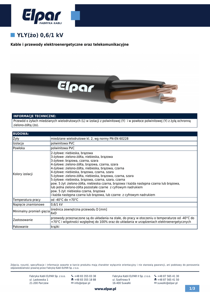 YLY(żo) 0,6/1 kV Kable i przewody elektroenergetyczne oraz telekomunikacyjne INFORMACJE TECHNICZNE: Przewód o żyłach miedzianych wielodrutowych (L) w izolacji z polwinitowej (Y) i w powłoce polwinitowej (Y) z żyłą ochronną zielono-żółtą (żo). BUDOWA: Żyły miedziane wielodrutowe kl. 2, wg normy PN-EN 60228 Izolacja polwinitowa PVC Powłoka polwinitowa PVC Kolory izolacji 2-żyłowe: niebieska, brązowa 3-żyłowe: zielono-żółta, niebieska, brązowa 3-żyłowe: brązowa, czarna, szara 4-żyłowe: zielono-żółta, brązowa, czarna, szara 4-żyłowe: zielono-żółta, niebieska, brązowa, czarna 4-żyłowe: niebieska, brązowa, czarna, szara 5-żyłowe: zielono-żółta, niebieska, brązowa, czarna, szara 5-żyłowe: niebieska, brązowa, czarna, szara, czarna pow. 5 żył: zielono-żółta, niebieska czarna, brązowa i każda następna czarna lub brązowa, lub jedna zielono-żółta pozostałe czarne z cyfrowym nadrukiem pow. 5 żył: niebieska czarna, brązowa i każda następna czarna lub brązowa, lub czarne z cyfrowym nadrukiem Temperatura pracy od -40°C do +70°C Napięcie znamionowe 0,6/1 kV Minimalny promień gięcia średnica zewnętrzna przewodu D [mm] 6xD Zastosowanie przewody przeznaczone są do układania na stałe, do pracy w otoczeniu o temperaturze od -40°C do +70°C i wilgotności względnej do 100% oraz do układania w urządzeniach elektroenergetycznych Pakowanie krążki Zdjęcia, rysunki, specyfikacje i informacje zawarte w karcie produktu mają charakter wyłącznie orientacyjny i nie stanowią gwarancji, ani podstawy do ponoszenia odpowiedzialności prawnej przez Fabrykę Kabli ELPAR Sp. z o.o. Fabryka Kabli ELPAR Sp. z o.o. ul. Laskowska 1 21-200 Parczew +48 83 355 03 38 +48 83 355 18 88 [email protected] Fabryka Kabli ELPAR II Sp. z o.o. ul. Szafirowa 9 16-400 Suwałki +48 87 565 41 30 +48 87 565 41 50 [email protected] 1/3 YLY(żo) 0,6/1 kV Liczba i przekrój znamionowy żył [n x mm2] Przybliżona średnica zewnętrzna przewodu [mm] Orientacyjna masa przewodu [kg/km] 1x1 5,4 40 1 x 1,5 5,6 48 1 x 2,5 6,1 60 1x4 6,8 83 1x6 7,3 105 1 x 10 8,7 160 1 x 16 9,7 225 1 x 25 11,3 325 1 x 35 12,5 425 1 x 50 13,8 550 1 x 70 15,3 750 1 x 95 17,5 1030 1 x 120 18,8 1270 1 x 150 21,0 1580 1 x 185 22,8 1920 1 x 240 25,8 2470 2x1 8,3 93 2 x 1,5 8,8 110 2 x 2,5 9,8 144 2x4 11,2 205 2x6 12,2 260 2 x 10 15,2 405 2 x 16 16,8 550 3x1 8,8 109 3 x 1,5 9,4 135 3 x 2,5 10,4 175 3x4 11,9 250 3x6 13,2 325 3 x 10 16,1 505 4x1 18,0 712 4 x 1,5 10,2 159 4 x 2,5 11,4 214 4x4 13,3 312 4x6 14,4 408 4 x 10 17,7 635 4 x 16 20,9 1005 4 x 25 24,8 1450 4 x 35 27,7 1930 4 x 50 30,8 2490 5x1 10,4 155 5 x 1,5 11,0 192 5 x 2,5 12,4 260 5x4 14,5 375 5x6 15,8 494 5 x 10 18,9 748 Zdjęcia, rysunki, specyfikacje i informacje zawarte w karcie produktu mają charakter wyłącznie orientacyjny i nie stanowią gwarancji, ani podstawy do ponoszenia odpowiedzialności prawnej przez Fabrykę Kabli ELPAR Sp. z o.o. Fabryka Kabli ELPAR Sp. z o.o. ul. Laskowska 1 21-200 Parczew +48 83 355 03 38 +48 83 355 18 88 [email protected] Fabryka Kabli ELPAR II Sp. z o.o. ul. Szafirowa 9 16-400 Suwałki +48 87 565 41 30 +48 87 565 41 50 [email protected] 2/3 5 x 16 22,8 1198 5 x 25 27,4 1774 5 x 35 30,5 2346 5 x 50 33,9 3032 5 x 70 37,8 4076 7x1 11,2 188 7 x 1,5 12,0 235 7 x 2,5 13,6 328 7x4 15,8 470 7x6 17,2 628 7 x 10 21,3 989 10 x 1 14,0 285 10 x 1,5 15,3 360 10 x 2,5 17,2 498 10 x 4 20,1 714 10 x 6 22,0 945 10 x 10 27,5 1510 Zdjęcia, rysunki, specyfikacje i informacje zawarte w karcie produktu mają charakter wyłącznie orientacyjny i nie stanowią gwarancji, ani podstawy do ponoszenia odpowiedzialności prawnej przez Fabrykę Kabli ELPAR Sp. z o.o. Fabryka Kabli ELPAR Sp. z o.o. ul. Laskowska 1 21-200 Parczew +48 83 355 03 38 +48 83 355 18 88 [email protected] Fabryka Kabli ELPAR II Sp. z o.o. ul. Szafirowa 9 16-400 Suwałki +48 87 565 41 30 +48 87 565 41 50 [email protected] 3/3