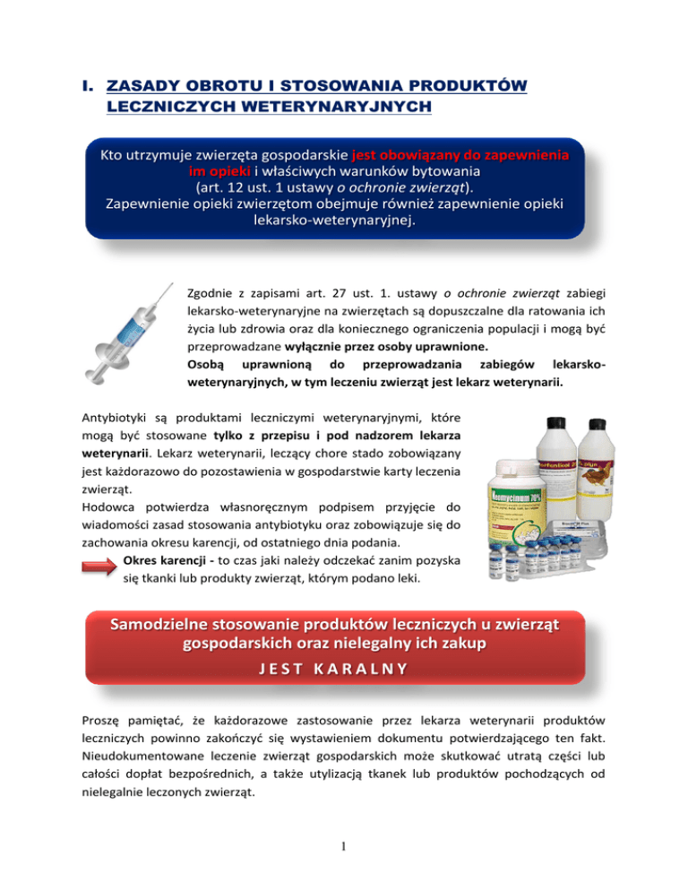 I. ZASADY OBROTU I STOSOWANIA PRODUKTÓW LECZNICZYCH WETERYNARYJNYCH Kto utrzymuje zwierzęta gospodarskie jest obowiązany do zapewnienia im opieki i właściwych warunków bytowania (art. 12 ust. 1 ustawy o ochronie zwierząt). Zapewnienie opieki zwierzętom obejmuje również zapewnienie opieki lekarsko-weterynaryjnej. Zgodnie z zapisami art. 27 ust. 1. ustawy o ochronie zwierząt zabiegi lekarsko-weterynaryjne na zwierzętach są dopuszczalne dla ratowania ich życia lub zdrowia oraz dla koniecznego ograniczenia populacji i mogą być przeprowadzane wyłącznie przez osoby uprawnione. Osobą uprawnioną do przeprowadzania zabiegów lekarskoweterynaryjnych, w tym leczeniu zwierząt jest lekarz weterynarii. Antybiotyki są produktami leczniczymi weterynaryjnymi, które mogą być stosowane tylko z przepisu i pod nadzorem lekarza weterynarii. Lekarz weterynarii, leczący chore stado zobowiązany jest każdorazowo do pozostawienia w gospodarstwie karty leczenia zwierząt. Hodowca potwierdza własnoręcznym podpisem przyjęcie do wiadomości zasad stosowania antybiotyku oraz zobowiązuje się do zachowania okresu karencji, od ostatniego dnia podania. Okres karencji - to czas jaki należy odczekać zanim pozyska się tkanki lub produkty zwierząt, którym podano leki. Samodzielne stosowanie produktów leczniczych u zwierząt gospodarskich oraz nielegalny ich zakup JEST KARALNY Proszę pamiętać, że każdorazowe zastosowanie przez lekarza weterynarii produktów leczniczych powinno zakończyć się wystawieniem dokumentu potwierdzającego ten fakt. Nieudokumentowane leczenie zwierząt gospodarskich może skutkować utratą części lub całości dopłat bezpośrednich, a także utylizacją tkanek lub produktów pochodzących od nielegalnie leczonych zwierząt. 1 Dokument potwierdzający leczenie zwierząt w gospodarstwie powinien być przechowywany przez okres pięciu lat. Na dokumencie tym powinien znajdować się podpis rolnika oraz podpis i pieczątka lekarza weterynarii. Szanowni Państwo! Żądajcie od lekarzy weterynarii leczących Wasze zwierzęta wystawiania takiego dokumentu. Jest to Państwa niezbywalne prawo i obowiązek lekarzy weterynarii leczących zwierzęta gospodarskie. Kolejnym ważnym dokumentem jest łańcuch żywnościowy. Informacje dotyczące leczenia zwierząt (w tym stosowane preparaty lecznicze, ich okres stosowania oraz okresy karencji) należy wpisywać w łańcuch żywnościowy zwierząt kierowanych do uboju. 1. Nabywanie i stosowanie u zwierząt produktów leczniczych weterynaryjnych Na podstawie art. 68 ust. 2 ustawy Prawo farmaceutyczne obrót detaliczny produktami leczniczymi zakupionymi w hurtowni farmaceutycznej produktów leczniczych weterynaryjnych może być prowadzony przez lekarza weterynarii wyłącznie w ramach działalności zakładu leczniczego dla zwierząt. Odpowiedzialnym za obrót jest kierownik zakładu leczniczego dla zwierząt lub lekarz przez niego wyznaczony. Zakup produktów leczniczych weterynaryjnych przez hodowców zwierząt z innych źródeł jest nielegalny. Wszystkie zarejestrowane w Polsce produkty lecznicze weterynaryjne przeznaczone do stosowania u zwierząt gospodarskich oraz zwierząt, z których pozyskane tkanki lub produkty przeznaczone są do spożycia przez ludzi są dostępne jedynie z przepisu lekarza weterynarii i mogą być stosowane u zwierząt jedynie do podawania wyłącznie przez lekarza lub pod nadzorem lekarza weterynarii. Tylko lekarz weterynarii po zbadaniu zwierząt i postawieniu diagnozy może zlecić właścicielowi zwierząt podawanie produktów leczniczych o kategorii dostępności wydawanych na podstawie recepty (z przepisu lekarza weterynarii), zatem każde zastosowanie leków musi odpowiadać i być zgodne co do daty, ilości oraz czasu ich używania z wystawionym przez lekarza weterynarii dokumentem. II. Wymagania weterynaryjne dla gospodarstw Czy gospodarstwo spełnia następujące wymagania? Czy w gospodarstwie znajduje się: - wydzielone miejsce do składowania środków dezynfekcyjnych, zabezpieczone przed dostępem osób niepowołanych; - wydzielone miejsce do składowania obornika; 2 - miejsce zapewniające właściwe warunki do przetrzymywania produktów leczniczych weterynaryjnych, zabezpieczone przed dostępem osób niepowołanych; - odzież i obuwie przeznaczone tylko do obowiązkowego użycia w gospodarstwie; - maty dezynfekcyjne w liczbie zapewniającej zabezpieczenie wejść i wjazdów do gospodarstwa w przypadku wystąpienia zagrożenia epizootycznego; - środki dezynfekcyjne w ilości niezbędnej do przeprowadzenia doraźnej dezynfekcji. Czy budynki, w których utrzymywane są zwierzęta: - są zabezpieczone przed dostępem zwierząt innych niż utrzymywane w gospodarstwie; - są utrzymywane w czystości. Czy przy wejściach do budynków, w których utrzymywane są zwierzęta, znajdują się tablice z napisem "Osobom nieupoważnionym wstęp wzbroniony". III. Zasady prowadzenia ewidencji leczenia zwierząt Zgodnie z ustawą o ochronie zdrowia zwierząt oraz zwalczaniu chorób zakaźnych zwierząt posiadacz zwierząt gospodarskich jest obowiązany do prowadzenia ewidencji leczenia zwierząt. Książka leczenia zwierząt gospodarskich - wzór Lekarz weterynarii leczący zwierzęta dokonuje wpisów w ewidencji leczenia zwierząt. Szczegółowy zakres i sposób oraz wzór zawarty jest w Rozporządzeniu Ministra Rolnictwa i Rozwoju Wsi z dnia 29 września 2011 r. w sprawie zakresu i sposobu prowadzenia dokumentacji lekarsko-weterynaryjnej i ewidencji leczenia zwierząt oraz wzorów tej dokumentacji i ewidencji (Dz. U. Nr 224 poz. 1347 z 2011 r.) W rozporządzeniu tym czytamy m. in.: Lekarz weterynarii prowadzi dokumentację lekarsko-weterynaryjną z wykonywanych zabiegów leczniczych i profilaktycznych oraz stosowanych produktów leczniczych i pasz leczniczych w postaci: • papierowej książki leczenia zwierząt gospodarskich oraz zwierząt, z których pozyskane tkanki lub produkty są prze