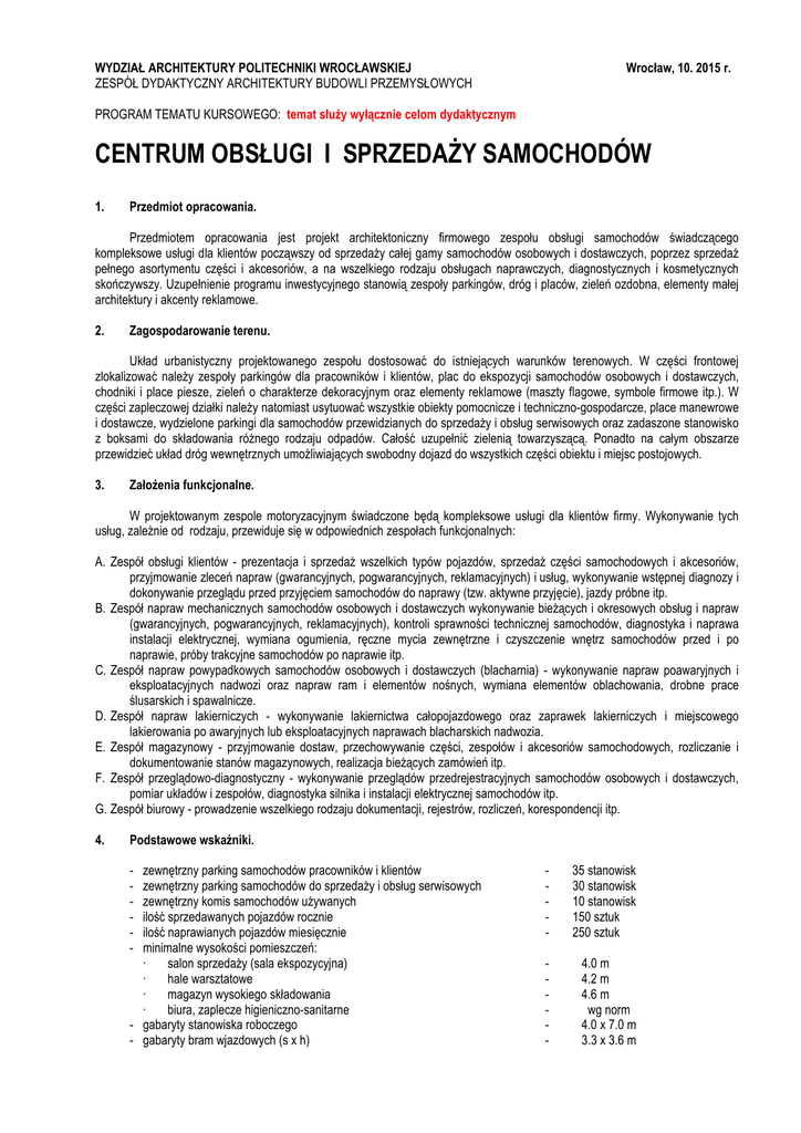 WYDZIAŁ ARCHITEKTURY POLITECHNIKI WROCŁAWSKIEJ ZESPÓŁ DYDAKTYCZNY ARCHITEKTURY BUDOWLI PRZEMYSŁOWYCH Wrocław, 10. 2015 r. PROGRAM TEMATU KURSOWEGO: temat służy wyłącznie celom dydaktycznym CENTRUM OBSŁUGI I SPRZEDAŻY SAMOCHODÓW 1. Przedmiot opracowania. Przedmiotem opracowania jest projekt architektoniczny firmowego zespołu obsługi samochodów świadczącego kompleksowe usługi dla klientów począwszy od sprzedaży całej gamy samochodów osobowych i dostawczych, poprzez sprzedaż pełnego asortymentu części i akcesoriów, a na wszelkiego rodzaju obsługach naprawczych, diagnostycznych i kosmetycznych skończywszy. Uzupełnienie programu inwestycyjnego stanowią zespoły parkingów, dróg i placów, zieleń ozdobna, elementy małej architektury i akcenty reklamowe. 2. Zagospodarowanie terenu. Układ urbanistyczny projektowanego zespołu dostosować do istniejących warunków terenowych. W części frontowej zlokalizować należy zespoły parkingów dla pracowników i klientów, plac do ekspozycji samochodów osobowych i dostawczych, chodniki i place piesze, zieleń o charakterze dekoracyjnym oraz elementy reklamowe (maszty flagowe, symbole firmowe itp.). W części zapleczowej działki należy natomiast usytuować wszystkie obiekty pomocnicze i techniczno-gospodarcze, place manewrowe i dostawcze, wydzielone parkingi dla samochodów przewidzianych do sprzedaży i obsług serwisowych oraz zadaszone stanowisko z boksami do składowania różnego rodzaju odpadów. Całość uzupełnić zielenią towarzyszącą. Ponadto na całym obszarze przewidzieć układ dróg wewnętrznych umożliwiających swobodny dojazd do wszystkich części obiektu i miejsc postojowych. 3. Założenia funkcjonalne. W projektowanym zespole motoryzacyjnym świadczone będą kompleksowe usługi dla klientów firmy. Wykonywanie tych usług, zależnie od rodzaju, przewiduje się w odpowiednich zespołach funkcjonalnych: A. Zespół obsługi klientów - prezentacja i sprzedaż wszelkich typów pojazdów, sprzedaż części samochodowych i akcesoriów, przyjmowanie zleceń napraw (gwarancyjnych, pogwarancyjnych, reklamacyjnych) i usług, wykonywanie wstępnej diagnozy i dokonywanie przeglądu przed przyjęciem samochodów do naprawy (tzw. aktywne przyjęcie), jazdy próbne itp. B. Zespół napraw mechanicznych samochodów osobowych i dostawczych wykonywanie bieżących i okresowych obsług i napraw (gwarancyjnych, pogwarancyjnych, reklamacyjnych), kontroli sprawności technicznej samochodów, diagnostyka i naprawa instalacji elektrycznej, wymiana ogumienia, ręczne mycia zewnętrzne i czyszczenie wnętrz samochodów przed i po naprawie, próby trakcyjne samochodów po naprawie itp. C. Zespół napraw powypadkowych samochodów osobowych i dostawczych (blacharnia) - wykonywanie napraw poawaryjnych i eksploatacyjnych nadwozi oraz napraw ram i elementów nośnych, wymiana elementów oblachowania, drobne prace ślusarskich i spawalnicze. D. Zespół napraw lakierniczych - wykonywanie lakiernictwa całopojazdowego oraz zaprawek lakierniczych i miejscowego lakierowania po awaryjnych lub eksploatacyjnych naprawach blacharskich nadwozia. E. Zespół magazynowy - przyjmowanie dostaw, przechowywanie części, zespołów i akcesoriów samochodowych, rozliczanie i dokumentowanie stanów magazynowych, realizacja bieżących zamówień itp. F. Zespół przeglądowo-diagnostyczny - wykonywanie przeglądów przedrejestracyjnych samochodów osobowych i dostawczych, pomiar układów i zespołów, diagnostyka silnika i instalacji elektrycznej samochodów itp. G. Zespół biurowy - prowadzenie wszelkiego rodzaju dokumentacji, rejestrów, rozliczeń, korespondencji itp. 4. Podstawowe wskaźniki. - zewnętrzny parking samochodów pracowników i klientów zewnętrzny parking samochodów do sprzedaży i obsług serwisowych zewnętrzny komis samochodów używanych ilość sprzedawanych pojazdów rocznie ilość naprawianych pojazdów miesięcznie minimalne wysokości pomieszczeń: · salon sprzedaży (sala ekspozycyjna) · hale warsztatowe · magazyn wysokiego składowania · biura, zaplecze higieniczno-sanitarne - gabaryty stanowiska roboczego - gabaryty bram wjazdowych (s x h) - 35 stanowisk 30 stanowisk 10 stanowisk 150 sztuk 250 sztuk - 4.0 m 4.2 m 4.6 m wg norm 4.0 x 7.0 m 3.3 x 3.6 m - gabaryty kabiny lakierniczo-suszarniczej(dwustanowiskowej) - zależnie od typu (otwarta lub przelotowa) ilość zatrudnionych 50 osób - struktura zatrudnienia: · pracownicy warsztatowo-magazynowi 25 osób w tym: I zmiana 15 osób II zmiana 10 osób · pracownicy lakierni 5 osób w tym: I zmiana 3 osoby II zmiana 2 osoby · pracownicy inżynieryjno-techniczni 8 osób w tym: I zmiana 6 osoby II zmiana 2 osoby · pracownicy biurowi 12 osób 5. Program ogólny (bez powierzchni komunikacji wewnętrznej). - zespół obsługi klientów zespół napraw mechanicznych zespół napraw powypadkowych (blacharnia) zespół napraw lakierniczych zespół magazynowy zespół przeglądowo-diagnostyczny zespół biurowy zespół higieniczno-sanitarny zespół zaplecza technicznego - 550 m2 520 m2 380 m2 370 m2 210 m2 75 m2 200 m2 60 m2 65 m2 Obiekt w zasadzie jednokondygnacyjny z możliwością częściowego spiętrzenia. 6. Szczegółowy program użytkowy. 6.1. Zespól obsługi klientów: - salon sprzedaży z możliwością ekspozycji około 10 pojazdów 250 m2 - sektor obsługi klienta (wystawa części i akcesoriów, informacja, sprzedaż samochodów, poczekalnia, minikawiarenka) 100 m2 - sektor serwisu (sklep - sprzedaż części i akcesoriów, przyjmowanie zleceń, doradztwo, biuro mistrza, biuro serwisantów, kasa, dwa pokoje rozmów) 90 m2 - stanowisko aktywnego przyjęcia (połączone funkcjonalnie z sektorem serwisu) 50 m2 - pomieszczenia sanitarne wg norm - pomieszczenia pomocnicze (archiwum podręczne, magazyn porządkowy itp.) 30 m2 6.2. Zespól napraw mechanicznych: - hala napraw (10 stanowisk) - myjnia ręczna - podręczny magazyn części i podz