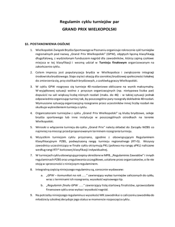 Regulamin cyklu turniejów par GRAND PRIX WIELKOPOLSKI §1. POSTANOWIENIA OGÓLNE 1. Wielkopolski Związek Brydża Sportowego w Poznaniu organizuje rokrocznie cykl turniejów regionalnych pod nazwą „Grand Prix Wielkopolski” (GPW), objętych łączną klasyfikacją długofalową, z wydzielonym funduszem nagród dla zawodników, którzy zajmą czołowe miejsca w tej klasyfikacji i wezmą udział w Turnieju finałowym organizowanym na zakończenie cyklu. 2. Celem imprezy jest popularyzacja brydża w Wielkopolsce i zwiększenie integracji środowiska brydżowego. Staje się też okazją dla szerokiej brydżowej społeczności lokalnej do zmierzenia się, przy stolikach brydżowych, z czołówką graczy Wielkopolski. 3. W cyklu GPW rozgrywa się turnieje 40-rozdaniowe obliczane na wynik maksymalny. W wyjątkowej sytuacji wolno z przyczyn organizacyjnych (np. nietypowa liczba par) dopuścić na sali większą liczbę różnych rozdań (maks. do 46) - w takiej sytuacji jednak odpowiednio organizując turniej tak, by poszczególne pary rozegrały dokładnie 40 rozdań. Wymuszone sytuacją organizacyjną rozegranie przez uczestników innej liczby rozdań nie skutkuje wykreśleniem turnieju z cyklu. 4. Organizatorami turniejów z cyklu „Grand Prix Wielkopolski” są kluby brydżowe, sekcje brydża sportowego lub inne instytucje w poszczególnych ośrodkach na terenie Wielkopolski. 5. Wnioski o włączenie turnieju do cyklu „Grand Prix” należy składać do Zarządu WZBS co najmniej na miesiąc przed proponowanym terminem rozegrania turnieju. 6. Wszystkim turniejom cyklu przyznano, zgodnie z obowiązującym Regulaminem Klasyfikacyjnym PZBS, podwyższoną rangę turnieju regionalnego (RT=5). Wszyscy zawodnicy uczestniczący w finale cyklu otrzymują PKL (połowa ma rangę aPKL) naliczone według rangi RTI* końcowej klasyfikacji indywidualnej. 7. W turniejach cyklu obowiązują przepisy określone w MPB, „Regulaminie Zawodów” i innych regulaminach PZBS oraz uregulowania szczegółowe, ustalone przez organizatorów, o ile nie stoją w sprzeczności z niniejszym regulaminem. 8. Integralną częścią niniejszego regulaminu są, corocznie wydawane: a. „GPW – komunikat na rok .....” zawierający wykaz turniejów zaliczonych do cyklu, wraz z terminami ich rozegrania, wysokość wpisowego itp. b. „Regulamin finału GPW .....” zawierający listę startową finalistów, sprawozdanie finansowe cyklu oraz wykaz i wysokość nagród. 9. Na potrzeby niniejszego regulaminu o wysokości WK zawodnika i o zaliczeniu zawodnika do młodzieży szkolnej decyduje jego status w momencie rozpoczęcia cyklu. §2. KLASYFIKACJA DŁUGOFALOWA 1. Do klasyfikacji długofalowej zalicza się każdemu zawodnikowi procent uzyskany (przez parę) w danym turnieju. 2. Końcową klasyfikację długofalową cyklu stanowi suma n najlepszych wyników danego zawodnika, gdzie n jest równe 60% liczby wszystkich turniejów cyklu (zaokrąglone do liczby całkowitej). 3. Liczba n zaliczanych turniejów winna być określona do 30 września. Po tym terminie, każde odwołanie turnieju z cyklu GPW, niezastąpione innym turniejem, zmniejsza tę liczbę o 1. Gdy liczba wszystkich turniejów cyklu wzrośnie po tym terminie, liczba n nie ulega zmianie. 4. W celu zróżnicowania miejsc dzielonych na potrzeby kwalifikacji do finału o lepszym miejscu decydują kolejno: większa liczba rozegranych turniejów eliminacyjnych, niższe WK zawodnika, losowanie. §3. FINAŁ 1. W finale wystartuje 12 finalistów z dowolnie wybranymi partnerami spośród zawodników, którzy uczestniczyli w co najmniej 30% turniejów cyklu. 2. Status finalisty otrzymują: a. 10 czołowych zawodników klasyfikacji długofalowej; b. Zwycięzca poprzedniego cyklu GPW, o ile rozegrał co najmniej 30% turniejów bieżącego cyklu; c. Zwycięzca klasyfikacji długofalowej młodzieży szkolnej, o ile rozegrał co najmniej 30% turniejów cyklu, uzyskał średni wynik z turniejów zaliczanych mu do klasyfikacji w wysokości co najmniej 50% oraz wystąpi w parze z innym zawodnikiem młodzieży szkolnej. 3. W przypadku, gdy: a. finaliści potwierdzą start w finale w jednej parze, lub b. finaliści zrezygnują z udziału w finale, lub c. finaliści nie spełniają warunków określonych w pkt. 2 powyżej prawo zagrania w finale otrzymują kolejni (od 11. miejsca) zawodnicy klasyfikacji długofalowej. W razie nieprzybycia na czas zawodnika uprzednio zgłoszonego do zawodów nie przewiduje się powoływania zawodnika rezerwowego lub zgody na zastępstwo. 4. Liczba rozdań w finale wynosi 44. Rozgrywa się dwie sesje „każdy z każdym”. 5. Zawodnicy finału indywidualnie otrzymują carry-over w wysokości równej 1/n (patrz 2.2 powyżej) swojego sumarycznego wyniku z klasyfikacji długofalowej z przeliczeniem na punkty turniejowe (PT) odpowiadające 1/2 punktów możliwych do zdobycia w finale . 6. Dodatkowo, w zależności od lokaty w klasyfikacji długofalowej GPW, zawodnicy otrzymują dodatkowo: za 1 m. 10 PT, za 2 m. 7 PT, 3 m. 5 PT, 4 m. 3 PT, 5m. 2 PT, 6 m. 1 PT. 7. Do powyższych punktów dodaje się wynik uzyskany w turnieju finałowym w punktach turniejowych. Suma decyduje o zajętym ostatecznie miejscu w końcowej klasyfikacji indywidualnej całego cyklu GPW. §4. WPISOWE I NAGRODY 1. Maksymalne wpisowe do turniejów eliminacyjnych cyklu jest ogłaszane w corocznych komunikatach. 2. Opłata startowa (wpisowe) zawiera kwotę przeznaczoną na fundusz długofalowy. 3. Nagrody pieniężne w poszczególnych turniejach są ustalane przez organizatorów. W przypadku, gdy ich liczba i wysokość nie zostały wcześniej ogłoszone, zgodnie z Regulaminem Zawodów PZBS, muszą wynieść min. 50% funduszu wpisowego obliczonego na podstawie maksymalnych stawek wpisowego. 4. Fundusz długofalowy przeznaczony jest dla wszystkich zawodników uczestniczących w finale oraz na nagrody specjalne. 5. Przewiduje się nagrody specjalne dla: najlepszego zawodnika w klasyfik