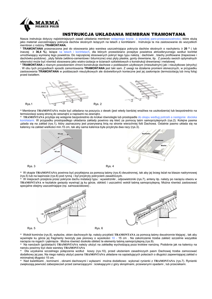INSTRUKCJA UKŁADANIA MEMBRAN TRAMONTANA Nasza instrukcja dotyczy najistotniejszych zasad układania membran wstępnego krycia o wysokiej paro-przepuszczalności, które służą jako materiał uszczelniający pokrycia dachów skośnych leżących na łatach z kontrłatami . Instrukcja ta ma zastosowanie do wszystkich membran z rodziny TRAMONTANA. * TRAMONTANA przeznaczona jest do stosowania jako warstwa uszczelniająca pokrycia dachów skośnych o nachyleniu ≥ 20 º ( lub inaczej ≥ 36,4 %), leżące na łatach i kontrłatach, dla których przewidziano przepływ powietrza atmosferycznego wzdłuż kontrłat umożliwiający wymianę tego powietrza. Do najczęściej stosowanych pokryć tego typu należą : dachówki , blachy profilowane (trapezowe i dachówko-podobne) , płyty faliste (włókno-cementowe i bitumiczne) oraz płyty płaskie, gonty drewniane, itp. Z powodu swoich optymalnych własności może być również stosowana jako wiatro-izolacja w ścianach szkieletowych o konstrukcji drewnianej i metalowej * TRAMONTANA z równym powodzeniem chroni konstrukcje dachowe z poddaszem użytkowym (mieszkalnym) jak i nieużytkowe (strychy) . W obu tych przypadkach sposób zamontowania TRAMONTANA jest taki sam. Z uwagi na działanie promieni słonecznych, w przypadku zastosowania TRAMONTANA w poddaszach nieużytkowych ale doświetlonych konieczne jest jej zasłonięcie (termoizolacją lub inną folią) przed światłem. Rys.1 Rys. 2 * Membrana TRAMONTANA może być układana na poszyciu z desek (jest wtedy bardziej wrażliwa na uszkodzenia) lub bezpośrednio na termoizolacji szarą stroną do wewnątrz a napisami na zewnątrz. * TRAMONTANA przybija się wstępnie bezpośrednio do krokwi równolegle lub prostopadle do okapu według potrzeb a następnie dociska kontrłatami. W przypadku prostopadłego układania zakłady powinno się kleić za pomocą taśm samoprzylepnych (rys.2). Kolejne pasma układa się na zakład (rys.1), który zaznaczony jest przerywaną linią na stronie wierzchniej folii Dachowa. Ostatnie pasmo układa się na kalenicy na zakład wielkości min.15 cm, tak aby sama kalenica była przykryta dwa razy (rys.3). Rys. 3 Rys. 4 * W okapie TRAMONTANA powinna być przyklejona za pomocą taśmy (rys.4) dwustronnej, tak aby jej brzeg leżał na blasze nadrynnowej (rys.5) lub na kapinosie (rys.6) pod rynną i był przykryty pokryciem zasadniczym. * W miejscach przejścia przez pokrycie dachu instalacji typu : wywietrzniki , odpowietrzniki (rys.7), anteny itp. należy po nacięciu otworu w TRAMONTANA w kształcie gwiazdy wywinąć ją ku górze, obkleić i uszczelnić wokół taśmą samoprzylepną. Można również zastosować specjalne obejmy uszczelniające (np. samozaciskowe) . Rys. 5 Rys. 6 * Wokół kominów (rys.8), wyłazów, okien dachowych itp. należy przykleić TRAMONTANA za pomocą taśmy dwustronnie klejącej , tak aby wywinięte ku górze jej fragmenty tworzyły pas pionowy o wysokości 10 - 15 cm . Na zakończenie trzeba zakleić szczelnie wszystkie nacięcia na rogach i pęknięcia . Można również dookoła obkleić te elementy taśmą samoprzylepną (rys.9). * Na narożach (grzbietach) TRAMONTANA należy ułożyć na zakładkę wychodzącą poza krokiew narożną. Podobnie jak na kalenicy na narożu powinny być dwie warstwy TRAMONTANA * Dla uzyskania szczelnego połączenia wzdłuż koszy (rys.10), przed ułożeniem zasadniczych pasm Dachowej trzeba zamocować dodatkowy jej pas. Na niego należy ułożyć pasma TRAMONTANA układane na sąsiadujących połaciach o długości zapewniającej zakład o minimalnej długości 15 cm. * Nad świetlikami , kominami , oknami dachowymi i wyłazami można dodatkowo wykonać rynienki z TRAMONTANA (rys.7). Rynienki zwiększają pewność zabezpieczeń przed zamarzającymi : ściekającymi z góry skroplinami, przewianymi opadami , lub przeciekami. Rys. 7 Rys.9 Rys. 8 Rys.10 * Do klejenia membran z rodziny TRAMONTANA w czasie układania trzeba używać taśm samoprzylepnych ściśle przeznaczonych do tego celu (np. MARMA B2, PE1, N2 itp.) . Uwagi i zastrzeżenia . 1. Z powodu działania promieni słonecznych (UV) na TRAMONTANA, zaleca się : - zamocowanie pokrycia zasadniczego w jak najszybszym czasie po ułożeniu TRAMONTANA (najlepiej jest układać obie części jednocześnie) – zasłonięcie membrany (np.termoizolacją) od strony wewnętrznej, od poddasza w czasie nie dłuższym niż 3 miesiące od daty ułożenia membrany na dachu a w okapie nie dłuższym niż 2 miesiące. 2. Prosimy układających TRAMONTANA o zachowanie warunków bezpieczeństwa przeciw pożarowego w tym o nie palenie papierosów w trakcie jej układania. Spadający żar z papierosów wypala w membranie małe otwory trudne do zauważenia a powodujące przecieki. Podobne efekty wywołują rozżarzone szczątki powstające przy cięciu dachówek, stali itp. Mogą być one również przyczyną pożaru. 3. Nie wolno stosować impregnatów solnych do zabezpieczania łat i kontrłat znajdujących się nad TRAMONTANA. 4. Z powodu szczególnie dużych obciążeń membran dachowych w koszach i okapach w czasie układania i eksploatacji, zaleca się stosowanie w tych miejscach membrany TRAMONTANA 165. Jest to szczególnie istotne przy nachyleniach połaci dachowych poniżej 36 º. 5. Rysunek nr 8 opisujący sposób mocowania membrany wokół kominów dotyczy tylko kominów wentylacyjnych i odpowietrzających. Kominy spalinowe powinny być połączone z membraną TRAMONTANA według obowiązujących przepisów spełniając warunki bezpieczeństwa przeciw pożarowego. 6. Mocowanie wstępne najlepiej jest wykonać gwoździami o szerokim łebku (papiakami) lub zszywkami wbijanymi „takerem”. Takie mocowanie może być powodem przeciekania membrany w czasie jej układania gdy pada deszcz i nie ma jeszcze pokrycia zasadniczego. Po prawidłowym zamontowaniu pokrycia zasadniczego, pod kontrłaty nie może się już dostawać tak duża ilość wody aby tworzyły