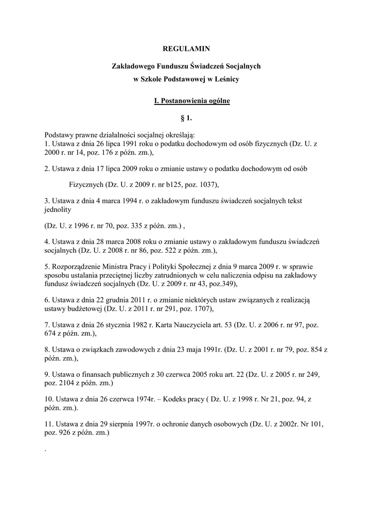 REGULAMIN Zakładowego Funduszu Świadczeń Socjalnych w Szkole Podstawowej w Leśnicy I. Postanowienia ogólne § 1. Podstawy prawne działalności socjalnej określają: 1. Ustawa z dnia 26 lipca 1991 roku o podatku dochodowym od osób fizycznych (Dz. U. z 2000 r. nr 14, poz. 176 z późn. zm.), 2. Ustawa z dnia 17 lipca 2009 roku o zmianie ustawy o podatku dochodowym od osób Fizycznych (Dz. U. z 2009 r. nr b125, poz. 1037), 3. Ustawa z dnia 4 marca 1994 r. o zakładowym funduszu świadczeń socjalnych tekst jednolity (Dz. U. z 1996 r. nr 70, poz. 335 z późn. zm.) , 4. Ustawa z dnia 28 marca 2008 roku o zmianie ustawy o zakładowym funduszu świadczeń socjalnych (Dz. U. z 2008 r. nr 86, poz. 522 z późn. zm.), 5. Rozporządzenie Ministra Pracy i Polityki Społecznej z dnia 9 marca 2009 r. w sprawie sposobu ustalania przeciętnej liczby zatrudnionych w celu naliczenia odpisu na zakładowy fundusz świadczeń socjalnych (Dz. U. z 2009 r. nr 43, poz.349), 6. Ustawa z dnia 22 grudnia 2011 r. o zmianie niektórych ustaw związanych z realizacją ustawy budżetowej (Dz. U. z 2011 r. nr 291, poz. 1707), 7. Ustawa z dnia 26 stycznia 1982 r. Karta Nauczyciela art. 53 (Dz. U. z 2006 r. nr 97, poz. 674 z późn. zm.), 8. Ustawa o związkach zawodowych z dnia 23 maja 1991r. (Dz. U. z 2001 r. nr 79, poz. 854 z późn. zm.), 9. Ustawa o finansach publicznych z 30 czerwca 2005 roku art. 22 (Dz. U. z 2005 r. nr 249, poz. 2104 z późn. zm.) 10. Ustawa z dnia 26 czerwca 1974r. – Kodeks pracy ( Dz. U. z 1998 r. Nr 21, poz. 94, z późn. zm.). 11. Ustawa z dnia 29 sierpnia 1997r. o ochronie danych osobowych (Dz. U. z 2002r. Nr 101, poz. 926 z późn. zm.) . § 2. Ilekroć w regulaminie jest mowa o: Szkole, rozumie się przez to Szkołę Podstawową w Leśnicy Funduszu, rozumie się przez to Zakładowy Fundusz Świadczeń Socjalnych, Odpisie podstawowym, rozumie się przez to 37,5% przeciętnego wynagrodzenia miesięcznego w gospodarce narodowej w roku poprzednim lub w II półroczu roku poprzedniego, jeżeli przeciętne wynagrodzenie z tego okresu stanowiło kwotę wyższą. § 3. Coroczny odpis podstawowy tworzy się z: odpisu dla pracowników pedagogicznych sfery budżetowej będącego iloczynem przeciętnej liczby zatrudnionych nauczycieli w pełnym i niepełnym wymiarze zajęć (po przeliczeniu na pełny wymiar zajęć) skorygowanej w ciągu roku do faktycznej przeciętnej liczby zatrudnionych nauczycieli, w przeliczeniu na pełny wymiar zajęć i 110% kwoty bazowej, 2) odpisu dla pracowników niebędących nauczycielami w wysokości odpisu podstawowego, 37,5% przeciętnego wynagrodzenia miesięcznego na jednego zatrudnionego w gospodarce narodowej w roku poprzednim lub w II półroczu roku poprzedniego, jeśli przeciętne wynagrodzenie tego okresu stanowiło kwotę wyższą 1) odpisu dla emerytów i rencistów byłych nauczycieli, w wysokości 5% pobieranych przez nich emerytur i rent, 4) odpisu dla emerytów i rencistów (niebędących nauczycielami) w wysokości 6,25% przeciętnego wynagrodzenia miesięcznego w gospodarce narodowej w roku poprzednim lub w II półroczu roku poprzedniego, jeżeli przeciętne wynagrodzenie z tego okresu stanowiło kwotę wyższą. 3) § 4. Środki Funduszu zwiększa się o: darowizny oraz zapisy osób fizycznych i prawnych, odsetki od środków Funduszu pochodzących od oprocentowanych środków na rachunku bankowym, wpływy z oprocentowania pożyczek udzielonych na cele mieszkaniowe § 5. 1.Odpisy i zwiększenia tworzą jeden Fundusz. 2.Środki Funduszu gromadzone są na rachunku bankowym: 9189070082001000089570003BS w Leśnicy 3. Środki, o których mowa w §3, ust. 1 przekazywane są na rachunek bankowy wymieniony w ust. 2 w następujących terminach: a) 75% odpisu – do 31 maja danego roku kalendarzowego, b) 25% odpisu – do 30 września danego roku kalendarzowego. § 6. 1. Fundusz jest funduszem spożycia zbiorowego i nie korzystanie z niego nie daje pracownikowi podstaw do żądania jakiegokolwiek ekwiwalentu lub objęcia pracownika działalnością socjalną finansowaną z Funduszu. 2. Środkami Funduszu administruje Dyrektor Szkoły Podstawowej w Leśnicy w ramach środków naliczonych przez Gminny Zarząd Oświaty w Leśnicy. 3. Decyzje w sprawie przyznania świadczeń ze środków Funduszu podejmuje Dyrektor Szkoły na podstawie obowiązującego regulaminu po uzgodnieniu ze związkami zawodowymi. Odmowa przyznania wnioskowanego świadczenia nie wymaga uzasadnienia, a decyzja dyrektora jest ostateczna. 4. W celu usprawnienia wydawania decyzji Dyrektor może powołać Komisję Socjalną , która dokonuje podziału środków, wstępnej kwalifikacji wniosków o przyznanie danego rodzaju świadczenia lub pomocy z funduszu. 5. Kadencja Komisji trwa do odwołania. Skład Komisji może ulec zmianie decyzją Dyrektora w czasie trwania kadencji. 6. Skład Komisji składa pisemne oświadczenie o zachowaniu tajemnicy danych osobowych osób ubiegających się o pomoc socjalną. 7.Przyznawanie świadczeń oraz wysokość dopłat z Funduszu uzależnia się od sytuacji życiowej, rodzinnej i materialnej osoby uprawnionej do korzystania z Funduszu. 8.Nie można pokrywać z Funduszu wydatków, które nie mogą być z niego finansowane ani obciążać Funduszu zobowiązaniami ponad kwotę zgromadzonych na rachunku bankowym środków Funduszu. 9.Świadczenia Zakładowego Funduszu Świadczeń Socjalnych nie mają charakteru roszczeniowego. § 7. 1.Podstawą gospodarowania Funduszem jest roczny plan finansowy. 2. Regulamin, roczny plan finansowy oraz wszelkie załączniki i zmiany regulaminu wymagają uzgodnienia z organizacjami związkowymi, działającymi na terenie szkoły. II. Uprawnieni do korzystania z Zakładowego Funduszu Świadczeń Socjalnych za wyjątkiem dofinansowania wypoczynku urlopowego. § 8. Ze świadczeń Zakładowego Funduszu Świadczeń Socjalnych zwanego dalej „ FUNDUSZEM " mogą korzystać: 1. Pracownicy zatrudnieni w pełnym i niepełnym wymia