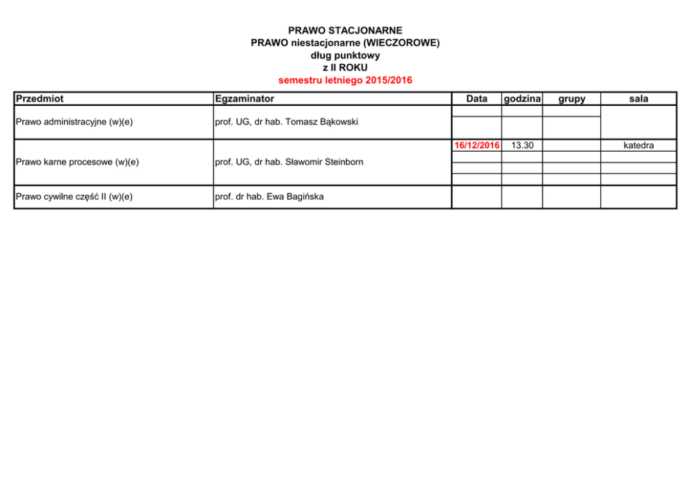 PRAWO STACJONARNE PRAWO niestacjonarne (WIECZOROWE) dług punktowy z II ROKU semestru letniego 2015/2016 Przedmiot Egzaminator Prawo administracyjne (w)(e) prof. UG, dr hab. Tomasz Bąkowski Prawo karne procesowe (w)(e) prof. UG, dr hab. Sławomir Steinborn Prawo cywilne część II (w)(e) prof. dr hab. Ewa Bagińska Data godzina 16/12/2016 13.30 grupy sala katedra