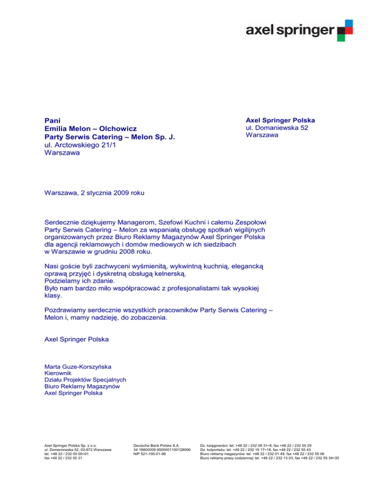 Pani Emilia Melon – Olchowicz Party Serwis Catering – Melon Sp. J. ul. Arctowskiego 21/1 Warszawa Axel Springer Polska ul. Domaniewska 52 Warszawa Warszawa, 2 stycznia 2009 roku Serdecznie dziękujemy Managerom, Szefowi Kuchni i całemu Zespołowi Party Serwis Catering – Melon za wspaniałą obsługę spotkań wigilijnych organizowanych przez Biuro Reklamy Magazynów Axel Springer Polska dla agencji reklamowych i domów mediowych w ich siedzibach w Warszawie w grudniu 2008 roku. Nasi goście byli zachwyceni wyśmienitą, wykwintną kuchnią, elegancką oprawą przyjęć i dyskretną obsługą kelnerską. Podzielamy ich zdanie. Było nam bardzo miło współpracować z profesjonalistami tak wysokiej klasy. Pozdrawiamy serdecznie wszystkich pracowników Party Serwis Catering – Melon i, mamy nadzieję, do zobaczenia. Axel Springer Polska Marta Guze-Korszyńska Kierownik Działu Projektów Specjalnych Biuro Reklamy Magazynów Axel Springer Polska Axel Springer Polska Sp. z o.o. ul. Domaniewska 52, 02-672 Warszawa tel. +48 22 / 232 00 00÷01 fax +48 22 / 232 55 31 Deutsche Bank Polska S.A. 34 18800009 0000001100128006 NIP 521-100-01-98 Dz. księgowości: tel. +48 22 / 232 09 31÷9, fax +48 22 / 232 55 29 Dz. kolportaŜu: tel. +48 22 / 232 15 17÷18, fax +48 22 / 232 55 43 Biuro reklamy magazynów: tel. +48 22 / 232 01 49, fax +48 22 / 232 55 06 Biuro reklamy prasy codziennej: tel. +48 22 / 232 13 03, fax +48 22 / 232 55 34÷35