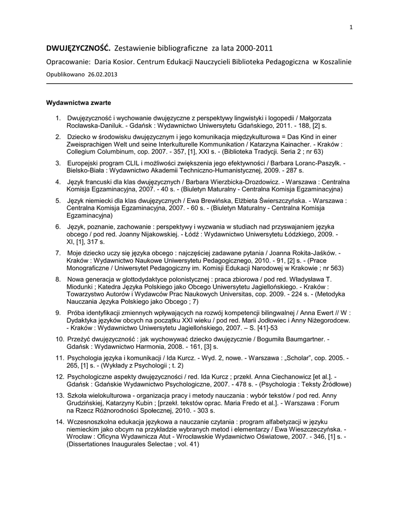 1 DWUJĘZYCZNOŚĆ. Zestawienie bibliograficzne za lata 2000-2011 Opracowanie: Daria Kosior. Centrum Edukacji Nauczycieli Biblioteka Pedagogiczna w Koszalinie Opublikowano 26.02.2013 Wydawnictwa zwarte 1. Dwujęzyczność i wychowanie dwujęzyczne z perspektywy lingwistyki i logopedii / Małgorzata Rocławska-Daniluk. - Gdańsk : Wydawnictwo Uniwersytetu Gdańskiego, 2011. - 188, [2] s. 2. Dziecko w środowisku dwujęzycznym i jego komunikacja międzykulturowa = Das Kind in einer Zweisprachigen Welt und seine Interkulturelle Kommunikation / Katarzyna Kainacher. - Kraków : Collegium Columbinum, cop. 2007. - 357, [1], XXI s. - (Biblioteka Tradycji. Seria 2 ; nr 63) 3. Europejski program CLIL i możliwości zwiększenia jego efektywności / Barbara Loranc-Paszylk. Bielsko-Biała : Wydawnictwo Akademii Techniczno-Humanistycznej, 2009. - 287 s. 4. Język francuski dla klas dwujęzycznych / Barbara Wierzbicka-Drozdowicz. - Warszawa : Centralna Komisja Egzaminacyjna, 2007. - 40 s. - (Biuletyn Maturalny - Centralna Komisja Egzaminacyjna) 5. Język niemiecki dla klas dwujęzycznych / Ewa Brewińska, Elżbieta Świerszczyńska. - Warszawa : Centralna Komisja Egzaminacyjna, 2007. - 60 s. - (Biuletyn Maturalny - Centralna Komisja Egzaminacyjna) 6. Język, poznanie, zachowanie : perspektywy i wyzwania w studiach nad przyswajaniem języka obcego / pod red. Joanny Nijakowskiej. - Łódź : Wydawnictwo Uniwersytetu Łódzkiego, 2009. XI, [1], 317 s. 7. Moje dziecko uczy się języka obcego : najczęściej zadawane pytania / Joanna Rokita-Jaśków. Kraków : Wydawnictwo Naukowe Uniwersytetu Pedagogicznego, 2010. - 91, [2] s. - (Prace Monograficzne / Uniwersytet Pedagogiczny im. Komisji Edukacji Narodowej w Krakowie ; nr 563) 8. Nowa generacja w glottodydaktyce polonistycznej : praca zbiorowa / pod red. Władysława T. Miodunki ; Katedra Języka Polskiego jako Obcego Uniwersytetu Jagiellońskiego. - Kraków : Towarzystwo Autorów i Wydawców Prac Naukowych Universitas, cop. 2009. - 224 s. - (Metodyka Nauczania Języka Polskiego jako Obcego ; 7) 9. Próba identyfikacji zmiennych wpływających na rozwój kompetencji bilingwalnej / Anna Ewert // W : Dydaktyka języków obcych na początku XXI wieku / pod red. Marii Jodłowiec i Anny Niżegorodcew. - Kraków : Wydawnictwo Uniwersytetu Jagiellońskiego, 2007. – S. [41]-53 10. Przeżyć dwujęzyczność : jak wychowywać dziecko dwujęzycznie / Bogumiła Baumgartner. Gdańsk : Wydawnictwo Harmonia, 2008. - 161, [3] s. 11. Psychologia języka i komunikacji / Ida Kurcz. - Wyd. 2, nowe. - Warszawa : „Scholar”, cop. 2005. 265, [1] s. - (Wykłady z Psychologii ; t. 2) 12. Psychologiczne aspekty dwujęzyczności / red. Ida Kurcz ; przekł. Anna Ciechanowicz [et al.]. Gdańsk : Gdańskie Wydawnictwo Psychologiczne, 2007. - 478 s. - (Psychologia : Teksty Źródłowe) 13. Szkoła wielokulturowa - organizacja pracy i metody nauczania : wybór tekstów / pod red. Anny Grudzińskiej, Katarzyny Kubin ; [przekł. tekstów oprac. Maria Fredo et al.]. - Warszawa : Forum na Rzecz Różnorodności Społecznej, 2010. - 303 s. 14. Wczesnoszkolna edukacja językowa a nauczanie czytania : program alfabetyzacji w języku niemieckim jako obcym na przykładzie wybranych metod i elementarzy / Ewa Wieszczeczyńska. Wrocław : Oficyna Wydawnicza Atut - Wrocławskie Wydawnictwo Oświatowe, 2007. - 346, [1] s. (Dissertationes Inaugurales Selectae ; vol. 41) 2 Artykuły z czasopism 1. Analiza refleksji uczniów klas dwujęzycznych na temat nauczania dwujęzycznego : wnioski z badania przeprowadzonego w grupie licealistów / Magda Roda-Sroka // Języki Obce w Szkole. 2010, nr 6, s. 108-110 2. Aspekty dwujęzycznego wychowania / Anita Szendzielorz // Bliżej Przedszkola. - 2010, nr 3, s. 56-59 3. Auto-translacja jaźni / Anna Chromik // Er(r)go. - 2005, nr 1, s. 197- 202 4. Bilingwalna edukacja dzieci / Małgorzata Falkiewicz-Szult // Wychowanie w Przedszkolu. - 2009, [R.] 62, nr 6, s. 5-10 5. Bilingwizm a zaburzenia mowy : wyniki wstępnych badań pilotażowych w przedszkolach / Małgorzata Rocławska-Daniluk // Logopedia. - 2005, T. 34, s. 77-83 6. Bilingwizm twórczy na przykładzie literatury zaolziańskiej / Marek Słowiaczek // Kwartalnik Opolski. - 2007, nr 1, s. 155-163 7. Blaski i cienie dwujęzyczności / Adam Głaz // Etnolingwistyka. - 2007, [Vol.] 19, s. 278-281 8. Blaski i cienie nauczania dwujęzycznego w Polsce / Teresa Makulska, Monika SzczuckaSmagowicz // Dyrektor Szkoły. - 2005, nr 5, s. 53-56 9. CLIL - przełomowe podejście w edukacji europejskiej / Dieter Wolff // Języki Obce w Szkole. 2010, nr 6, s. 7-13 10. Co każdy rodzic powinien wiedzieć o dwujęzycznym wychowaniu / Robert de Louw // Wychowanie na Co Dzień. - 2007, nr 4/5, s. 25-27 11. Dlaczego nauczanie dwujęzyczne jest tak skuteczne we wspieraniu rozwoju kompetencji języka obcego uczących się? : koncepcja CLIL w świetle badań glottodydaktycznych / Magdalena Olpińska // Języki Obce w Szkole. - 2010, nr 6, s. 26-38 12. Dlaczego powstał ten tom? : refleksje na temat istoty zintegrowanego kształcenia przedmiotowojęzykowego / Monika Wilkowska, Aleksandra Ratuszniak, Elżbieta Świerczyńska // Języki Obce w Szkole. - 2010, nr 6, s. 98-101 13. Dlaczego warto? / Aleksandra Ratuszniak, Elżbieta Świerczyńska, Monika Wilkowska // Głos Nauczycielski. - 2009, nr 18, 12 14. Do you speak Polish?/ Katarzyna Jaklewicz // Polityka. - 2007, nr 34, s. 86-87 15. Donbas jako wspólnota komunikacyjna / Illja Kononow ; tł. z ukr. Anna Babiak, Dawid Gacek, Paweł Krupa // Nowa Ukraina. - 2006, z. 1, s. 131-148 16. Dwujęzyczność dzieci / Małgorzata Falkiewicz-Szult // Wychowanie w Przedszkolu. - 2008, nr 9, s. 24-31 17. Dwujęzyczność jako bariera rozwoju górnołużyckiej leksykografii / Bożena Itoya // Pro Lusatia. 2008, T. 7, s. 114-129 18. Dwujęzyczność w cenie / Lidia Jastrzębska // Nowa Szkoła. - 2010, nr 3, s. 13-16 19. Dwujęzyczność w przedszkolu / Agnieszka Olczak // Bliżej Przedszkola