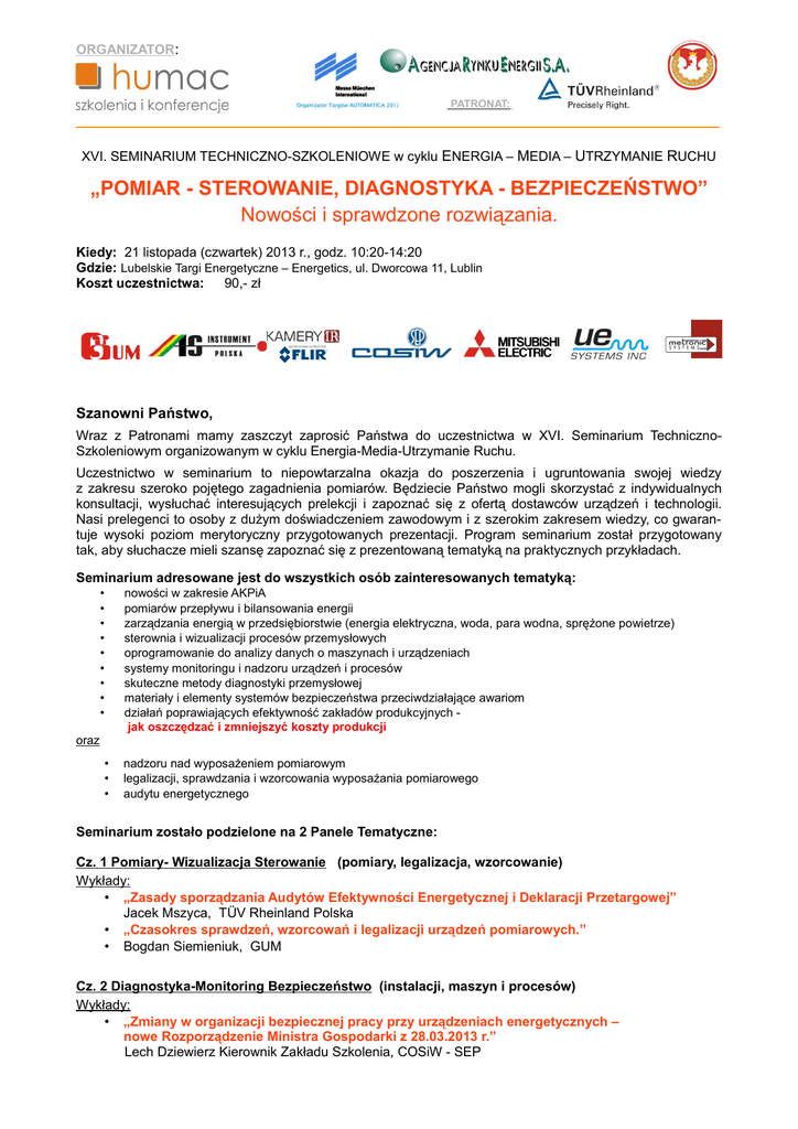 ORGANIZATOR: PATRONAT: ________________________________________________________________________ XVI. SEMINARIUM TECHNICZNO-SZKOLENIOWE w cyklu ENERGIA – MEDIA – UTRZYMANIE RUCHU „POMIAR - STEROWANIE, DIAGNOSTYKA - BEZPIECZEŃSTWO” Nowości i sprawdzone rozwiązania. Kiedy: 21 listopada (czwartek) 2013 r., godz. 10:20-14:20 Gdzie: Lubelskie Targi Energetyczne – Energetics, ul. Dworcowa 11, Lublin Koszt uczestnictwa: 90,- zł Szanowni Państwo, Wraz z Patronami mamy zaszczyt zaprosić Państwa do uczestnictwa w XVI. Seminarium TechnicznoSzkoleniowym organizowanym w cyklu Energia-Media-Utrzymanie Ruchu. Uczestnictwo w seminarium to niepowtarzalna okazja do poszerzenia i ugruntowania swojej wiedzy z zakresu szeroko pojętego zagadnienia pomiarów. Będziecie Państwo mogli skorzystać z indywidualnych konsultacji, wysłuchać interesujących prelekcji i zapoznać się z ofertą dostawców urządzeń i technologii. Nasi prelegenci to osoby z dużym doświadczeniem zawodowym i z szerokim zakresem wiedzy, co gwarantuje wysoki poziom merytoryczny przygotowanych prezentacji. Program seminarium został przygotowany tak, aby słuchacze mieli szansę zapoznać się z prezentowaną tematyką na praktycznych przykładach. Seminarium adresowane jest do wszystkich osób zainteresowanych tematyką: nowości w zakresie AKPiA pomiarów przepływu i bilansowania energii zarządzania energią w przedsiębiorstwie (energia elektryczna, woda, para wodna, sprężone powietrze) sterownia i wizualizacji procesów przemysłowych oprogramowanie do analizy danych o maszynach i urządzeniach systemy monitoringu i nadzoru urządzeń i procesów skuteczne metody diagnostyki przemysłowej materiały i elementy systemów bezpieczeństwa przeciwdziałające awariom działań poprawiających efektywność zakładów produkcyjnych jak oszczędzać i zmniejszyć koszty produkcji • • • • • • • • • oraz • • • nadzoru nad wyposażeniem pomiarowym legalizacji, sprawdzania i wzorcowania wyposażania pomiarowego audytu energetycznego Seminarium zostało podzielone na 2 Panele Tematyczne: Cz. 1 Pomiary- Wizualizacja Sterowanie (pomiary, legalizacja, wzorcowanie) Wykłady: • „Zasady sporządzania Audytów Efektywności Energetycznej i Deklaracji Przetargowej” Jacek Mszyca, TÜV Rheinland Polska • „Czasokres sprawdzeń, wzorcowań i legalizacji urządzeń pomiarowych.” • Bogdan Siemieniuk, GUM Cz. 2 Diagnostyka-Monitoring Bezpieczeństwo (instalacji, maszyn i procesów) Wykłady: • „Zmiany w organizacji bezpiecznej pracy przy urządzeniach energetycznych – nowe Rozporządzenie Ministra Gospodarki z 28.03.2013 r.” Lech Dziewierz Kierownik Zakładu Szkolenia, COSiW - SEP WYKŁADOWCY m. in.: „Zasady sporządzania audytów efektywności energetycznej i deklaracji przetargowej” Jacek Mszyca, TÜV Rheinland Polska, Rzeczoznawca w Branży Ochrony Środowiska i Energetyki, audytor jednostek kogeneracji TÜV Rheinland Polska. Członek Zrzeszenia Audytorów Energetycznych. Absolwent Wydziału Inżynierii Środowiska i Energetyki Politechniki Śląskiej w Gliwicach oraz MBA University of Central Lancashire w Preston i studiów podyplomowych z zakresu audytingu energetycznego. Posiada wieloletnie, praktyczne doświadczenie w realizacji usług dotyczących efektywności energetycznej, w tym kogeneracji, audytów energetycznych oraz organizacji i zarządzania przedsiębiorstwem energetycznym. Autor i współautor kilkuset wdrożonych opracowań w obiektach przemysłowych, użyteczności publicznej i innych. Trener na szkoleniach z zakresu prawa energetycznego i audytu energetycznego. Omawiane zagadnienia: - zasady sporządzania audytów efektywności energetycznej i tryb ich weryfikacji - warunki i tryb przeprowadzania przetargów w celu wyboru przedsięwzięć służących poprawie efektywności energetycz. - zasady sporządzania deklaracji przetargowej -analiza doświadczeń na podstawie pierwszego przetargu ogłoszonego przez Prezesa URE w dn. 31.12.2012 r. „Czasokres sprawdzeń, wzorcowań i legalizacji urządzeń pomiarowych.” Bogdan Siemieniuk, Prezes GUM Sp. z o.o. - firmy prowadzącej badania i ekspertyzy techniczne skierowane na sprawdzanie, kalibrację i wzorcowanie przyrządów pomiarowych, posiada własne Laboratorium Wzorcujące. Równocześnie prowadzi działania polegające na inicjowaniu i aktywnym uczestnictwie w opracowywaniu, opiniowaniu lub postulowaniu zmian aktów prawnych dotyczących metrologii, a w szczególności wymagań stawianych przyrządom pomiarowym. Członek – założyciel i wiceprezes Związku Pracodawców Producentów Urządzeń Pomiarowych METROLOGIA, Prezes Stowarzyszenia Producentów Wag w Polsce. Członek CECIP (European Association for National Trade Organisations Representing the European Manufacturers of Weighing Instruments). 1. 2. 3. 4. 6. 7. 8. 9. Omawiane zagadnienia: normy stosowane do nadzoru nad wyposażeniem pomiarowym PN-EN ISO 9001:2009 Systemy zarządzania jakością – wymagania nadzorowanie wyposażenia do monitorowania i pomiarów - wzorcowanie, sprawdzanie, adjustacja klasyfikacja wyposażenia kontrolno-pomiarowego (przyrząd pomiarowy, wzorzec jednostki miary, państwowy wzorzec jednostki miary) spójność pomiarowa - postępowanie z niezgodnościami formy Kontroli Metrologicznej (prawna kontrola metrologiczna, kontrola przemysłowa) wymagania MID (dyrektywa o przyrządach pomiarowych z 31 marca 2004 r.) dyrektywa Nowego Podejścia Paweł Rutkowski, kameryIR - Przedstawicielstwo Handlowe FLIR Systems. Od 20 lat na rynku termowizji, od początku związany z liderem w technologii termowizji firmą FLIR Systems. Autor kilku publikacji z zakresu wykorzystania kamer w utrzymaniu ruchu, budownictwie i przemyśle. Specjalizuje się w doborze, wdrożeniu i szkoleniach dotyczących kamer termowizyjnych i ich wykorzystania. Prezentowane zagadnienia: „Przegląd Kamer termowizyjnych dla przemysłu i energetyki” Andrzej Kurdziel, dy