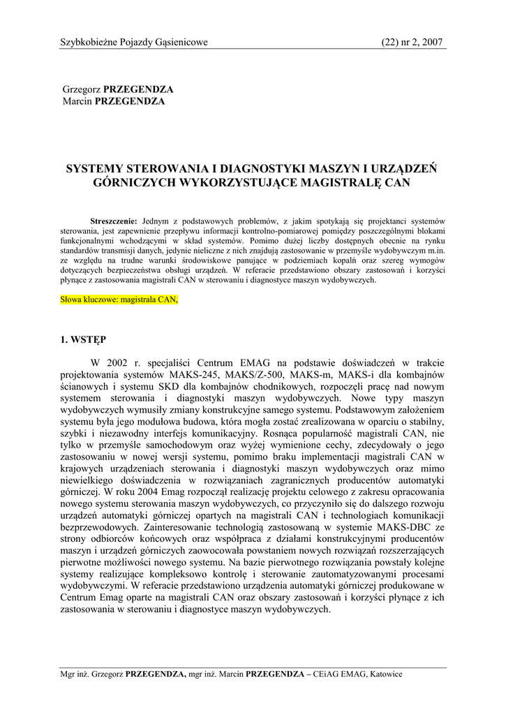 Szybkobieżne Pojazdy Gąsienicowe (22) nr 2, 2007 Grzegorz PRZEGENDZA Marcin PRZEGENDZA SYSTEMY STEROWANIA I DIAGNOSTYKI MASZYN I URZĄDZEŃ GÓRNICZYCH WYKORZYSTUJĄCE MAGISTRALĘ CAN Streszczenie: Jednym z podstawowych problemów, z jakim spotykają się projektanci systemów sterowania, jest zapewnienie przepływu informacji kontrolno-pomiarowej pomiędzy poszczególnymi blokami funkcjonalnymi wchodzącymi w skład systemów. Pomimo dużej liczby dostępnych obecnie na rynku standardów transmisji danych, jedynie nieliczne z nich znajdują zastosowanie w przemyśle wydobywczym m.in. ze względu na trudne warunki środowiskowe panujące w podziemiach kopalń oraz szereg wymogów dotyczących bezpieczeństwa obsługi urządzeń. W referacie przedstawiono obszary zastosowań i korzyści płynące z zastosowania magistrali CAN w sterowaniu i diagnostyce maszyn wydobywczych. Słowa kluczowe: magistrala CAN, 1. WSTĘP W 2002 r. specjaliści Centrum EMAG na podstawie doświadczeń w trakcie projektowania systemów MAKS-245, MAKS/Z-500, MAKS-m, MAKS-i dla kombajnów ścianowych i systemu SKD dla kombajnów chodnikowych, rozpoczęli pracę nad nowym systemem sterowania i diagnostyki maszyn wydobywczych. Nowe typy maszyn wydobywczych wymusiły zmiany konstrukcyjne samego systemu. Podstawowym założeniem systemu była jego modułowa budowa, która mogła zostać zrealizowana w oparciu o stabilny, szybki i niezawodny interfejs komunikacyjny. Rosnąca popularność magistrali CAN, nie tylko w przemyśle samochodowym oraz wyżej wymienione cechy, zdecydowały o jego zastosowaniu w nowej wersji systemu, pomimo braku implementacji magistrali CAN w krajowych urządzeniach sterowania i diagnostyki maszyn wydobywczych oraz mimo niewielkiego doświadczenia w rozwiązaniach zagranicznych producentów automatyki górniczej. W roku 2004 Emag rozpoczął realizację projektu celowego z zakresu opracowania nowego systemu sterowania maszyn wydobywczych, co przyczyniło się do dalszego rozwoju urządzeń automatyki górniczej opartych na magistrali CAN i technologiach komunikacji bezprzewodowych. Zainteresowanie technologią zastosowaną w systemie MAKS-DBC ze strony odbiorców końcowych oraz współpraca z działami konstrukcyjnymi producentów maszyn i urządzeń górniczych zaowocowała powstaniem nowych rozwiązań rozszerzających pierwotne możliwości nowego systemu. Na bazie pierwotnego rozwiązania powstały kolejne systemy realizujące kompleksowo kontrolę i sterowanie zautomatyzowanymi procesami wydobywczymi. W referacie przedstawiono urządzenia automatyki górniczej produkowane w Centrum Emag oparte na magistrali CAN oraz obszary zastosowań i korzyści płynące z ich zastosowania w sterowaniu i diagnostyce maszyn wydobywczych. Mgr inż. Grzegorz PRZEGENDZA, mgr inż. Marcin PRZEGENDZA – CEiAG EMAG, Katowice Grzegorz PRZEGENDZA, Marcin PRZEGENDZA 2. PRZEGLĄD URZĄDZEŃ WYKORZYSTUJĄCYCH MAGISTRALĘ CAN PRODUKOWANYCH W CENTRUM EMAG 2.1. Sterowniki dedykowane Blok Komunikacji i Przetwarzania Danych (BKP-i) przeznaczony jest przede wszystkim do stosowania w wielomodułowych systemach sterowania i kontroli pracy maszyn pracujących w podziemiach kopalń lub w części ich instalacji powierzchniowych, w których prawdopodobne jest wystąpienie zagrożenia wybuchem metanu i/lub pyłu węglowego. BKP-i zapewnia współpracę z innymi urządzeniami wchodzącymi w skład systemu, koordynuje działanie urządzeń składowych systemu, zapewnia realizację funkcji sterowniczych maszyny wg ustalonego algorytmu. Ponadto steruje transmisją danych pomiędzy urządzeniami połączonymi magistralą szeregowej wymiany danych CAN lub RS-485, rejestruje dane o stanie pracy maszyny w pamięci lokalnej i zapewnia wymianę danych poprzez łącze radiowe. Rys.1. Blok Komunikacji i Przetwarzania Danych BKP-i Pulpit Operatorski (POp-1) może być stosowany jako urządzenie samodzielne oraz pełnić funkcję jednostki centralnej i interfejsu operatora w rozproszonych systemach sterowania i monitorowania maszyn pracujących w podziemnych wyrobiskach zakładów górniczych w polach niemetanowych i metanowych, zgodnie z właściwościami określonymi cechą budowy przeciwwybuchowej EEx ib. W systemach sterowania i monitorowania maszyn pulpit POp-1 pełni funkcję interfejsu operatora pozwalającego na zdalne monitorowanie pracy i urządzeń do niego podłączonych za pomocą magistrali systemowej. Dane docierające do pulpitu operatorskiego mogą być przesyłane do systemu nadrzędnego lub przechowywane w wewnętrznej karcie pamięci. Rys.2. Pulpit Operatorski POp-1 2.2. Iskrobezpieczne koncentratory i urządzenia wykonawcze Blok Sterowania Hydrauliki i Kontroli Mechanizmów (BSHkm) jest urządzeniem przeznaczonym do sterowania hydrauliki siłowej oraz kontroli parametrów pracy maszyn i urządzeń wykorzystywanych w procesie wydobywczym. Układ przeznaczony jest do montażu na korpusie maszyny wydobywczej w strefie chronionej przed narażeniami mechanicznymi. 2 Systemy sterowania i diagnostyki maszyn i urządzeń górniczych wykorzystujące magistralę CAN Rys.3. Blok Sterowania Hydrauliki i Kontroli Mechanizmów BSHkm Moduł BSHkm posiada pięć wyjść sterujących do podłączenia iskrobezpiecznych rozdzielaczy elektrohydraulicznych. Blok BSHkm umożliwia podłączenie 12 czujników w wykonaniu iskrobezpiecznym oraz posiada dwa wyprowadzenia magistrali zasilania +5VDC, +12VDC i magistrali komunikacyjnej. Podstawowymi funkcjami realizowanymi przez BSHkm są: komunikacja z pozostałymi elementami systemu; wysterowywanie i kontrola prądów elementów wykonawczych; obniżenie poboru mocy przez zmniejszenie prądu elementów wykonawczych; możliwość wykonywania pomiarów i wskazań: - analogowych i dwustanowych ciśnienia, - analogowych temperatur, - prędkości posuwu i położenia maszyny, - analogowego położenia ogona pompy, - poziomu oleju i temperatury w zbiorniku oleju, - dwustanowego przepływu wody, - inny