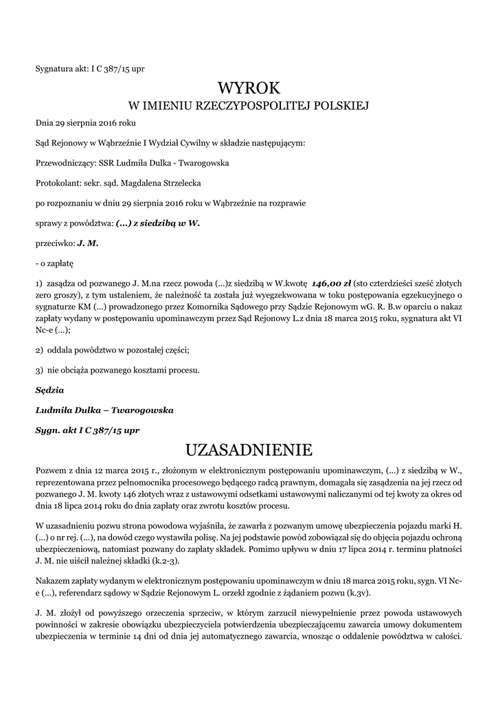 Sygnatura akt: I C 387/15 upr WYROK W IMIENIU RZECZYPOSPOLITEJ POLSKIEJ Dnia 29 sierpnia 2016 roku Sąd Rejonowy w Wąbrzeźnie I Wydział Cywilny w składzie następującym: Przewodniczący: SSR Ludmiła Dulka - Twarogowska Protokolant: sekr. sąd. Magdalena Strzelecka po rozpoznaniu w dniu 29 sierpnia 2016 roku w Wąbrzeźnie na rozprawie sprawy z powództwa: (...) z siedzibą w W. przeciwko: J. M. - o zapłatę 1) zasądza od pozwanego J. M.na rzecz powoda (...)z siedzibą w W.kwotę 146,00 zł (sto czterdzieści sześć złotych zero groszy), z tym ustaleniem, że należność ta została już wyegzekwowana w toku postępowania egzekucyjnego o sygnaturze KM (...) prowadzonego przez Komornika Sądowego przy Sądzie Rejonowym wG. R. B.w oparciu o nakaz zapłaty wydany w postępowaniu upominawczym przez Sąd Rejonowy L.z dnia 18 marca 2015 roku, sygnatura akt VI Nc-e (...); 2) oddala powództwo w pozostałej części; 3) nie obciąża pozwanego kosztami procesu. Sędzia Ludmiła Dulka – Twarogowska Sygn. akt I C 387/15 upr UZASADNIENIE Pozwem z dnia 12 marca 2015 r., złożonym w elektronicznym postępowaniu upominawczym, (...) z siedzibą w W., reprezentowana przez pełnomocnika procesowego będącego radcą prawnym, domagała się zasądzenia na jej rzecz od pozwanego J. M. kwoty 146 złotych wraz z ustawowymi odsetkami ustawowymi naliczanymi od tej kwoty za okres od dnia 18 lipca 2014 roku do dnia zapłaty oraz zwrotu kosztów procesu. W uzasadnieniu pozwu strona powodowa wyjaśniła, że zawarła z pozwanym umowę ubezpieczenia pojazdu marki H. (...) o nr rej. (...), na dowód czego wystawiła polisę. Na jej podstawie powód zobowiązał się do objęcia pojazdu ochroną ubezpieczeniową, natomiast pozwany do zapłaty składek. Pomimo upływu w dniu 17 lipca 2014 r. terminu płatności J. M. nie uiścił należnej składki (k.2-3). Nakazem zapłaty wydanym w elektronicznym postępowaniu upominawczym w dniu 18 marca 2015 roku, sygn. VI Nce (...), referendarz sądowy w Sądzie Rejonowym L. orzekł zgodnie z żądaniem pozwu (k.3v). J. M. złożył od powyższego orzeczenia sprzeciw, w którym zarzucił niewypełnienie przez powoda ustawowych powinności w zakresie obowiązku ubezpieczyciela potwierdzenia ubezpieczającemu zawarcia umowy dokumentem ubezpieczenia w terminie 14 dni od dnia jej automatycznego zawarcia, wnosząc o oddalenie powództwa w całości. Wskazał, że w dniu 18 maja 2014 r., tj. w dniu rozwiązania się dotychczasowej umowy, udał się do agenta ubezpieczeniowego, celem potwierdzenia kontynuacji ubezpieczenia OC pojazdu oraz poinformowania o nowym adresie swojego zamieszkania i zmianie numerów rejestracyjnych pojazdu. Agent poinformował wówczas pozwanego, że zawarta jest już tzw. umowa prolongacyjna o nr (...), na dowód czego wręczył mu potwierdzenie zawarcia umowy ubezpieczenia OC pojazdu, w którym wpisał aktualne miejsce jego zamieszkania i nowy numer rejestracyjny pojazdu. Wskazał jednocześnie, że nie może przyjąć od pozwanego należnej składki, a także, że oryginał nowo zawartej umowy wraz z polisą i dokumentem do dokonania opłaty J. M. otrzyma drogą pocztową na aktualny adres zamieszkania. Minął okres ubezpieczenia, a pozwany nie otrzymał powyższych dokumentów, ani monitu, w związku z czym nie posiadał wiedzy na temat warunków ubezpieczenia, wysokości składki, terminie i formie płatności (k.6-9v). Postanowieniem z dnia 16 września 2015 r. referendarz sądowy w Sądzie Rejonowym L., w związku ze stwierdzeniem skutecznego wniesienia sprzeciwu i utraty mocy nakazu zapłaty w całości, przekazał rozpoznanie sprawy do Sądu Rejonowego w Wąbrzeźnie (k. 15). W piśmie procesowym z dnia 02 marca 2016 roku (omyłkowo wskazany rok 2015) strona powodowa podtrzymała żądanie pozwu wskazując, że roszczenie z pozwu dotyczy nieopłaconej składki ubezpieczeniowej z tytułu automatycznie wznowionej umowy ubezpieczenia w trybie art. 28 ustawy z dnia 22 maja 2003 r. o ubezpieczeniach obowiązkowych, Ubezpieczeniowym Funduszu Gwarancyjnym i Polskim Biurze Ubezpieczycieli Komunikacyjnych (Dz. U. z 2003, Nr 124, poz. 1152) – wobec braku wypowiedzenia uprzedniej polisy nr (...) w terminie przewidzianym prawem (k. 62-63). Z kolei pozwany w następnych pismach przygotowawczych oraz na rozprawie podtrzymał swoje dotychczasowe stanowisko oraz zarzuty i argumentację. Dodatkowo podniósł, iż nie miał zamiaru wypowiedzieć umowy ubezpieczenia oraz, że posiadał wiedzę, że kolejna umowa zostanie wznowiona automatycznie, lecz nie znał jej szczegółów. Wskazał, że z dokumentów przedstawionych przez stronę powodową nie wynika dlaczego nie doszło do uaktualnienia jego danych adresowych, pomimo tego, że takowe dane przekazał agentowi ubezpieczeniowemu. Ponadto na rozprawie w dniu 16 czerwca 2016 roku zaznaczył że nie neguje swojego obowiązku uiszczenia składki ubezpieczeniowej dochodzonej pozwem, w tym jej wysokości, Kwestionuje jedynie żądanie pozwu w zakresie odsetek za opóźnienie oraz zwrotu kosztów procesu (k. 72, 77-79,86,94-95v,98-99). Pomimo zobowiązania pełnomocnika powoda przez Sąd do zajęcia stanowiska w zakresie zarzutów przedstawionych przez pozwanego w kolejnych pismach przygotowawczych, strona powodowa nie zajęła stanowiska (k.80,83, 106,109). Sprawa została rozpoznana w postępowaniu uproszczonym. Sąd ustalił co następuje: W dniu 23 maja 2013 roku (...) i J. M. zawarli umowę ubezpieczenia OC i (...) Standard motocykla marki H. (...) o nr rej. (...), na dowód czego wystawiona została polisa o nr (...), z okresem ubezpieczenia od 18 maja 2013 roku do 17 maja 2014 roku. Składkę w wysokości 139 zł pozwany uiścił jednorazowo gotówką w dniu zawarcia umowy, jednocześnie podając agentowi ubezpieczeniowemu aktualny adres korespondencyjny ((...)-(...) U., ul. (...)) - inny aniżeli wynikający z treści polisy ((...)-(...) G., ul. (...)), gdzie pozwany już nie zamieszkiwał. Odręczna