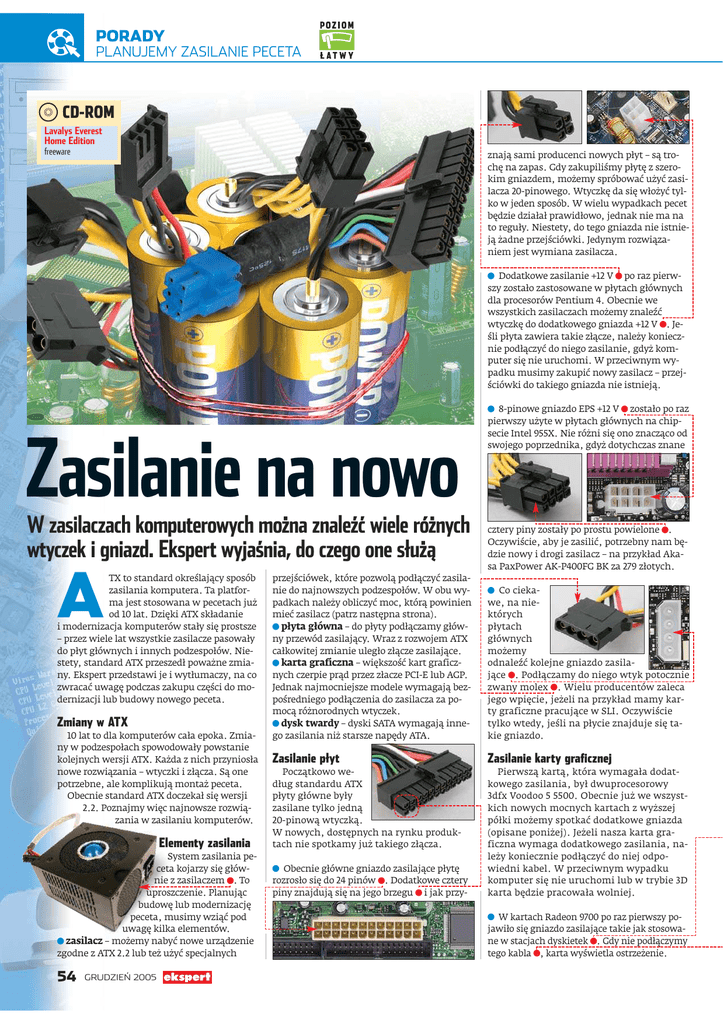 PORADY PLANUJEMY ZASILANIE PECETA CD-ROM Lavalys Everest Home Edition freeware znają sami producenci nowych płyt – są trochę na zapas. Gdy zakupiliśmy płytę z szerokim gniazdem, możemy spróbować użyć zasilacza 20-pinowego. Wtyczkę da się włożyć tylko w jeden sposób. W wielu wypadkach pecet będzie działał prawidłowo, jednak nie ma na to reguły. Niestety, do tego gniazda nie istnieją żadne przejściówki. Jedynym rozwiązaniem jest wymiana zasilacza. Dodatkowe zasilanie +12 V po raz pierwszy zostało zastosowane w płytach głównych dla procesorów Pentium 4. Obecnie we wszystkich zasilaczach możemy znaleźć wtyczkę do dodatkowego gniazda +12 V . Jeśli płyta zawiera takie złącze, należy koniecznie podłączyć do niego zasilanie, gdyż komputer się nie uruchomi. W przeciwnym wypadku musimy zakupić nowy zasilacz – przejściówki do takiego gniazda nie istnieją. Zasilanie na nowo W zasilaczach komputerowych moŜna znaleźć wiele róŜnych wtyczek i gniazd. Ekspert wyjaśnia, do czego one słuŜą A TX to standard określający sposób zasilania komputera. Ta platforma jest stosowana w pecetach już od 10 lat. Dzięki ATX składanie i modernizacja komputerów stały się prostsze – przez wiele lat wszystkie zasilacze pasowały do płyt głównych i innych podzespołów. Niestety, standard ATX przeszedł poważne zmiany. Ekspert przedstawi je i wytłumaczy, na co zwracać uwagę podczas zakupu części do modernizacji lub budowy nowego peceta. Zmiany w ATX 10 lat to dla komputerów cała epoka. Zmiany w podzespołach spowodowały powstanie kolejnych wersji ATX. Każda z nich przyniosła nowe rozwiązania – wtyczki i złącza. Są one potrzebne, ale komplikują montaż peceta. Obecnie standard ATX doczekał się wersji 2.2. Poznajmy więc najnowsze rozwiązania w zasilaniu komputerów. Elementy zasilania System zasilania peceta kojarzy się głównie z zasilaczem . To uproszczenie. Planując budowę lub modernizację peceta, musimy wziąć pod uwagę kilka elementów. zasilacz – możemy nabyć nowe urządzenie zgodne z ATX 2.2 lub też użyć specjalnych 54 GRUDZIEŃ 2005 8-pinowe gniazdo EPS +12 V zostało po raz pierwszy użyte w płytach głównych na chipsecie Intel 955X. Nie różni się ono znacząco od swojego poprzednika, gdyż dotychczas znane cztery piny zostały po prostu powielone . Oczywiście, aby je zasilić, potrzebny nam będzie nowy i drogi zasilacz – na przykład Akasa PaxPower AK-P400FG BK za 279 złotych. przejściówek, które pozwolą podłączyć zasilanie do najnowszych podzespołów. W obu wypadkach należy obliczyć moc, którą powinien mieć zasilacz (patrz następna strona). płyta główna – do płyty podłączamy główny przewód zasilający. Wraz z rozwojem ATX całkowitej zmianie uległo złącze zasilające. karta graficzna – większość kart graficznych czerpie prąd przez złacze PCI-E lub AGP. Jednak najmocniejsze modele wymagają bezpośredniego podłączenia do zasilacza za pomocą różnorodnych wtyczek. dysk twardy – dyski SATA wymagają innego zasilania niż starsze napędy ATA. Co ciekawe, na niektórych płytach głównych możemy odnaleźć kolejne gniazdo zasilające . Podłączamy do niego wtyk potocznie zwany molex . Wielu producentów zaleca jego wpięcie, jeżeli na przykład mamy karty graficzne pracujące w SLI. Oczywiście tylko wtedy, jeśli na płycie znajduje się takie gniazdo. Zasilanie płyt Zasilanie karty graficznej Początkowo według standardu ATX płyty główne były zasilane tylko jedną 20-pinową wtyczką. W nowych, dostępnych na rynku produktach nie spotkamy już takiego złącza. Pierwszą kartą, która wymagała dodatkowego zasilania, był dwuprocesorowy 3dfx Voodoo 5 5500. Obecnie już we wszystkich nowych mocnych kartach z wyższej półki możemy spotkać dodatkowe gniazda (opisane poniżej). Jeżeli nasza karta graficzna wymaga dodatkowego zasilania, należy koniecznie podłączyć do niej odpowiedni kabel. W przeciwnym wypadku komputer się nie uruchomi lub w trybie 3D karta będzie pracowała wolniej. Obecnie główne gniazdo zasilające płytę rozrosło się do 24 pinów . Dodatkowe cztery piny znajdują się na jego brzegu i jak przy- W kartach Radeon 9700 po raz pierwszy pojawiło się gniazdo zasilające takie jak stosowane w stacjach dyskietek . Gdy nie podłączymy tego kabla , karta wyświetla ostrzeżenie. Z biegiem czasu na kartach graficznych zaczęły się pojawiać gniazda, które spotykamy w dyskach twardych (molex). Problemy zaczęły się, gdy na rynek weszły karty na złączu PCI-Express. Wraz z nimi pojawiły się zupełnie dotąd nieznane 6-pinowe gniazda . Na szczęście obecnie wiele nowych zasilaczy zawiera odpowiednią wtyczkę . Przejściówki zamiast wymiany Co zrobić, gdy chcemy wymienić płytę na nowszą, a nie mamy zasilacza z odpowiednimi wtykami? Jeśli stwierdzimy, że nasz zasilacz nie poradzi sobie z obciążeniem generowanym przez nowy sprzęt (więcej informacji w dalszej części artykułu) – trzeba go wymienić. Jeśli jednak mamy wystarczająco mocny zasilacz, możemy po prostu dokupić odpowiednie przejściówki. W sprzedaży dostępne są zarówno przejściówki głównego kabla zasilającego 20 na 24 pin , jak i 24 na 20 pin. Kosztują od 10 do 25 złotych. Pierwsza z nich umożliwi nam zasilenie nowych płyt starym zasilaczem, natomiast druga – starszych urządzeń za pomocą nowego zasilacza. Dostępne są też przejściówki dla kart graficznych PCI-Express . Jedną z wtyczek podłączamy po prostu do standardowego moleksa. Cena około 15 złotych. Dyski Serial ATA również mają nowy rodzaj gniazda zasilającego (choć wiele urządzeń SATA ma także złącza molex). Jeśli nasz zasilacz nie został zaopatrzony w odpowiedni wtyk, taką przejściówkę możemy kupić już za około 10 złotych. Obliczamy wymaganą moc zasilacza Mówi się, że zasilacz do współczesnego peceta powinien mieć moc co najmnie