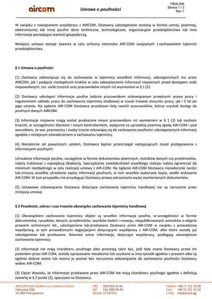 Umowa o poufności FB06.006 Strona 1 / 2 Rev 1 W związku z nawiązaniem współpracy z AIRCOM, Dostawcy udostępnione zostaną w formie ustnej, pisemnej, elektronicznej lub innej poufne dane techniczne, technologiczne, organizacyjne przedsiębiorstwa lub inne informacje posiadające wartość gospodarczą. Niniejsza umowa zostaje zawarta w celu ochrony interesów AIR-COM związanych z zachowaniem tajemnic przedsiębiorstwa. § 1 Umowa o poufności (1) Dostawca zobowiązuje się do zachowania w tajemnicy wszelkich informacji, udostępnionych mu przez AIRCOM, jak i podjęcia niezbędnych kroków w celu zabezpieczenia informacji niejawnych przed dostępem osób niepowołanych, tzn. osób trzecich oraz pracowników innych niż wymienieni w § 1 (2). (2) Dostawca udostępni informacje poufne jedynie pracownikom zobowiązanym przepisami prawa pracy i regulaminem zakładu pracy do zachowania tajemnicy służbowej w czasie trwania stosunku pracy, jak i 5 lat po jego ustaniu. Na żądanie AIR-COM Dostawca przedstawi listę swoich pracowników, którzy uzyskali dostęp do poufnych danych AIRCOM. (3) Informacje niejawne mogą zostać przekazane innym pracownikom niż wymienieni w § 1 (2) lub osobom trzecim, w szczególności klientom i innym kontrahentom, wyłącznie za uprzednią pisemną zgodą AIR-COM i pod warunkiem, że ww. pracownicy i osoby trzecie zobowiążą się do zachowania poufności udostępnionych informacji zgodnie z niniejszym oświadczeniem o zachowaniu tajemnicy. (4) Niezależnie od powyższych ustaleń, Dostawca będzie przestrzegał następujących zasad postępowania z informacjami poufnymi: Utrwalone informacje poufne, szczególnie w formie dokumentów pisemnych, nośników danych czy przedmiotów, należy traktować z największą dbałością. Sporządzanie zwielokrotnień wszelkiego rodzaju należy ograniczać do minimum niezbędnego w celu realizacji umowy z AIR-COM. Na żądanie AIR-COM Dostawca niezwłocznie zwróci lub zniszczy wszelkie utrwalone zapisy informacji poufnych, w tym wszelkie wykonane kopie, wedle wskazania AIR-COM. W tym przypadku nie przysługuje Dostawcy prawo zatrzymania wyżej wymienionych dokumentów. (5) Ustawowe zobowiązania Dostawcy dotyczące zachowania tajemnicy handlowej nie są naruszone przez niniejszą umowę. § 2 Przedmiot, zakres i czas trwania obowiązku zachowania tajemnicy handlowej (1) Obowiązkiem zachowania tajemnicy objęte są wszelkie informacje poufne, w szczególności w formie dokumentów, rysunków, danych, przedmiotów, wyników badań i rozwoju, niepublikowanych wniosków o objęcie prawami ochronnymi itd., udostępnione lub przekazane Dostawcy przez AIR-COM w związku z prowadzoną współpracą, w tym prowadzonymi negocjacjami dotyczącymi współpracy z AIR-COM, albo które zostały już udostępnione lub przekazane. Również ustne informacje, dotyczące współpracy, podlegają obowiązkowi zachowania tajemnicy. (2) Informacje nie mają charakteru poufnego albo przestają takie być, jeśli były znane Dostawcy przed ich podaniem przez AIR-COM, zostały opracowane niezależnie lub uzyskane w inny sposób zgodnie z prawem albo są ogólnie dobrze znane lub można je poznać bez naruszenia zobowiązania do zachowania poufności Dostawcy wobec AIR-COM. (3) Ciężar dowodu, że informacje przekazane przez AIR-COM nie mają charakteru poufnego zgodnie z definicją zawartą w § 2 punkt (2), spoczywa na Dostawcy. Umowa o poufności FB06.006 Strona 2 / 2 Rev 1 (4) Oświadczenie Dostawcy o zachowaniu tajemnicy obowiązuje przez czas nieokreślony. Strony mogą ją wypowiedzieć w formie pisemnej z zachowaniem 3-miesięcznego okresu wypowiedzenia. Zobowiązania wynikające z niniejszego porozumienia i dotyczące informacji poufnych udostępnionych Dostawcy w okresie jego obowiązywania pozostają niezmienione. § 3 Ograniczenia wykorzystania/ Prawa (1) Wszelkie prawa do poufnych informacji AIR-COM przysługują wyłącznie AIR-COM. Dostawca zobowiązuje się nie wykorzystywać otrzymanych od AIR-COM poufnych informacji, bez specjalnej wyraźnej pisemnej zgody AIRCOM, do celów własnych lub cudzych i/ani dochodzić w stosunku do nich roszczeń z zakresu prawa własności intelektualnej. W szczególności Dostawca nie jest uprawniony po zakończeniu współpracy z AIR-COM wykorzystywać zdobytych w czasie tej współpracy informacji dla swoich celów lub celów stron trzecich. (2) Jeśli na podstawie udostępnionych Dostawcy informacji poufnych lub za ich pomocą AIR-COM dokona zgłoszenia praw własności intelektualnej, Dostawca nie wystąpi o prawo pierwszeństwa wykorzystania naruszając nowatorski charakter wynalazku lub tajemnicę handlową. Dostawca nie będzie zgłaszał w stosunku do przekazanych mu informacji poufnych praw ani roszczeń, podnosząc zarzut posiadanych wcześniej praw do użytkowania ww. danych ani też wyrażając sprzeciw wobec zastrzeganiu informacji powszechnie dostępnych już wcześniej ani też nie będzie wnosił podobnych zarzutów i zastrzeżeń. § 4 Klauzula salwatoryjna W przypadku, gdy dowolna część niniejszego oświadczenia zostanie uznana za nieważną lub nieprawomocną lub zawierała lukę, fakt ten nie ma wpływu na ważność innych postanowień umowy. Zapis uznany za nieważny lub nieprawomocny zostanie zastąpiony zapisem, który w najlepszym stopniu odda znaczenie zakwestionowanego zapisu. Podobnie stosuje się w przypadku zapisów opuszczonych. § 5 Właściwość prawa i sąd właściwy dla umowy (1) Niniejsza umowa o zachowaniu tajemnicy handlowej podlega prawu niemieckiemu z wyłączeniem zwrotnego lub dalszego odesłania. Wyklucza się stosowanie Konwencji ONZ o umowach międzynarodowej sprzedaży towarów (CISG). (2) Wszelkie spory powstałe w związku z niniejszą umową będą rozstrzygane przez sąd właściwy miejscowo dla siedziby AIR-COM. AIR-COM ma prawo według swojego uznania poddawać rozstrzygnięcie spraw przed sądem właściwym miejscowo dla siedziby Dost
