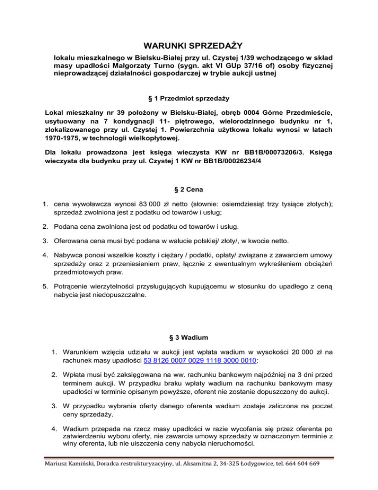 WARUNKI SPRZEDAŻY lokalu mieszkalnego w Bielsku-Białej przy ul. Czystej 1/39 wchodzącego w skład masy upadłości Małgorzaty Turno (sygn. akt VI GUp 37/16 of) osoby fizycznej nieprowadzącej działalności gospodarczej w trybie aukcji ustnej § 1 Przedmiot sprzedaży Lokal mieszkalny nr 39 położony w Bielsku-Białej, obręb 0004 Górne Przedmieście, usytuowany na 7 kondygnacji 11- piętrowego, wielorodzinnego budynku nr 1, zlokalizowanego przy ul. Czystej 1. Powierzchnia użytkowa lokalu wynosi w latach 1970-1975, w technologii wielkopłytowej. Dla lokalu prowadzona jest księga wieczysta KW nr BB1B/00073206/3. Księga wieczysta dla budynku przy ul. Czystej 1 KW nr BB1B/00026234/4 § 2 Cena 1. cena wywoławcza wynosi 83 000 zł netto (słownie: osiemdziesiąt trzy tysiące złotych); sprzedaż zwolniona jest z podatku od towarów i usług; 2. Podana cena zwolniona jest od podatku od towarów i usług. 3. Oferowana cena musi być podana w walucie polskiej/ złoty/, w kwocie netto. 4. Nabywca ponosi wszelkie koszty i ciężary / podatki, opłaty/ związane z zawarciem umowy sprzedaży oraz z przeniesieniem praw, łącznie z ewentualnym wykreśleniem obciążeń przedmiotowych praw. 5. Potrącenie wierzytelności przysługujących kupującemu w stosunku do upadłego z ceną nabycia jest niedopuszczalne. § 3 Wadium 1. Warunkiem wzięcia udziału w aukcji jest wpłata wadium w wysokości 20 000 zł na rachunek masy upadłości 53 8126 0007 0029 1118 3000 0010; 2. Wpłata musi być zaksięgowana na ww. rachunku bankowym najpóźniej na 3 dni przed terminem aukcji. W przypadku braku wpłaty wadium na rachunku bankowym masy upadłości w terminie opisanym powyższe, oferent nie zostanie dopuszczony do aukcji. 3. W przypadku wybrania oferty danego oferenta wadium zostaje zaliczona na poczet ceny sprzedaży. 4. Wadium przepada na rzecz masy upadłości w razie wycofania się przez oferenta po zatwierdzeniu wyboru oferty, nie zawarcia umowy sprzedaży w oznaczonym terminie z winy oferenta, lub nie uiszczenia ceny nabycia nieruchomości. Mariusz Kamiński, Doradca restrukturyzacyjny, ul. Aksamitna 2, 34-325 Łodygowice, tel. 664 604 669 5. W przypadku nie wybrania oferty danego oferenta wadium zwraca się niezwłocznie po zatwierdzeniu wyboru oferty przez Sędziego Komisarza, przy czym: a. Zwrot następuje w formie przelewu bankowego na podane przez oferenta w stosownym oświadczeniu konto bankowe, b. Za czas pozostawienia kwoty wadium na koncie upadłego, oferentowi nie należą się jakiekolwiek odsetki. § 4 Aukcja I 1. Aukcję prowadzi syndyk pod nadzorem Sędziego Komisarza. Aukcja odbędzie się w dniu 26.09.2016 r. o godzinie 12:00 w siedzibie Sądu Rejonowego Wydział VI Gospodarczy w Bielsku-Białej ul. Bogusławskiego 24, 43-300 Bielsko-Biała. 2. Oferenci biorą udział w posiedzeniu legitymującego się pełnomocnictwem. osobiście lub przez pełnomocnika, 3. Warunkiem dopuszczania oferenta do aukcji, oprócz wpłaty wadium jest uprzednie przedstawienie prowadzącemu aukcję przez oferenta pisemnego oświadczenia stwierdzającego, że: a. Akceptuje warunki Regulaminu Aukcji b. Zapoznał się ze stanem faktycznym i stanem prawnym przedmiotu przetargu i nie wnosi do niego zastrzeżeń oraz wyraża zgodę na wyłączenie rękojmi za wady fizyczne i prawne na zasadzie art. 5581§ k.c. II 1. Aukcja rozpoczyna się od przedstawienia przez syndyka przedmiotu aukcji. 2. Aukcja ma charakter ustny. 3. Aukcja odbywa się w ten sposób, że Syndyk rozpoczyna licytację od ceny wywoławczej. Uczestnicy aukcji oferują ceny wyższe z tym, że podwyższenie ceny nie może być mniejsze niż wynosi kwota postąpienia. 4. Kwotę postąpienia ustala się na kwotę nie niższą niż 2 000,00 zł (dwa tysiące złotych). 5. Syndyk wybiera ofertę tego uczestnika aukcji, który zaoferował najwyższą cenę, której po dwukrotnym powtórzeniu przez prowadzącego nikt z uczestników nie podwyższał- trzecie powtórzenie zaoferowanej ceny jest równoznaczne z jej przyjęciem. 6. Wybór oferty przez syndyka podlega zatwierdzeniu przez Sędziego Komisarza. Mariusz Kamiński, Doradca restrukturyzacyjny, ul. Aksamitna 2, 34-325 Łodygowice, tel. 664 604 669 § 5 Nabycie 1) Syndyk zawiadomi oferenta, którego oferta została wybrana o terminie zawarcia umowy kupna-sprzedaży. 2) Przed podpisaniem umowy oferent zobowiązany jest wpłacić resztę wylicytowanej ceny w terminie 45 dni od postanowienia sędziego-komisarza o zatwierdzeniu oferty oraz przystąpi do aktu notarialnego sprzedaży nie później niż w terminie kolejnych 30 dni licząc od dnia wpłaty reszty ceny pod rygorem przepadku wadium na rzecz masy upadłości. Przy czym rachunek bankowy masy upadłości musi być uznany najpóźniej w dniu poprzedzającym ustalony dzień podpisania umowy. 3) Zapłata ceny nabycia musi być dokonana przelewem bezpośrednio z rachunku bankowego oferenta. 4) Sprzedaż dokonana w postępowaniu upadłościowym ma skutki sprzedaży egzekucyjnej o obciążenia wygasają z mocy prawa na podstawie art. 313 ustawy Prawo upadłościowe. Syndyk zastrzega sobie prawo odwołania aukcji lub zmiany jej warunków przed jej rozpoczęciem. W sprawach nieuregulowanych niniejszym regulaminem stosuje się przepisy Kodeksu cywilnego z modyfikacjami wynikającymi z przepisów ustawy Prawo upadłościowe. Mariusz Kamiński, Doradca restrukturyzacyjny, ul. Aksamitna 2, 34-325 Łodygowice, tel. 664 604 669