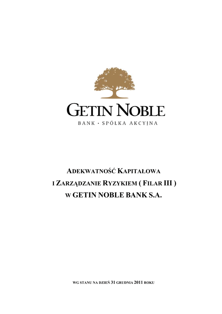 ADEKWATNOŚĆ KAPITAŁOWA I ZARZĄDZANIE RYZYKIEM ( FILAR III ) W GETIN NOBLE BANK S.A. WG STANU NA DZIEŃ 31 GRUDNIA 2011 ROKU SPIS TREŚCI 1. WSTĘP ....................................................................................................................................................... 4 1.1 INFORMACJE WPROWADZAJĄCE............................................................................................................ 4 1.2 DANE IDENTYFIKUJĄCE BANK ............................................................................................................... 4 1.3 PODSTAWY PRAWNE SPORZĄDZENIA INFORMACJI .................................................................................. 4 1.4 OKRES OBJĘTY UJAWNIENIEM ............................................................................................................... 5 2. CELE, ZASADY I METODY ZARZĄDZANIA POSZCZEGÓLNYMI RODZAJAMI RYZYKA ................................................ 5 2.1 PRZYJĘTE METODY I CELE ZARZĄDZANIA RYZYKIEM FINANSOWYM ........................................................... 5 2.2 RYZYKO KREDYTOWE ........................................................................................................................... 6 2.3 RYZYKO RYNKOWE .............................................................................................................................11 2.3.1 RYZYKO STOPY PROCENTOWEJ .................................................................................................... 11 2.3.2 RYZYKO WALUTOWE ..................................................................................................................12 2.4 RYZYKO PŁYNNOŚCI ...........................................................................................................................13 2.5 RYZYKO OPERACYJNE .........................................................................................................................15 3. NORMY OSTROŻNOŚCIOWE ........................................................................................................................19 3.1 JEDNOSTKI POMNIEJSZAJĄCE FUNDUSZE WŁASNE .................................................................................19 3.2 INFORMACJE O ISTNIEJĄCYCH LUB PRZEWIDYWANYCH PRZESZKODACH W SZYBKIM PRZEKAZANIU FUNDUSZY WŁASNYCH LUB SPŁACIE ZOBOWIĄZAŃ POMIĘDZY B ANKIEM A PODMIOTEM DOMINUJĄCYM LUB PODMIOTAMI ZALEŻNYMI. ...........................................................................................................19 3.3 ŁĄCZNA KWOTA NIEDOBORÓW KAPITAŁU WE WSZYSTKICH PODMIOTACH ZALEŻNYCH NIE OBJĘTYCH KONSOLIDACJĄ. .................................................................................................................................19 4. POZYCJE I SKŁADNIKI FUNDUSZY WŁASNYCH ................................................................................................19 5. KWOTA ORAZ SKŁADNIKI KAPITAŁU KRÓTKOTERMINOWEGO .........................................................................21 6. ADEKWATNOŚĆ KAPITAŁOWA ....................................................................................................................21 6.1 WYMÓG KAPITAŁOWY Z TYTUŁU RYZYKA KREDYTOWEGO .......................................................................21 6.1.1 PODZIAŁ EKSPOZYCJI GRUPY GETIN NOBLE BANK WEDŁUG WYCENY BILANSOWEJ NA KLASY EKSPOZYCJI ................................................................................................................................22 6.1.2 ŚREDNIA KWOTA ZAANGAŻOWANIA W PODZIALE NA KLASY EKSPOZYCJI .........................................23 6.1.3 STRUKTURA GEOGRAFICZNA EKSPOZYCJI BILANSOWYCH NETTO W PODZIALE NA OBSZARY WAŻNE POD WZGLĘDEM ISTOTNYCH KLAS EKSPOZYCJI ..............................................................................23 6.1.4 STRUKTURA EKSPOZYCJI WEDŁUG OKRESÓW ZAPADALNOŚCI W PODZIALE NA KLASY EKSPOZYCJI ......25 6.1.5 STRUKTURA EKSPOZYCJI WEDŁUG TYPU KONTRAHENTA W ROZBICIU NA KLASY EKSPOZYCJI ..............26 6.1.6 KONCENTRACJA ZAANGAŻOWAŃ W GRUPIE GETIN NOBLE BANK S.A. WG SEGMENTACJI BRANŻOWEJ ..............................................................................................................................27 6.1.7 KWOTY EKSPOZYCJI Z ROZPOZNANĄ UTRATĄ WARTOŚCI (MSR) W PODZIALE NA TYPY KONTRAHENTÓW .......................................................................................................................27 6.1.8 KWOTY EKSPOZYCJI Z ROZPOZNANĄ UTRATĄ WARTOŚCI ( ZAGROŻONYCH) PREZENTOWANYCH W PODZIALE NA GŁÓWNE OBSZARY GEOGRAFICZNE WRAZ Z WYKAZANIEM KWOT KOREKT WARTOŚCI I ODPISÓW NA UTRATĘ WARTOŚCI W POSZCZEGÓLNYCH OBSZARACH GEOGRAFICZNYCH ....................27 6.1.9 SALDA KOREKT WARTOŚCI I ODPISÓW NA UTRATĘ WARTOŚCI W PODZIALE NA TYPY KONTRAHENTÓW .......................................................................................................................28 2 6.1.10 EKSPOZYCJE PRZETERMINOWANE W PODZIALE NA TYPY KONTRAHENTÓW ......................................28 6.1.11 EKSPOZYCJE PRZETERMINOWANE W PODZIALE NA GŁÓWNE OBSZARY GEOGRAFICZNE .....................28 6.1.12 EKSPOZYCJE, DLA KTÓRYCH STOSOWANE SĄ OCENY WIARYGODNOŚCI KREDYTOWEJ PRZYZNAWANE PRZEZ ZEWNĘTRZNE INSTYTUCJE WIARYGODNOŚCI KREDYTOWEJ I AGENCJE KREDYTÓW EKSPORTOWYCH. .......................................................................................................................29 6.1.13 WARTOŚĆ EKSPOZYCJI PRZED I PO ZASTOSOWANIU TECHNIK OGRANICZANIA RYZYKA KREDYTOWEGO DLA KAŻDEGO STOPNIA WIARYGODNOŚCI KREDYTOWEJ USTALONEGO DLA METODY STANDARDOWEJ ORAZ POZYCJI, KTÓRE STANOWIĄ POMNIEJSZENIA FUNDUSZY WŁASNYCH ................................................................................................................................29 6.2 WYMÓG KAPITAŁOWY Z TYTUŁU RYZYKA OPERACYJNEGO .........................................................