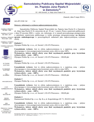 Zamość, dnia 9 maja 2014 r. AG-ZP.3320/ 24/ / 14 Dotyczy: informacji o wyborze najkorzystniejszej oferty. Samodzielny Publiczny Szpital Wojewódzki im. Papieża Jana Pawła II w Zamościu ul. Aleje Jana Pawła II 10, stosownie do art. 92 ust. 1 ustawy Prawo zamówień publicznych z dnia 29 stycznia 2004 r. z późn. zm. informuje, iż w ramach prowadzonego postępowania o udzielenie zamówienia publicznego w trybie przetargu nieograniczonego na dostawę sprzętu endoskopowego w poszczególnych zadaniach jako najkorzystniejszą wybrano ofertę: Zadanie 1 Olympus Polska Sp. z o.o., ul. Suwak 3, 02-676 Warszawa. Uzasadnienie wyboru: Jest to oferta najkorzystniejsza tj. z najniższą ceną – jedyne obowiązujące w tym postępowaniu kryterium oceny ofert to cena 100%. Wykonawcy, którzy złożyli oferty oraz ilość uzyskanych punktów przy kryterium wyboru oferty – cena – 100%: Olympus Polska Sp. z o.o., ul. Suwak 3, 02-676 Warszawa – 100,00 pkt Zadanie 2 Olympus Polska Sp. z o.o., ul. Suwak 3, 02-676 Warszawa. Uzasadnienie wyboru: Jest to oferta najkorzystniejsza tj. z najniższą ceną – jedyne obowiązujące w tym postępowaniu kryterium oceny ofert to cena 100%. Wykonawcy, którzy złożyli oferty oraz ilość uzyskanych punktów przy kryterium wyboru oferty – cena – 100%: Olympus Polska Sp. z o.o., ul. Suwak 3, 02-676 Warszawa – 100,00 pkt Zadanie 3 Olympus Polska Sp. z o.o., ul. Suwak 3, 02-676 Warszawa. Uzasadnienie wyboru: Jest to oferta najkorzystniejsza tj. z najniższą ceną – jedyne obowiązujące w tym postępowaniu kryterium oceny ofert to cena 100%. Wykonawcy, którzy złożyli oferty oraz ilość uzyskanych punktów przy kryterium wyboru oferty – cena – 100%: Olympus Polska Sp. z o.o., ul. Suwak 3, 02-676 Warszawa – 100,00 pkt Zadanie 4 Hammermed Medical Sp. z o.o. Sp. K-a, ul. Kopcińskiego 69/ 71, 90-032 Łódź. Uzasadnienie wyboru: Jest to oferta najkorzystniejsza tj. z najniższą ceną – jedyne obowiązujące w tym postępowaniu kryterium oceny ofert to cena 100%. Wykonawcy, którzy złożyli oferty oraz ilość uzyskanych punktów przy kryterium wyboru oferty – cena – 100%: Samodzielny Publiczny Szpital Wojewódzki im. Papieża Jana Pawła II w Zamościu AG-ZP.3320/ 24/ 14 - Informacja o wyborze ............... 1z3 Hammermed Medical Sp. z o.o. Sp. K-a, ul. Kopcińskiego 69/ 71, 90-032 Łódź – 100,00 pkt Zadanie 5 Hammermed Medical Sp. z o.o. Sp. K-a, ul. Kopcińskiego 69/ 71, 90-032 Łódź. Uzasadnienie wyboru: Jest to oferta najkorzystniejsza tj. z najniższą ceną – jedyne obowiązujące w tym postępowaniu kryterium oceny ofert to cena 100%. Wykonawcy, którzy złożyli oferty oraz ilość uzyskanych punktów przy kryterium wyboru oferty – cena – 100%: Hammermed Medical Sp. z o.o. Sp. K-a, ul. Kopcińskiego 69/ 71, 90-032 Łódź – 100,00 pkt Zadanie 6 Boston Scientific Polska Sp. z o.o., Al. Jana Pawła II 80, 00-175 Warszawa. Uzasadnienie wyboru: Jest to oferta najkorzystniejsza tj. z najniższą ceną – jedyne obowiązujące w tym postępowaniu kryterium oceny ofert to cena 100%. Wykonawcy, którzy złożyli oferty oraz ilość uzyskanych punktów przy kryterium wyboru oferty – cena – 100%: Boston Scientific Polska Sp. z o.o., Al. Jana Pawła II 80, 00-175 Warszawa – 100,00 pkt. Hammermed Medical Sp. z o.o. Sp. K-a, ul. Kopcińskiego 69/ 71, 90-032 Łódź – 92,77 pkt Zadanie 7 Olympus Polska Sp. z o.o., ul. Suwak 3, 02-676 Warszawa. Uzasadnienie wyboru: Jest to oferta najkorzystniejsza tj. z najniższą ceną – jedyne obowiązujące w tym postępowaniu kryterium oceny ofert to cena 100%. Wykonawcy, którzy złożyli oferty oraz ilość uzyskanych punktów przy kryterium wyboru oferty – cena – 100%: Olympus Polska Sp. z o.o., ul. Suwak 3, 02-676 Warszawa – 100,00 pkt Zadanie 8 Hammermed Medical Sp. z o.o. Sp. K-a, ul. Kopcińskiego 69/ 71, 90-032 Łódź. Uzasadnienie wyboru: Jest to oferta najkorzystniejsza tj. z najniższą ceną – jedyne obowiązujące w tym postępowaniu kryterium oceny ofert to cena 100%. Wykonawcy, którzy złożyli oferty oraz ilość uzyskanych punktów przy kryterium wyboru oferty – cena – 100%: Hammermed Medical Sp. z o.o. Sp. K-a, ul. Kopcińskiego 69/ 71, 90-032 Łódź – 100,00 pkt Zadanie 9 Hammermed Medical Sp. z o.o. Sp. K-a, ul. Kopcińskiego 69/ 71, 90-032 Łódź. Uzasadnienie wyboru: Jest to oferta najkorzystniejsza tj. z najniższą ceną – jedyne obowiązujące w tym postępowaniu kryterium oceny ofert to cena 100%. Wykonawcy, którzy złożyli oferty oraz ilość uzyskanych punktów przy kryterium wyboru oferty – cena – 100%: Hammermed Medical Sp. z o.o. Sp. K-a, ul. Kopcińskiego 69/ 71, 90-032 Łódź – 100,00 pkt Zadanie 11 Hammermed Medical Sp. z o.o. Sp. K-a, ul. Kopcińskiego 69/ 71, 90-032 Łódź. Samodzielny Publiczny Szpital Wojewódzki im. Papieża Jana Pawła II w Zamościu AG-ZP.3320/ 24/ 14 - Informacja o wyborze ............... 2z3 Uzasadnienie wyboru: Jest to oferta najkorzystniejsza tj. z najniższą ceną – jedyne obowiązujące w tym postępowaniu kryterium oceny ofert to cena 100%. Wykonawcy, którzy złożyli oferty oraz ilość uzyskanych punktów przy kryterium wyboru oferty – cena – 100%: Hammermed Medical Sp. z o.o. Sp. K-a, ul. Kopcińskiego 69/ 71, 90-032 Łódź – 100,00 pkt Umowy zostaną zawarta w terminie określonym w art. 94 ust. 2 pkt 3 lit. a) ustawy Prawo zamówień publicznych. Jednocześnie zamawiający informuje, iż przedmiotowe postępowanie zostało unieważnione w zadaniu nr 10. Uzasadnienie faktyczne i prawne: W wymienionym zadaniu nie złożono żadnej oferty. Podstawa prawna unieważnienia postępowania w zadaniu 10 – art. 93 ust. 1 pkt. 1 ustawy Pzp, który brzmi: „Zamawiający unieważnia postępowanie o udzielenie zamówienia, jeżeli nie złożono żadnej oferty niepodlegającej odrzuceniu albo nie wpłynął żaden wniosek o dopuszczenie do udziału w postępowaniu od wykonawcy nie