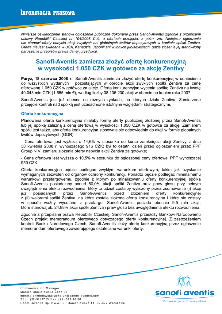 Informacja prasowa Niniejsze oświadczenie stanowi ogłoszenie publiczne dokonane przez Sanofi-Aventis zgodnie z przepisami ustawy Republiki Czeskiej nr 104/2008 Coll. o ofertach przejęcia, z późn. zm. Niniejsze ogłoszenie nie stanowi oferty nabycia akcji zwykłych ani globalnych kwitów depozytowych w kapitale spółki Zentiva. Oferta nie jest składana w USA, Kanadzie, Japonii ani w innych jurysdykcjach, gdzie złożenie jej stanowiłoby naruszenie przepisów prawa danej jurysdykcji. Sanofi-Aventis zamierza złożyć ofertę konkurencyjną w wysokości 1.050 CZK w gotówce za akcję Zentivy Paryż, 18 czerwca 2008 r.: Sanofi-Aventis zamierza złożyć ofertę konkurencyjną w odniesieniu do wszystkich wydanych i pozostających w obrocie akcji zwykłych spółki Zentiva za cenę oferowaną 1.050 CZK w gotówce za akcję. Oferta konkurencyjna wycenia spółkę Zentiva na kwotę 40.043 mln CZK (1.655 mln €), według liczby 38.136.230 akcji w obrocie na koniec roku 2007. Sanofi-Aventis jest już obecna na różnych rynkach, na których działa Zentiva. Zamierzone przejęcie kontroli nad spółką jest uzasadnione istotnymi względami strategicznymi. Oferta konkurencyjna Planowana oferta konkurencyjna miałaby formę oferty publicznej złożonej przez Sanofi-Aventis lub jej spółkę zależną z ceną ofertową w wysokości 1.050 CZK w gotówce za akcję. Zamiarem spółki jest także, aby oferta konkurencyjna stosowała się odpowiednio do akcji w formie globalnych kwitów depozytowych (GDR). - Cena ofertowa jest wyższa o 14,6% w stosunku do kursu zamknięcia akcji Zentivy z dnia 30 kwietnia 2008 r. wynoszącego 916 CZK; był to ostatni dzień przed ogłoszeniem przez PPF Group N.V. zamiaru złożenia oferty nabycia akcji Zentiva za gotówkę; - Cena ofertowa jest wyższa o 10,5% w stosunku do ogłoszonej ceny ofertowej PPF wynoszącej 950 CZK. Oferta konkurencyjna będzie podlegać zwykłym warunkom ofertowym, takim jak uzyskanie wymaganych zezwoleń od organów ochrony konkurencji. Ponadto będzie podlegać minimalnemu warunkowi przetargowemu, zgodnie z którym po sfinalizowaniu oferty konkurencyjnej spółka Sanofi-Aventis posiadałaby ponad 50,0% akcji spółki Zentiva oraz praw głosu przy pełnym uwzględnieniu efektu rozwodnienia, który to udział zostałby wyliczony przez zsumowanie (i) akcji już posiadanych przez Sanofi-Aventis przed złożeniem oferty konkurencyjnej z (ii) walorami spółki Zentiva, na które została złożona oferta konkurencyjna i które nie zostały w sposób ważny wycofane z przetargu. Sanofi-Aventis posiada obecnie 9,5 mln akcji, które stanową ok. 24,88% akcji spółki Zentiva i praw głosu bez uwzględnienia efektu rozwodnienia. Zgodnie z przepisami prawa Republiki Czeskiej, Sanofi-Aventis przedłoży Bankowi Narodowemu Czech projekt memorandum ofertowego dotyczącego oferty konkurencyjnej. Z zastrzeżeniem kontroli Banku Narodowego Czech, Sanofi-Aventis złoży ofertę konkurencyjną przez ogłoszenie memorandum ofertowego zawierającego ostateczne warunki oferty. Communication Manager: Monika Chmielewska-Żehaluk [email protected] T E L . : ( 22) 541 47 53 F A X : ( 2 2 ) 5 4 1 4 8 8 8 Sanofi-Aventis Sp. z o.o., ul. Domaniewska 41, 02-672 Warszawa Informacje o Sanofi-Aventis Sanofi-Aventis jest jedną z największych na świecie firm farmaceutycznych. Dysponując ogólnoświatową organizacją badań i rozwoju, firma Sanofi-Aventis zajmuje czołowe pozycje w siedmiu głównych obszarach terapeutycznych: leków stosowanych w chorobach układu krążenia, zakrzepicy, onkologii, chorobach metabolicznych, chorobach ośrodkowego układu nerwowego, chorobach wewnętrznych oraz szczepionek. Firma Sanofi-Aventis jest notowana na giełdach w Paryżu (EURONEXT: SAN) oraz w Nowym Jorku (NYSE: SNY). W Polsce, w wyniku formalno-prawnego połączenia spółek Sanofi-Synthelabo i Aventis Pharma 4 kwietnia 2006 roku, została powołana nowa spółka o nazwie Sanofi-Aventis Sp. z o.o. W wyniku połączenia powstał trzeci, co do wielkości koncern farmaceutyczny w Polsce. Firma zatrudnia blisko 900 osób, w tym 180 we własnym zakładzie produkcyjnym w Rzeszowie. Stwierdzenia odnoszące się do przyszłości Niniejszy komunikat prasowy zawiera stwierdzenia odnoszące się do przyszłości w rozumieniu amerykańskiej ustawy o reformie postępowania sądowego w sprawach związanych z prywatnymi papierami wartościowymi z roku 1995 (Private Securities Litigation Reform Act) w aktualnie obowiązującej wersji. W myśl tej definicji, stwierdzenia odnoszące się do przyszłości nie stanowią faktów historycznych. Stwierdzenia te zawierają przewidywania i oszacowania natury finansowej wraz z założeniami będącymi podstawą do ich wysnuwania, a także obejmują stwierdzenia dotyczące planów, celów, zamiarów i oczekiwań związanych z przyszłymi zdarzeniami, działaniami, produktami i usługami, oraz stwierdzenia dotyczące przyszłych wyników. Stwierdzenia odnoszące się do przyszłości zazwyczaj zawierają czasowniki typu „spodziewać się”, „oczekiwać”, „uważać, że...”, „zamierzać”, „szacować”, „planować” i temu podobne. Mimo iż zarząd firmy Sanofi-Aventis jest przekonany o tym, że oczekiwania zwerbalizowane w owych stwierdzeniach odnoszących się do przyszłości są uzasadnione, inwestorzy powinni zdawać sobie sprawę z tego, że informacje i stwierdzenia odnoszące się do przyszłości uzależnione są od rozlicznych form ryzyka i niepewności, z których wiele nie daje się przewidzieć i z których wiele znajduje się poza kontrolą SanofiAventis, oraz że owe formy ryzyka i niepewności mogą sprawić, że faktyczne wyniki i rozwój będą znacznie się różniły od tych, które podano, implikowano czy przewidywano w informacjach lub stwierdzeniach odnoszących się do przyszłości. Te czynniki ryzyka i niepewności obejmują kwestie omówione lub określone w publicznie dostępnej dokumentacji przedłożo