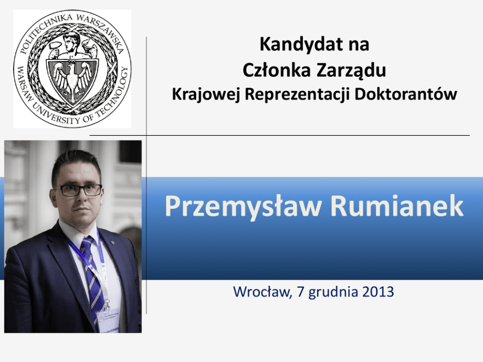Kandydat na Członka Zarządu Krajowej Reprezentacji Doktorantów Przemysław Rumianek zdjęcie Wrocław, 7 grudnia 2013 Wykształcenie Absolwent: • Wydział Samochodów i Maszyn Roboczych Politechniki Warszawskiej; Wspomaganie Komputerowe Prac Inżynierskich. Studia doktoranckie: • Wydział Samochodów i Maszyn Roboczych Politechniki Warszawskiej; Mechanika i Budowa Maszyn. Otwarty przewód doktorski: • „Symulacja rozpraszania energii w elementach ochrony pieszych” Doświadczenie • Przewodniczący Komisji Regulaminowej Rady Doktorantów PW, • Przewodniczący Odwoławczej Komisji Stypendialnej PW, • Wice Przewodniczący ds. Finansów Rady Doktorantów PW, • Członek Zarządu Rady Doktorantów PW, • Przewodniczący Wydziałowej Rady Doktorantów SiMR PW, • Członek Rady Wydziału, Komisji Rektorskich i Senackich PW, • Prelegent i organizator szkoleo z zakresu FPM Plan działania • Współpraca z podmiotami z sektora biznesu i gospodarki • Baza stypendialna (FPM, stypendia zewnętrzne) • Wizerunek (System Identyfikacji Wizualnej) • Zarządzanie działaniami - WikiKRD • Portal www.prawadoktoranta.pl (m.in. stypendia, kredyt, granty, zniżki, badania, staże międzynarodowe) Przemysław Rumianek Dziękuję