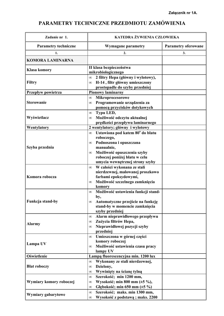 Załącznik nr 1A. PARAMETRY TECHNICZNE PRZEDMIOTU ZAMÓWIENIA Zadanie nr 1. KATEDRA śYWIENIA CZŁOWIEKA Parametry techniczne Wymagane parametry Parametry oferowane 1. 2. 3. KOMORA LAMINARNA Klasa komory Filtry Przepływ powietrza Sterowanie Wyświetlacz Wentylatory Szyba przednia Komora robocza Funkcja stand-by Alarmy Lampa UV Oświetlenie Blat roboczy Wymiary komory roboczej Wymiary gabarytowe II klasa bezpieczeństwa mikrobiologicznego • 2 filtry Hepa (główny i wylotowy), • H-14 , filtr główny umieszczony prostopadle do szyby przedniej Pionowy laminarny • Mikroprocesorowe • Programowanie urządzenia za pomocą przycisków dotykowych • Typu LED, • MoŜliwość odczytu aktualnej prędkości przepływu laminarnego 2 wentylatory; główny i wylotowy • Ustawiona pod katem 80o do blatu roboczego, • Podnoszona i opuszczana manualnie, • MoŜliwość opuszczenia szyby roboczej poniŜej blatu w celu umycia wewnętrznej strony szyby • W całości wykonana ze stali nierdzewnej, malowanej proszkowo farbami epoksydowymi, • MoŜliwość szczelnego zamknięcia komory • MoŜliwość ustawienia funkcji standby, • Automatyczne przejście na funkcję stand-by w momencie zamknięcia szyby przedniej • Alarm nieprawidłowego przepływu • ZuŜycia filtrów Hepa, • Nieprawidłowej pozycji szyby przedniej • Umieszczona w górnej części komory roboczej • MoŜliwość ustawienia czasu pracy lampy UV Lampą fluorescencyjna min. 1200 lux • Wykonany ze stali nierdzewnej, • Dzielony, • Wywinięty na ścianę tylną • Szerokość; min 1200 mm, • Wysokość; min 800 mm (±5 %), • Głębokość; min 650 mm (±5 %) • Szerokość; maks. min 1300 mm, • Wysokość z podstawą ; maks. 2200 WyposaŜenie Oferowana firma, typ, model mm, • Głębokość; maks. 800 min • Zawór gazu (umieszczony w bocznej ścianie komory roboczej), • Poziomowana podstawa, • Lampa UV, • 2 gniazda 230 V (umieszczone na ścianie tylnej) O parametrach nie gorszych niŜ MSC Advantage 1.2 1. Ilość szt. Cena brutto Zadanie nr 2. KATEDRA śYWIENIA CZŁOWIEKA Parametry techniczne 1. • MIKROSKOP BIOLOGICZNY ODWRÓCONY Optyka Nasadka Oświetlenie Diafragma Soczewka Wbudowane filtry Powiększenia Mechanizm Obiektywy Stolik Kondensor Wymagane parametry Parametry oferowane 2. 3. moŜliwość podłączenia kamery video i aparatów fotograficznych poprzez dodatkowy port optyczny foto/video, • moŜliwość obserwacji w jasnym polu i kontraście fazowym, • moŜliwość rozbudowy o fluorescencje Korygowana na nieskończoność f= 200 mm • Binokularna • o nachyleniu 30o • z regulacją dioptryjna • z regulacja rozstawu źrenic 53 – 75 mm • halogenowe • regulowane 6 V • 30 W z potencjometrem obrotowym polowa Sferyczna soczewka kondensująca Dyfuzyjny i cieplny • 100 x – 400x • moŜliwość rozbudowy do 800x Koaxialny mikro-makro z mechanizmem napięcia śrub oraz blokady wysokości stolika • Z korekcją na nieskończoność, • jasne pole i kontrast fazowy, • w uchwycie pięciopozycyjnym, • obiektyw 10 x/N.A. 0,25; W.D. 7,6 mm; F.L. = 20 mm, • obiektyw 40 x / N.A. 0,65; W.D. 2,8 mm; F.L. = 5,0 mm Płaski 180 x 247 mm • Do pola jasnego i kontrastu fazowego PH, • Z suwakiem PH i miejscem na filtry o średnicy 51 mm, • Oferowana firma, typ, model Na wyposaŜeniu suwak i filtr interferencyjny, zielony o średnicy 51 mm, • Kabel sieciowy O parametrach nie gorszych niŜ TC 5300 firmy MEIJI Japonia 1. Ilość szt. Cena brutto Zadanie nr 3. KATEDRA śYWIENIA CZŁOWIEKA Parametry techniczne Wymagane parametry Parametry oferowane 1. 2. 3. WIRÓWKA LABORATORYJNA Z chłodzeniem • Pojemność Prędkość/ Przyspieszenie Zakres temperatury Sterowanie Wyświetlacze Pamięć Stopnie hamowania i przyspieszania Wymiana rotorów Promień wirowniczy Funkcje wirowania Wymiary ( wys. x szer. x głęb.) Masa WyposaŜenie Oferowana firma, typ, model Ilość szt. Cena brutto w rotorze horyzontalnym minimum 4 x 280 ml, • w rotorze kątowym minimum 6 x 100 ml • prędkość ; min. 14 600 rpm • przyspieszenie; min. 23 000 x g • moŜliwość programowania obu parametrów od – 9 oC do + 40oC mikroprocesorowe Oddzielne wyświetlacze dla: prędkości, czasu wirowania, stopnia hamowania i przyspieszenia Minimum 5 programów wywoływanych bezpośrednio (programowanie czasu, prędkości, temperatury wirowania) Minimum 5 krzywych hamowania i przyspieszania Rotory mocowane do wału na automatyczny zamek zatrzaskowy, bez konieczności ich odkręcania i przykręcania (wał napędowy nie gwintowany) Funkcja manualnej korekcji promienia wirowniczego • Programowanie czasu wirowania od 30 s do 99 h, • Wirowanie ciągłe, • Funkcja krótkiego wirowania Nie większe niŜ 400 x 600 x 610 mm Nie większa niŜ 75 kg • Rotor horyzontalny na min. 16 próbek 50 ml i 15 ml falcon, min 4 000 rpm, wykonany ze stali, • Rotor kątowy 24 x 1,5/2 ml próbki Eppendorf , min 14 500 rpm, • Rotor horyzontalny na mikropłytki na 6 płytek, min. 4 000 rpm O parametrach nie gorszych niŜ IEC CL31R 1. Zadanie nr 4. KATEDRA śYWIENIA CZŁOWIEKA Parametry techniczne Wymagane parametry Parametry oferowane 1. 2. 3. WYTRZASARKA TYPU VORTEX Zakres obrotów Regulacja obrotów Uruchomienie Tryb pracy Masa Zasilanie Oferowana firma, typ, model Ilość szt. 0 – 300 rpm Płynna Przez włącznik lub dotknięcie probówką MoŜliwość ustawienia trybu pracy ciagłej Do 2 kg 230 V O parametrach nie gorszych niŜ FineVortex 1. Cena brutto Zadanie nr 5. KATEDRA śYWIENIA CZŁOWIEKA Parametry techniczne Wymagane parametry Parametry oferowane 1. 2. 3. KOŁYSKA LABORATORYJNA Prędkość Kontrola prędkości Kat wychylenia platformy Regulator czasu Wymiary Zasilanie Oferowana firma, typ, model Ilość szt. 0-50 rpm Płynna za pomocą pokrętła 9 stopni Z zakresem minimum 180 minut Min 290 x 200 mm 230 V O parametrach nie gorszych niŜ CR 100 1. Cena brutto Zadanie nr 6. KATEDRA śYWIENIA CZŁOWIEKA Parametry te