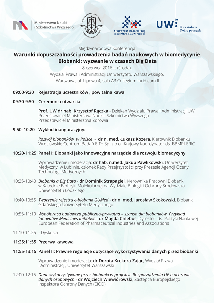 Międzynarodowa konferencja Warunki dopuszczalności prowadzenia badań naukowych w biomedycynie Biobanki: wyzwanie w czasach Big Data 8 czerwca 2016 r. (środa), Wydział Prawa i Administracji Uniwersytetu Warszawskiego, Warszawa, ul. Lipowa 4, sala A3 Collegium Iuridicum II 09:00-9:30 Rejestracja uczestników , powitalna kawa 09:30-9:50 Ceremonia otwarcia: Prof. UW dr hab. Krzysztof Rączka - Dziekan Wydziału Prawa i Administracji UW Przedstawiciel Ministerstwa Nauki i Szkolnictwa Wyższego Przedstawiciel Ministerstwa Zdrowia 9:50–10:20 Wykład inauguracyjny: Rozwój biobanków w Polsce - dr n. med. Łukasz Kozera, Kierownik Biobanku Wrocławskie Centrum Badań EIT+ Sp. z o.o., Krajowy Koordynator ds. BBMRI-ERIC 10:20-11:25 Panel I: Biobanki jako innowacyjne narzędzie dla rozwoju biomedycyny Wprowadzenie i moderacja: dr hab. n.med. Jakub Pawlikowski, Uniwersytet Medyczny w Lublinie, członek Rady Przejrzystości przy Prezesie Agencji Oceny Technologii Medycznych 10:25-10:40 Biobanki a Big Data - dr Dominik Strapagiel, Kierownika Pracowni Biobank w Katedrze Biofizyki Molekularnej na Wydziale Biologii i Ochrony Środowiska Uniwersytetu Łódzkiego 10:40-10:55 Tworzenie rejestru e-biobank GUMed - dr n. med. Jarosław Skokowski, Biobank Gdańskiego Uniwersytetu Medycznego 10:55-11:10 Współpraca badawcza publiczno-prywatna – szansa dla biobanków. Przykład Innovative Medicines Initiative - dr Magda Chlebus, Dyrektor ds. Polityki Naukowej European Federation of Pharmaceutical Industries and Associations 11:10-11:25 - Dyskusja 11:25:11:55 Przerwa kawowa 11:55-13:15 Panel II: Prawne regulacje dotyczące wykorzystywania danych przez biobanki Wprowadzenie i moderacja: dr Dorota Krekora-Zając, Wydział Prawa i Administracji, Uniwersytet Warszawski 12:00-12:15 Dane wykorzystywane przez biobanki w projekcie Rozporządzenia UE o ochronie danych osobowych - dr Wojciech Wiewiórowski, Zastępca Europejskiego Inspektora Ochrony Danych (EIOD) 12:15-12:30 Ochrona danych genetycznych w prawie polskim - dr Arwid Mednis, Wydział Prawa i Administracji Uniwersytet Warszawski 12:30-12:45 Praca nad regulacją prawną biobanków w Polsce - dr hab. Roman Sławeta, Ministerstwo Nauki i Szkolnictwa Wyższego 12:45-13:00 - Dyskusja 13:00-14:10 Panel III: Zalecenia i rekomendacje dotyczące wykorzystywania danych przez biobanki Wprowadzenie i moderacja: - prof. dr hab. n. med. Leszek Kalinowski, Kierownik Biobanku Gdańskiego Uniwersytetu Medycznego 13:05-13:20 BBMRI-NL 2.0: Holenderskie doświadczenia w kolekcjonowaniu próbek, danych i badań obrazowych – dr Jan-Willem Boiten, University of Groningen 13:25-13:40 Propozycje Światowego Stowarzyszenia Lekarzy w sprawie związanej z biobankowaniem - dr hab. n. med. Marek Czarkowski, Przewodniczący Ośrodka Bioetyki Naczelnej Rady Lekarskiej 13:40-13:55 Rekomendacje stosowane w pracy policji - Justyna Połomska, Zespół Baz Danych DNA Centralnego Laboratorium Kryminalistycznego Policji 13:55-14:10 - Dyskusja 14:10-14:50Lunch 14:50-16:10 Panel IV: Wyzwania stojące przed biobankami Wprowadzenie i moderacja: Thierry van de Wetering, Pomorski Uniwersytet Medyczny 14:55-15:10 Zgoda dynamiczna w badaniach CHRIS Study - dr Deborah Mascalzoni, Uniwersytet of Bolzano, Centre for Research Ethics & Bioethics University of Uppsala 15:10-15:25 Prawa dawców do autonomii i prywatności jako podstawa funkcjonowania biobanków - dr Dorota Krekora-Zając, Wydział Prawa i Administracji Uniwersytet Warszawski 15:25-15:40 Biobanki jako przyszłość nauki - prof. dr hab. Ewa Bartnik, Uniwersytet Warszawski, członek Międzynarodowej Komisji Bioetycznej UNESCO 15:40-15:55 Świadomość społeczna o biobankach - dr hab. Jakub Pawlikowski, Uniwersytet Medyczny w Lublinie, członek Rady Przejrzystości przy Prezesie Agencji Oceny Technologii Medycznych 15:55-16:10 - Dyskusja 16:10-16:30 Podsumowanie konferencji dr Dorota Krekora-Zając, Wydział Prawa i Administracji Uniwersytet Warszawski dr n. med. Łukasz Kozera, Kierownik Biobanku Wrocławskie Centrum Badań EIT+ Sp. z o.o., Krajowy Koordynator ds. BBMRI-ERIC