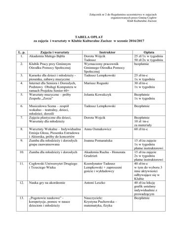 Załącznik nr 2 do Regulaminu uczestnictwa w zajęciach organizowanych przez Gminę Cegłów Klub Kulturalne Zacisze TABELA OPŁAT za zajęcia i warsztaty w Klubie Kulturalne Zacisze w sezonie 2016/2017 L. p. 1. Zajęcia i warsztaty Akademia Małego Bąbla 2. Klubik Pracy przy Gminnym Ośrodku Pomocy Społecznej 3. Karaoke dla dzieci i młodzieży piosenka, zabawy muzyczne Internet dla Seniora i Dorosłych, Podstawy Obsługi Komputera w ramach Projektu Senior 60+ Warsztaty muzyczne – próby Zespołu „Zorza” 4. 5. 6. 7. 8. 9. Musicalowa Scena – zespół wokalno – teatralny, dzieci, młodzież, dorośli Zajęcia plastyczne dla dzieci, Warsztaty dla młodzieży Instruktor Dorota Wójcik Tadeusz Wyznaczony pracownik Gminnego Ośrodka Pomocy Społecznej Tadeusz Lempkowski Mariusz Roguski Opłata 25 zł/1x w tygodniu 50 zł/2x w tygodniu bezpłatnie 25 zł/m-c 1x w tygodniu 30 zł/m-c 1x w tygodniu Jolanta Kowalczyk Bezpłatnie 1x w tygodniu Tadeusz Lempkowski Bezpłatnie Dorota Wojcik Bezpłatnie 10 zł /m-c za materiały 60 zł/m-c Warsztaty Wokalne – Indywidualna Anna Osmakowicz Emisja Głosu, Piosenka Estradowa i Aktorska, próby do koncertów Zumba dla młodzieży i dorosłych Joanna Pomarańska grupa zaawansowana 10. Zumba dla młodzieży i dorosłych Akademia Ruchu - Honorata Grudzień 11. Cegłowski Uniwersytet Drugiego i Trzeciego Wieku Koordynator Tadeusz Lempkowski + zaproszeni goście i wykładowcy 12. Nauka gry na akordeonie Antoni Leszko 13. „Pogotowie naukowe” korepetycje, pomoc w nauce dzieciom i młodzieży Nauczyciele: Krystyna Puchowska – matematyka, fizyka 15 zł/za zajęcie 1x w tygodniu płatne instruktorowi 15 zł/za zajęcie 2x w tygodniu płatne instruktorowi 40 zł/m-c w tym do wyboru 3 inne aktywności odbywające się w Klubie 40 zł/za lekcję grafik ustalany indywidualnie z prowadzącym Bezpłatnie Zespół taneczny – dla dzieci i młodzieży z elementami Tańca Nowoczesnego, Disco, Zumby i innych stylów Warsztaty twórcze i rękodzieła, wiklina papierowa dla młodzieży i dorosłych „New York” - taniec użytkowy dla dorosłych, nauka podstawowych figur w stylach Disco, Rock,n Roll, Samba, Cha-cha, Walc Angielski i Wiedeński, Rumba i inne Studio MAKO - Taniec Towarzyski dla dzieci i młodzieży Nauka gry na perkusji i instrumentach perkusyjnych Akademia Ruchu - Honorata Grudzień 30 zł/m-c 1x w tygodniu Dorota Wójcik Bezpłatnie 10 zł/m-c za materiały Bezpłatnie 19. Nauka gry na gitarze Mateusz Mazurek 20. Karate Kyokushin – MKKK zajęcia i zabawy sportowo integracyjne z elementami sztuk walki Maciej Wójcicki Bartek Wójcicki 21. Klub Nordic Walking – gimnastyka rozgrzewająca i trening pieszy Aktywny Senior 60 + Gimnastyka lecznicza o charakterze rehabilitacyjnym Klocki LEGO – rodzinne zabawy i zadania twórcze dla wszystkich Grażyna Osica 80 zł/m-c 2x w tygodniu 40 zł/za lekcję grafik ustalany indywidualnie z prowadzącym 40 zł/za lekcję grafik ustalany indywidualnie z prowadzącym 50 zł/za m-c 2x w tygodniu płatne prowadzącemu zajęcia Bezpłatnie Joanna Rokicka PRO-FIT Dębe Wielkie 40 zł/m-c 1x w tygodniu Tomasz i Zuzanna Szczęśniak Stowarzyszenie „Kulturalna Przystań” Tadeusz Kossobudzki Łukasz Kossobudzki Mariusz Roguski Bartłomiej Słodownik Stowarzyszenie „Trzeci Sektor” Bartłomiej Słodownik Mariusz Roguski Koordynator Tadeusz Lempkowski zespoły działające w KKZ zaproszeni artyści, prelegenci i goście Zaproszone zespoły teatralne Bezpłatnie 1x w tygodniu Robert Boguszewski Krzysztof Kulik Bezpłatnie 1x w miesiącu 14. 15. 16. 17. 18. 22. 23. 24. Warcaby, szachy, scrabble 25. Gry komputerowe – zabawy, bitwy i turnieje w ramach Projektu „Cegłów Gminą Gier” Koncerty, wydarzenia artystyczne, spotkania literackie,prezentacje podróżnicze, projekcie filmów 26. 27. „Rodzinne Popołudnie z Bajką” Teatrzyki dla dzieci 28. Klub Historyczny i miłośników Ziemi Cegłowskiej Tadeusz Lempkowski Magdalena Kołtuniuk – Studio MAKO Sulejówek Konrad Bartnik Bezpłatnie 1x w miesiącu Bezpłatnie 1x w miesiącu Bezpłatnie 8 zł bilet wstępu 1x w miesiącu 29. Nauka gry na keyboardzie i saksofonie 30. Florystyka- warsztaty bukieciarstwa i tworzenia ozdób kwiatowych Krystyna Puchowska Krzysztof Zagańczyk Karol Piątkowski Ewa Rolf 40 zł/za lekcję grafik ustalany indywidualnie z prowadzącym 30 zł/m-c 2x w miesiącu Proponowane warsztaty i zajęcia dla tworzonych w miarę zainteresowania grup i sekcji L. p. 1. Zajęcia i warsztaty Graffiti – warsztaty Street Art 2. „To musi latać” – pracownia modeli latających 5. „Zaciszna świetlica” - gry i zabawy świetlicowe, animacje twórcze, zajęcia integracyjne Klub Literata i Dziennikarza spotkania ludzi z pasją tworzenia i aktywności poetycko literackiej redagowanie biuletynu kulturalnego „Rock Up” - próby muzyczne, warsztaty kreujące powstanie zespołu rockowego 6. 8. 9. „Cegłowiacy” międzypokoleniowy zespół tańca tradycyjnego i ludowego Instruktor Proponowany instruktor Michał „Halfzware” Proponowany instruktor Piotr Synaszko (Warszawa) lub Aleksander Grabarek (Mińsk Mazowiecki} Nauczyciele Z. S. w Cegłowie Koordynator Tadeusz Lempkowski Krzysztof Zagańczyk Koordynator Tadeusz Lempkowski Stowarzyszenie „3 sektor” Stowarzyszenie „Kulturalna Przystań” Koordynator Tadeusz Lempkowski + zaproszeni do współpracy instruktorzy Piotr Dorosz i Grzegorz Ajdacki Opłata 50 zł/m-c 1x w tygodniu 30 zł/m-c 1x w tygodniu Bezpłatnie Bezpłatnie Bezpłatnie opcjonalnie opłaty darowizny ustalane indywidualnie 4x w miesiącu Bezpłatnie 4x w miesiącu