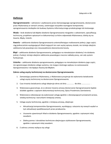 Załącznik nr 06 Definicje Oprogramowanie – wdrożone i użytkowane przez Zamawiającego oprogramowanie, dostarczone przez Wykonawcę w ramach umowy, zawierające wszystkie wymagane komponenty oprogramowania niezbędne do budowy Systemu informatycznego produkcyjnego lub testowego. Wada – brak działania lub błędne działanie Oprogramowania niezgodne z założeniami, specyfikacją techniczną, projektem opisanymi w dokumentacji za które odpowiada Wykonawca; dzielą się na: Awarie, Błędy, Usterki. Awaria – zakłócenie działania Oprogramowania uniemożliwiające realizowanie jednej z jego części; ciąg jednocześnie występujących Wad mających ten sam wyżej opisany skutek; nie istnieje obejście zakłócenia lub powoduje ono nieuzasadnione ekonomicznie koszty. Błąd – zakłócenie działania Oprogramowania, polegające na nienależytym działaniu/ nie działaniu jednej z funkcji; istnieje obejście zakłócenia powodujące znaczne nakłady pracy, zaś cały system funkcjonuje. Usterka – zakłócenie działania oprogramowania, polegające na nienależytym działaniu jego części, nie ograniczające działania całego systemu; nie mające istotnego wpływu na zastosowanie Oprogramowania i nie będące Awarią lub Błędem. Zakres usług asysty technicznej na dostarczone Oprogramowanie. 1. Zamawiający powierza Wykonawcy, a Wykonawca przyjmuje do wykonania świadczenie usługi asysty technicznej na dostarczone Oprogramowanie. 2. Czas trwania świadczenia usługi obejmuje okres od dnia …………… do dnia ……………… . 3. Wykonawca gwarantuje, że w okresie trwania umowy dostarczone Oprogramowanie będzie działało zgodnie z zapisami dokumentacji technicznej, Opisu Przedmiotu Zamówienia. 4. Wykonawca zobowiązuje się wykonywać usługę zgodnie z obowiązującymi przepisami prawa, wiedzą techniczną i warunkami niniejszej umowy. 5. Usługa asysty technicznej, zgodnie z niniejszą umową, obejmuje: • Aktualizację komponentów Oprogramowania, wynikającą z ukazania się nowych wydań w tym aktualizacji opublikowanych przez producenta. • Usuwanie ujawnionych Wad w działaniu Oprogramowania, zgodnie z opisanymi niżej zasadami. • Zdalną pomoc i doradztwo techniczne obejmujące użytkowane Oprogramowanie, zgodnie z opisanymi niżej zasadami. 6. Z zakresu umowy wyłącza się usługi: • Usuwanie Wad Oprogramowania spowodowanych awarią lub wadliwym działaniem sprzętu • Usuwanie Wad Oprogramowania w następstwie wprowadzonych przez Zamawiającego zmian w oprogramowaniu, nie uzgodnionych lub wbrew poczynionym uzgodnieniom uprzednio z Wykonawcą • Brakiem zapewnienia przez Zamawiającego legalności użytkowania składników Oprogramowania 7. Zamawiający powiadomi Wykonawcę o stwierdzonej wadzie, poprzez dokonanie zgłoszenia telefonicznie, faksem lub pocztą elektroniczną, na numery lub adresy email: • ……………………………………………………………………………………. • ………………………………………………………………………………….. 8. Wykonawca potwierdzi otrzymanie powiadomienia o stwierdzonej Wadzie w działaniu Oprogramowania nie później niż: • W przypadku Awarii 4 godzin, • W przypadku Błędów 7 dni, • W przypadku Usterek 14 dni. 9. Wykonawca usunie Wadę Systemu w terminie nie później niż: • W przypadku Awarii 1 dzień, • W przypadku Błędów 7 dni, • W przypadku Usterek 14 dni. 10. Powyższe zasady usuwania Wad stosuje się odpowiednio do innych nieprawidłowości pracy Oprogramowania, których skutki będą analogiczne, jak opisane w definicji rodzajów Wad. 11. Wykonawca zobowiązuje się do wykonywania obowiązków wynikających z Umowy w sposób zapobiegający utracie danych Zamawiającego, do których będzie miał dostęp w trakcie wykonywania usługi. W przypadku, gdy dokonanie usunięcia wady wiąże się z ryzykiem utraty danych, Wykonawca zobowiązany jest poinformować o tym Zamawiającego przed przystąpieniem do usuwania wady oraz umożliwić Zamawiającemu dokonanie kopii zapasowych danych. 12. W przypadku wymiany elementu Oprogramowania na wolny od wad, Zamawiający zastrzega sobie prawo zachowania wszelkich nośników danych, w szczególności twardych dysków. 13. Wdrożenie poprawionej wersji dokonanej zmiany wymaga przeprowadzenia wdrożenia w środowisku testowym Oprogramowania u Zamawiającego. Po uzyskaniu prawidłowych wyników testów możliwe jest wprowadzenie zmiany w środowisku produkcyjnym Oprogramowania. W przypadku uzyskania nieprawidłowych wyników testów Zamawiający powiadamia Wykonawcę, przekazując mu wszelkie informacje służące zdiagnozowaniu problemu. 14. Wykonawca może realizować zadania w sposób zdalny, po skonfigurowaniu i udostępnieniu bezpiecznego połączenia z systemem Zamawiającego. 15. Wykonawca jest zobowiązany informować na bieżąco Zamawiającego o: • statusie zgłoszenia Wady, • terminie wykonania naprawy zgłoszonej Wady, • zakresie wykonanych czynności naprawczych w postaci raportu, • gotowości do wdrożenia przygotowanych zmian w środowisku testowym Wykonawcy. 16. Jeśli w wyniku nieprawidłowości wdrożenia lub ujawnionej Wady faktyczna eksploatacja Oprogramowania nie będzie możliwa lub będzie ograniczona w podstawowym zakresie funkcjonalności i Wady takie nie zostaną usunięte w terminie, Zamawiający ma prawo wezwać do ostatecznego usunięcia Wad wyznaczając dodatkowy termin, nie krótszy niż 7 dni. Jeśli po upływie tego terminu nadal zostaną stwierdzone Wady lub nieprawidłowości, 17. Wszelkie działania, których podjęcie jest wymagane lub dopuszczalne, jak również wszelkie dokumenty, których sporządzenie jest wymagane lub dopuszczalne na mocy Umowy przez Zamawiającego lub Wykonawcę, mogą być podejmowane lub sporządzane przez przedstawicieli. 18. Przedstawiciele po stronie Zamawiającego: ………………………………………………