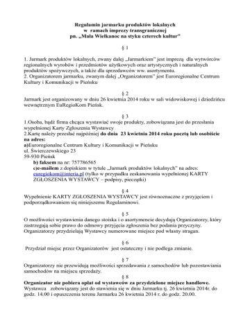 Regulamin jarmarku produktów lokalnych w ramach imprezy transgranicznej pn. „Mała Wielkanoc na styku czterech kultur” §1 1. Jarmark produktów lokalnych, zwany dalej „Jarmarkiem” jest imprezą dla wytwórców regionalnych wyrobów i przedmiotów użytkowych oraz artystycznych i naturalnych produktów spożywczych, a także dla sprzedawców ww. asortymentu. 2. Organizatorem jarmarku, zwanym dalej „Organizatorem” jest Euroregionalne Centrum Kultury i Komunikacji w Pieńsku §2 Jarmark jest organizowany w dniu 26 kwietnia 2014 roku w sali widowiskowej i dziedzińcu wewnętrznym EuRegioKom Pieńsk. §3 1.Osoba, bądź firma chcąca wystawiać swoje produkty, zobowiązana jest do przesłania wypełnionej Karty Zgłoszenia Wystawcy 2.Kartę należy przesłać najpóźniej do dnia 23 kwietnia 2014 roku pocztą lub osobiście na adres: a)Euroregionalne Centrum Kultury i Komunikacji w Pieńsku ul. Świerczewskiego 23 59-930 Pieńsk b) faksem na nr: 757786565 c)e-mailem z dopiskiem w tytule „Jarmark produktów lokalnych” na adres: [email protected] (tylko w przypadku zeskanowania wypełnionej KARTY ZGŁOSZENIA WYSTAWCY – podpisy, pieczątki) §4 Wypełnienie KARTY ZGŁOSZENIA WYSTAWCY jest równoznaczne z przyjęciem i podporządkowaniem się niniejszemu Regulaminowi. §5 O możliwości wystawienia danego stoiska i o asortymencie decydują Organizatorzy, który zastrzegają sobie prawo do odmowy przyjęcia zgłoszenia bez podania przyczyny. Organizatorzy przydzielają Wystawcy numerowane miejsce pod własny stragan. §6 Przydział miejsc przez Organizatorów jest ostateczny i nie podlega zmianie. §7 Organizatorzy nie przewidują możliwości sprzedawania z samochodów lub pozostawiania samochodów na miejscu sprzedaży. §8 Organizator nie pobiera opłat od wystawców za przydzielone miejsce handlowe. Wystawca zobowiązany jest do stawienia się w dniu Jarmarku tj. 26 kwietnia 2014r. do godz. 14.00 i opuszczenia terenu Jarmarku 26 kwietnia 2014 r. do godz. 20.00. §9 Wystawca jest zobligowany do wyposażenia stoiska w elementy niezbędne do ekspozycji we własnym zakresie. § 10 Wymagany jest estetyczny wygląd każdego stoiska. § 11 Wystawca ma prawo do prowadzenia reklamy na powierzchni własnego stoiska w zakresie uzgodnionym z Organizatorami pod warunkiem, że nie zakłóca normalnego toku imprezy. Reklama poza stoiskiem wymaga pisemnej zgody organizatorów. § 12 Wystawca zobowiązany jest do przestrzegania przepisów przepisów pożarowych, sanitarnych, ochrony środowiska i innych obowiązujących przepisów prawa. § 13 Wystawcy zabrania się: - prowadzenia działalności na terenie Jarmarku, naruszającej dobre obyczaje, godność i uczucia religijne. § 14 Wszelkie kwestie związane ze sprzedażą produktów, tj. zezwolenia, podatki, koncesje, licencje, ubezpieczenia i inne leżą w gestii Wystawcy. § 15 Wystawca jest zobligowany do: 1.przebywania lub pozostawienia osoby odpowiedzialnej na stoisku w godzinach trwania Jarmarku, 2.utrzymywania porządku na stoisku oraz wokół niego w trakcie korzystania, 3.przekazania Organizatorom miejsca w takim stanie, jakim został mu on udostępnione, tj. wysprzątane i oczyszczone z wszelkich dekoracji naniesionych przez siebie, § 16 Organizator nie ponosi odpowiedzialności za: 1.eksponaty wystawione na stoisku, za pozostawione rzeczy na stoisku. 2.za uszkodzenia powstałe na osobie lub mieniu Wystawcy przed, po i w trakcie trwania Jarmarku, 3.za szkody spowodowane kradzieżą, przerwą w dostawie lub przepięciem prądu i innymi przyczynami losowymi. § 17 Organizator nie zapewnia depozytu, ani pomieszczeń na przechowywanie przedmiotów należących do Wystawcy. § 18 Na terenie Jarmarku zabrania się: 1.prowadzenia jakichkolwiek gier hazardowych; 2.spożywania alkoholu poza degustacją; 3.wnoszenia przedmiotów i materiałów niebezpiecznych, żrących, radioaktywnych, wybuchowych, łatwopalnych, kanistrów z jakimkolwiek paliwem, jeżeli nie są to rzeczy przeznaczone do sprzedaży w fabrycznych i bezpiecznych opakowaniach, z odpowiednim certyfikatem; 4.używania otwartego ognia; 5.wnoszenia i korzystania z materiałów pirotechnicznych, sztucznych ogni; 6.przebywania osobom nietrzeźwym lub zakłócającym porządek; 7.zaśmiecania terenu Jarmarku; 8.wyrzucania do pojemników na śmieci wwiezionych lub wniesionych w tym celu odpadów; 9.wjazdu pojazdami mechanicznymi; § 19 Uczestnicy Jarmarku są zobowiązani do przestrzegania postanowień niniejszego Regulaminu oraz poleceń porządkowych Organizatorów Jarmarku. Potwierdzeniem przyjęcia zobowiązania jest złożenie podpisu na KARCIE ZGŁOSZENIA WYSTAWCY. § 20 Podczas trwania Jarmarku w sprawach organizacyjnych i porządkowych decydują polecenia i rozstrzygnięcia Organizatorów Jarmarku. § 21 Zgłaszający udział w Jarmarku może odwołać swoją ofertę uczestnictwa . Odwołanie oferty uczestnictwa w Jarmarku wymaga formy pisemnej pod rygorem nieważności (do dnia 25 kwietnia 2014 roku). Za formę pisemną uważa się list przesłany pocztą, list w formie elektronicznej, a także oświadczenia przesłanego faksem.
