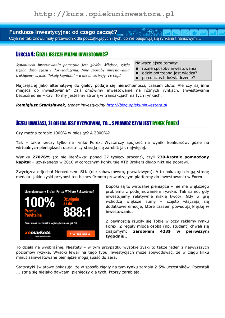 http://kurs.opiekuninwestora.pl LEKCJA 4: GDZIE JESZCZE MOŻNA INWESTOWAĆ? Synonimem inwestowania potocznie jest giełda. Miejsce, gdzie trzeba dużo czasu i doświadczenia. Inne sposoby inwestowania traktujemy ... jako ‘lokatę kapitału’ – a nie inwestycję. To błąd. Najważniejsze tematy: różne sposoby inwestowania gdzie potrzebna jest wiedza? po co czas i doświadczenie? Najczęściej jako alternatywę do giełdy podaje się nieruchomości, czasem złoto. Ale czy są inne miejsca do inwestowania? Dziś omówimy inwestowanie na różnych rynkach. Inwestowanie bezpośrednie – czyli to my jesteśmy stroną w transakcjach na tych rynkach. Remigiusz Stanisławek, trener inwestycyjny http://blog.opiekuninwestora.pl JEŻELI UWAŻASZ, ŻE GIEŁDA JEST RYZYKOWNA, TO... SPRAWDŻ CZYM JEST RYNEK FOREX! Czy można zarobić 1000% w miesiąc? A 2000%? Tak – takie rzeczy tylko na rynku Forex. Wystarczy spojrzeć na wyniki konkursów, gdzie na wirtualnych pieniądzach uczestnicy starają się zarobić jak najwięcej. Wyniku 27076% (to nie literówka: ponad 27 tysięcy procent), czyli 270-krotnie pomnożony kapitał – uzyskanego w 2010 w corocznym konkursie XTB Brokers długo nikt nie poprawi. Zwycięzca odjechał Mercedesem SLK (nie zabawkowym, prawdziwym). A to pokazuje drugą stronę medalu: jakie zyski przynosi ten biznes firmom prowadzącym platformy do inwestowania w Forex. Dopóki są to wirtualne pieniądze – nie ma większego problemu z podejmowaniem ryzyka. Tak samo, gdy inwestujemy relatywnie niskie kwoty. Gdy w grę wchodzą większe sumy – często włączają się dodatkowe emocje, które czasem powodują klęskę w inwestowaniu. Z pewnością rzuciły się Tobie w oczy reklamy rynku Forex. Z reguły młoda osoba (np. student) chwali się znajomym: zarobiłem 423$ w pierwszym tygodniu... To działa na wyobraźnię. Niestety – w tym przypadku wysokie zyski to także jeden z najwyższych poziomów ryzyka. Wysoki lewar na tego typu inwestycjach może spowodować, że w ciągu kilku minut zainwestowane pieniądze mogą spaść do zera. Statystyki światowe pokazują, że w sposób ciągły na tym rynku zarabia 2-5% uczestników. Pozostali ... stają się niejako dawcami pieniędzy dla tych, którzy zarabiają. KURS E-MAIL: FUNDUSZE INWESTYCYJNE: OD CZEGO ZACZĄĆ? INWESTOWANIE W NIERUCHOMOŚCI – NIE MUSI OZNACZAĆ DUŻEGO KAPITAŁU! To może nieruchomości? Przecież mieszkanie zawsze ma jakąś wartość? No właśnie ... jakąś. Jeżeli nie masz wiedzy, doświadczenia i czasu (o tym najczęściej zapominają inwestorzy) inwestycje nie będą najlepsze (chyba, że inwestor ma dużo szczęścia – to zresztą przyda się w każdej inwestycji). Nie mając wiedzy o rynku nieruchomości, nie znając nieco bardziej zaawansowanych zagadnień matematyki finansowej i przepływu pieniężnego, nie uwzględniając we własnych analizach inflacji podjęte decyzje inwestycyjne mogą być mocno nietrafione. Brak wiedzy o tym rynku (tego nie uczą w szkołach) jest także źródłem stereotypowego i błędnego myślenia: aby inwestować w nieruchomości potrzeba dużego kapitału. Tak nie jest. Nie ma żadnego problemu aby zarabiać nie inwestując ani złotówki. Tylko ..., że trzeba zainwestować dużo czasu, dużo wiedzy (nie tylko z zakresu prawa, umów itp) oraz czasu. Na moich szkoleniach „Fundusze To Nie Lokata” czasem jako ciekawostkę pokazuję kilka moich transakcji na rynku nieruchomości z przeszłości – m.in. zakup dwóch 70m2 mieszkań za 0 zł z celem odsprzedaży z zyskiem 400 zł /m2, lub, gdy z grupą znajomych kupiliśmy prawo do odsprzedaży 20 mieszkań od dewelopera za ... 20.000 zł (1.000 zł/sztukę). Możliwości jest wiele. Trzeba tylko czasu i wiedzy aby je wykreować. Jak chociażby możliwość zarabiania na wynajmie: wynająć 2-pokojowe mieszkanie za 1000 zł i podnająć w cenie 1100 zł za każdy pokój (tu w grę wchodzi dodatkowa wiedza o tym jak zabezpieczyć taką inwestycję). PASJONUJESZ SIĘ SZTUKĄ? WTEDY MOŻNA WYBRAĆ INWESTYCJE W SZTUKĘ. Tytuł mówi sam za siebie – nie można inwestować w sztukę tylko dlatego, że jest to sztuka. Tu w mojej ocenie potrzebne jest znacznie większe doświadczenie niż nawet na rynku kapitałowym... DLACZEGO PREZYDENT USA NIE ROZDAWAŁ AUTOGRAFÓW? Mało kto zdaje sobie sprawę, jak zyskowny potrafi być rynek autografów. Kiedy wartość autografu jest wysoka? Gdy jest duży popyt i mała podaż. A małą podaż można wygenerować – chociażby ostrożnie używając pióra. Dlatego niektóre autografy znanych osób warte są 20$, a niektóre – tysiące. Kto przepłaca? Tylko inwestor nie mający wiedzy. INWESTYCJE W BIZNES? JEŻELI MASZ FUNDUSZE – CZEMU NIE. WE WŁASNY I W CUDZY BIZNES. Potrzebny czas i dużo wiedzy. Jeżeli chcesz inwestować w obcy biznes – warto wcześniej poprowadzić kilka własnych i doskonale znać (lub mieć zaufane osoby, które znają) branżę i możliwości biznesu, w który chcesz zainwestować. No i tu nie obejdzie się bez kapitału. OBLIGACJE KORPORACYJNE – WYŻSZE ZYSKI, WYŻSZE RYZYKO Nie mogę przejść na porządku dziennym do zakupu obligacji korporacyjnych na zasadzie ‘polecił mi je doradca w banku’. Jeżeli bank współpracuje z emitentem obligacji – w jego interesie jest te obligacje sprzedać. Bank nie jest gwarantem zysku z emisji obligacji. Nie jest gwarantem zysków inwestora ani tym bardziej bezpieczeństwa danej spółki. © Remigiusz Stanisławek ● www.rodzinnefinanse.pl ● www.opiekuninwestora.pl ● www.magiaprocentow.pl KURS E-MAIL: FUNDUSZE INWESTYCYJNE: OD CZEGO ZACZĄĆ? WHISKY, WINO I INNE TRUNKI Tu w mojej ocenie jest nieco łatwiej. Choć sam nie pokusiłbym się o udział w aukcji na rynku wina czy też próby oceny wartości butelki whisky. To aktywo w inwestycjach oprócz faktycznej wartości, niesie ze sobą także dodatkowe cechy, w zasadzie niewymierne. To także prestiż (można pochwalić się taką butel
