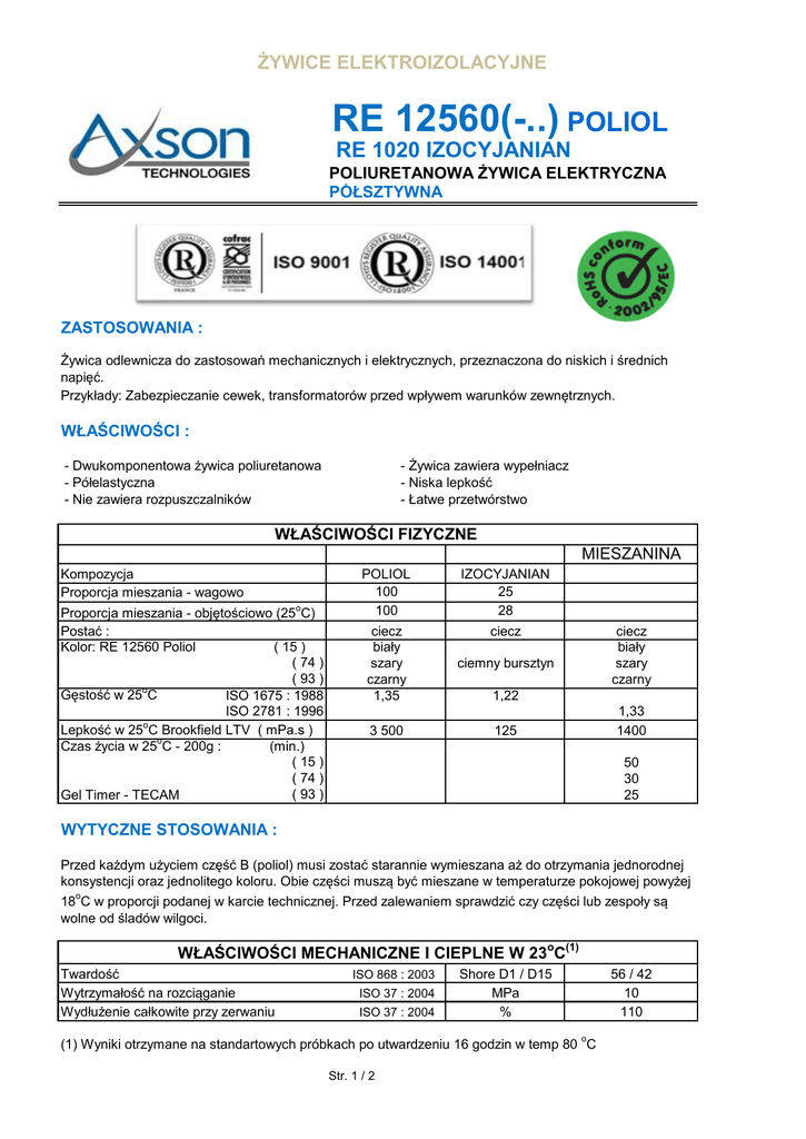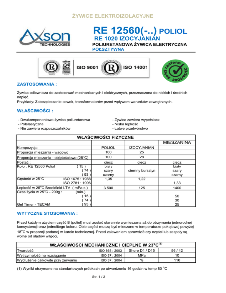 ŻYWICE ELEKTROIZOLACYJNE RE 12560(-..) POLIOL RE 1020 IZOCYJANIAN POLIURETANOWA ŻYWICA ELEKTRYCZNA PÓŁSZTYWNA ZASTOSOWANIA : Żywica odlewnicza do zastosowań mechanicznych i elektrycznych, przeznaczona do niskich i średnich napięć. Przykłady: Zabezpieczanie cewek, transformatorów przed wpływem warunków zewnętrznych. WŁAŚCIWOŚCI : - Dwukomponentowa żywica poliuretanowa - Półelastyczna - Nie zawiera rozpuszczalników - Żywica zawiera wypełniacz - Niska lepkość - Łatwe przetwórstwo WŁAŚCIWOŚCI FIZYCZNE MIESZANINA Kompozycja Proporcja mieszania - wagowo Proporcja mieszania - objętościowo (25oC) Postać : Kolor: RE 12560 Poliol ( 15 ) .( 74 ) .( 93 ) Gęstość w 25oC ISO 1675 : 1988 ISO 2781 : 1996 Lepkość w 25oC Brookfield LTV ( mPa.s ) Czas życia w 25oC - 200g : (min.) .( 15 ) .( 74 ) .( 93 ) Gel Timer - TECAM POLIOL 100 100 IZOCYJANIAN 25 28 ciecz biały szary czarny 1,35 ciecz ciemny bursztyn 3 500 125 ciecz biały szary czarny 1,22 1,33 1400 50 30 25 WYTYCZNE STOSOWANIA : Przed każdym użyciem część B (poliol) musi zostać starannie wymieszana aż do otrzymania jednorodnej konsystencji oraz jednolitego koloru. Obie części muszą być mieszane w temperaturze pokojowej powyżej 18oC w proporcji podanej w karcie technicznej. Przed zalewaniem sprawdzić czy części lub zespoły są wolne od śladów wilgoci. WŁAŚCIWOŚCI MECHANICZNE I CIEPLNE W 23oC(1) Twardość Wytrzymałość na rozciąganie Wydłużenie całkowite przy zerwaniu ISO 868 : 2003 ISO 37 : 2004 ISO 37 : 2004 Shore D1 / D15 MPa % (1) Wyniki otrzymane na standartowych próbkach po utwardzeniu 16 godzin w temp 80 oC Str. 1 / 2 56 / 42 10 110 ŻYWICE ELEKTROIZOLACYJNE RE 12560(-..) POLIOL RE 1020 IZOCYJANIAN POLIURETANOWA ŻYWICA ELEKTRYCZNA PÓŁSZTYWNA WŁAŚCIWOŚCI CIEPLNE(1) Temperatura użytkowania Przewodność cieplna Temperatura zeszklenia Współczynnik rozszerzalności cieplnej [ -50, +10 ]oC [ +40, +120 ]oC Absorbcja wody w 23oC przez 24 h Dyrektywa 2002/95/CE ( ROHS ) o ISO 2582 : 1978 ISO 11359 : 2002 ISO 11359 : 1999 C W / mK o C 10-6K-1 ISO 62 : 1999 % -50 / +120 0,32 25 55 160 0,3 Spełniona WŁAŚCIWOŚCI DIELEKTRYCZNE I IZOLACYJNE W 23 oC (1) Wytrzymałość dielektryczna 50 Hz - 1 mm Stała dielektryczna ε ( 100 Hz ) Współczynnik strat tan δ ( 100 Hz ) Oporność skrośna ( 1000 V ) CEI 60243-1 E2 : 1998 kV / mm 24 CEI 60250 : 1969 W x cm 4,9 6 x 10-2 5 x 1015 CEI 60250 : 1969 CEI 60093 E2 : 1980 (1) Wyniki otrzymane na standartowych próbkach po utwardzeniu 16 godzin w temp 80 oC BEZPIECZEŃSTWO I HIGIENA PRACY : Zwykłe środki bezpieczeństwa powinny być zachowane podczas pracy z tym produktem : - zapewnić dobrą wentylację - nosić rękawice, okulary i odzież ochronną Szczegółowe informacje zawarte są w kartach charakterystyki składników tej kompozycji. PRZECHOWYWANIE : Okres składowania wynosi 12 miesięcy w oryginalnych nie otwieranych pojemnikach w temperaturze pomiędzy 15 i 25oC. Po otwarciu pojemnik należy szczelnie zamknąć pod osłoną gazu obojętnego ( suche powietrze, azot itp.). OPAKOWANIA : POLIOL IZOCYJANIAN GWARANCJA : Wszystkie informacje zawarte powyżej są rezultatem badań i testów przeprowadzonych w naszym laboratorium w ściśle określonych warunkach. Użytkownik ponosi pełną odpowiedzialność za określenie przydatności ( w swoich warunkach ) produktu AXSON ( przed dokonaniem zakupu ) do proponowanego zastosowania. AXSON gwarantuje zgodność swojego produktu z jego specyfikacją lecz nie może zagwarantować jego kompatybilności z jakimkolwiek szczególnym zastosowaniem.AXSON odrzuca jakąkolwiek odpowiedzialność za zniszczenia lub wypadki, które spowodowane zostały użyciem jego produktów. Odpowiedzialność AXSON jest ściśle ograniczona do zwrotu pieniędzy lub wymiany produktu nie zgodnego z jego specyfikacją. AMOD - Andrzej Modrzewski 01-793 Warszawa ul. Rydygiera 8 tel. / fax. ( 22 ) 633-85-06 tel. ( 22 ) 669-39-76 tel. komórkowy ( 602 ) 26-11-15 www.amod.pl i www.amod.com.pl e-mail:[email protected] Przedstawiciel w Polsce : INTERNET: Str. 2 / 2