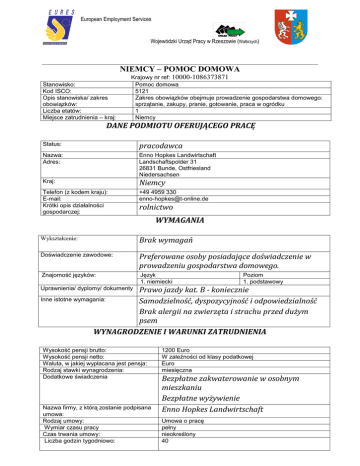 European Employment Services Wojewódzki Urząd Pracy w Rzeszowie (Wałbrzych) NIEMCY – POMOC DOMOWA Stanowisko: Kod ISCO: Opis stanowiska/ zakres obowiązków: Liczba etatów: Miejsce zatrudnienia – kraj: Krajowy nr ref: 10000-1086373871 Pomoc domowa 5121 Zakres obowiązków obejmuje prowadzenie gospodarstwa domowego: sprzątanie, zakupy, pranie, gotowanie, praca w ogródku 1 Niemcy DANE PODMIOTU OFERUJĄCEGO PRACĘ Status: pracodawca Nazwa: Adres: Enno Hopkes Landwirtschaft Landschaftspolder 31 26831 Bunde, Ostfriesland Niedersachsen Kraj: Niemcy Telefon (z kodem kraju): E-mail: Krótki opis działalności gospodarczej: +49 4959 330 [email protected] rolnictwo WYMAGANIA Wykształcenie: Brak wymagań Doświadczenie zawodowe: Preferowane osoby posiadające doświadczenie w prowadzeniu gospodarstwa domowego. Znajomość języków: Język 1. niemiecki Poziom 1. podstawowy Prawo jazdy kat. B - koniecznie Inne istotne wymagania: Samodzielność, dyspozycyjność i odpowiedzialność Brak alergii na zwierzęta i strachu przed dużym psem WYNAGRODZENIE I WARUNKI ZATRUDNIENIA Uprawnienia/ dyplomy/ dokumenty Wysokość pensji brutto: Wysokość pensji netto: Waluta, w jakiej wypłacana jest pensja: Rodzaj stawki wynagrodzenia: Dodatkowe świadczenia Nazwa firmy, z którą zostanie podpisana umowa: Rodzaj umowy: Wymiar czasu pracy Czas trwania umowy: Liczba godzin tygodniowo: 1200 Euro W zależności od klasy podatkowej Euro miesięczna Bezpłatne zakwaterowanie w osobnym mieszkaniu Bezpłatne wyżywienie Enno Hopkes Landwirtschaft Umowa o pracę pełny nieokreślony 40 Zmiany i praca w dni wolne: Dni wolne do uzgodnienia, praca 5 dni w tygodniu od godz. 8.00 do 17.00 Od zaraz Data rozpoczęcia: SPOSÓB SKŁADANIA WNIOSKU Wymagane dokumenty CV w formacie europejskim w języku niemieckim, Język, w którym muszą być sporządzone przedkładane dokumenty: Do kogo należy wysłać dokumenty: niemiecki Gdzie należy wysłać dokumenty: [email protected] Dane teleadresowe doradcy EURES lub przedstawiciela pracodawcy: Frau Martina Busse Do pracodawcy WAŻNOŚĆ Data publikacji: 02.07.2012 Termin przedkładania podań o pracę / zakończenia ważności oferty: Do odwołania Uprzejmie informujemy, że skontaktujemy się wyłącznie z wybranymi kandydatami. UWAGA: 1. Umowa z zagranicznym pracodawcą zostanie zawarta zgodnie z prawem kraju zatrudnienia. Oznacza to, że wszystkie roszczenia odnośnie do warunków, które obejmuje umowa, można kierować wyłącznie do odpowiedniego sądu w kraju zatrudnienia. Publiczne służby zatrudnienia (EURES) nie mogą pośredniczyć ani reprezentować pracownika w sądzie kraju zatrudnienia w przypadku sporu z pracodawcą. 2. Publiczne służby zatrudnienia (EURES) dokładają wszelkich starań, aby zapewnić rzetelność i wiarygodność ofert pracy zgłoszonych w lokalnym urzędzie pracy. Należy wyjaśnić, że oferta pracy została zgłoszona przez stronę trzecią i EURES nie odpowiada za ewentualne rozbieżności między warunkami pracy określonymi w ofercie pracy i warunkami oferowanymi przez potencjalnego pracodawcę. 3. Publiczne służby zatrudnienia (EURES) informują, że będą zbierać, przetwarzać i przekazywać potencjalnym pracodawcom zgodnie z przepisami dotyczącymi ochrony danych osobowych wszystkie dane osobowe dostarczone przez osoby poszukujące pracy. www.eures.europa.eu Więcej ofert pracy za granicą: www.eures.praca.gov.pl www.wup-rzeszow.pl
