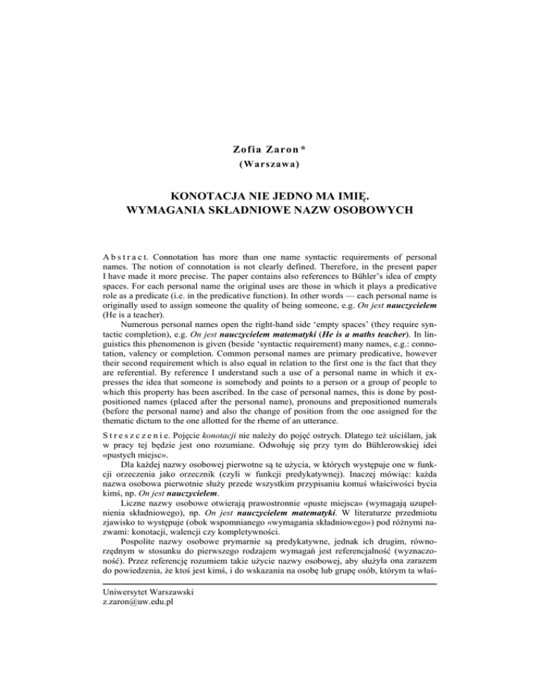 Zofia Zaron * (Warszawa) KONOTACJA NIE JEDNO MA IMIĘ. WYMAGANIA SKŁADNIOWE NAZW OSOBOWYCH A b s t r a c t. Connotation has more than one name syntactic requirements of personal names. The notion of connotation is not clearly defined. Therefore, in the present paper I have made it more precise. The paper contains also references to Bühler’s idea of empty spaces. For each personal name the original uses are those in which it plays a predicative role as a predicate (i.e. in the predicative function). In other words — each personal name is originally used to assign someone the quality of being someone, e.g. On jest nauczycielem (He is a teacher). Numerous personal names open the right-hand side ‘empty spaces’ (they require syntactic completion), e.g. On jest nauczycielem matematyki (He is a maths teacher). In linguistics this phenomenon is given (beside ‘syntactic requirement) many names, e.g.: connotation, valency or completion. Common personal names are primary predicative, however their second requirement which is also equal in relation to the first one is the fact that they are referential. By reference I understand such a use of a personal name in which it expresses the idea that someone is somebody and points to a person or a group of people to which this property has been ascribed. In the case of personal names, this is done by postpositioned names (placed after the personal name), pronouns and prepositioned numerals (before the personal name) and also the change of position from the one assigned for the thematic dictum to the one allotted for the rheme of an utterance. S t r e s z c z e n i e. Pojęcie konotacji nie należy do pojęć ostrych. Dlatego też uściślam, jak w pracy tej będzie jest ono rozumiane. Odwołuję się przy tym do Bühlerowskiej idei «pustych miejsc». Dla każdej nazwy osobowej pierwotne są te użycia, w których występuje one w funkcji orzeczenia jako orzecznik (czyli w funkcji predykatywnej). Inaczej mówiąc: każda nazwa osobowa pierwotnie służy przede wszystkim przypisaniu komuś właściwości bycia kimś, np. On jest nauczycielem. Liczne nazwy osobowe otwierają prawostronnie «puste miejsca» (wymagają uzupełnienia składniowego), np. On jest nauczycielem matematyki. W literaturze przedmiotu zjawisko to występuje (obok wspomnianego «wymagania składniowego») pod różnymi nazwami: konotacji, walencji czy kompletywności. Pospolite nazwy osobowe prymarnie są predykatywne, jednak ich drugim, równorzędnym w stosunku do pierwszego rodzajem wymagań jest referencjalność (wyznaczoność). Przez referencję rozumiem takie użycie nazwy osobowej, aby służyła ona zarazem do powiedzenia, że ktoś jest kimś, i do wskazania na osobę lub grupę osób, którym ta właśUniwersytet Warszawski [email protected] Konotacja nie jedno ma imię. Wymagania składniowe nazw osobowych 673 ciwość została przypisana. W wypadku pospolitych nazw osobowych do tego celu służą m. in. imiona własne w postpozycji (po nazwie osobowej), zaimki oraz liczebniki w prepozycji (przed nazwą osobową), a także zmiana pozycji — z pozycji przeznaczonej dictum tematycznego na pozycję dla rematu wypowiedzi. K e y w o r d s: syntactic requirements, connotation, reference, utterance, communicative structure of an utterance, personal name 0. Termin konotacja, wykorzystywany w bardzo wielu pracach lingwistycznych, należy do terminów, których znaczenie w zależności od orientacji metodologicznej może odnosić się do różnych zjawisk językowych 1. Dlatego tez posługiwanie się nim każdorazowo wymaga doprecyzowania. Problem ten podnosiło wielu językoznawców, głos zabierał również Igor Mielczuk (zob. Iordańska, Mielczuk 1988: 9—34), próbując zaradzić sytuacji i uściślić to pojęcie tak, aby mogło być stosowane w badaniach semantycznych i leksykograficznych. Również w składni trudno mówić o jego jednoznaczności. Sama termin ten stosuję zgodnie z koncepcją Karla Bühlera, choć w opisie składniowym preferuję termin wymagania składniowe. 1. W multimedialnym Słowniku nazw osobowych 2 w informacji składniowej do wymagań składniowych obok konotacji odnotowujemy również sposoby wyznaczania nazw osobowych (operacje referencjalne). O ile się orientuję, jesteśmy pierwszym słownikiem, którego redaktorzy podjęli taką decyzję. Czy jest to decyzja merytorycznie uzasadniona? Redaktorzy SNO oczywiście są przekonani o słuszności tej decyzji, ale proponuję, aby wspólnie rozważyć jej podstawy. 1.1. Na temat wymagań składniowych istnieje przebogata literatura, co nie dziwi, gdyż opis zależności semantyczno-składniowych to jedno z podstawowych, a zarazem najważniejszych (jeśli nie najważniejsze) zadań składni 3. Zależności między jednostkami języka 4 są bowiem ściśle określone i nieprzypadkowe. Konsekwencją tego jest występowanie jednostek języka w określonej konfiguracji w związku składniowym 5. 1 Na temat różnych użyć terminu konotacjai w lingwistyce odsyłam do J. Molino (1971) oraz do tomu Konotacja, red. J. Bartmiński 1988. 2 Pod redakcją Stanisława Dubisza i Zofii Zaron (2011, http://sno.uw.edu.pl) 3 Chociażby dlatego, że reguły łączliwości należą do systemu językowego. 4 Jednostki współwystępujące w związku składniowym poza własnościami tworzenia (kompletowania) związku spełniać muszą jeszcze dwa warunki: /a/ — jednoznaczności semantycznej oraz /b/ — rozłączności. Por. A. Bogusławski (1978). 5 Pojęcie związku składniowego wydaje się intuicyjnie proste. Jest to relacja u z u p e ł n i a n i a, tzn. relacja, kiedy co najmniej dwie jednostki językowe (każda traktowana 674 Zofia Zaron W tym miejscu warto przywołać różnorakie koncepcje opisu zależności składniowych od tradycyjnych począwszy [por. np. w polszczyźnie (Klemensiewicz 1937)] po nowsze związane z nazwiskami Bühlera (1934), Tesniére’a (1959), Gołąba (1967), Szwedowej (1970)