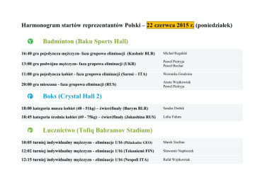 Harmonogram startów reprezentantów Polski – 22 czerwca 2015 r. (poniedziałek) Badminton (Baku Sports Hall) 16:40 gra pojedyncza mężczyzn- faza grupowa eliminacji (Kushnir BLR) Michał Rogalski 13:00 gra podwójna mężczyzn- faza grupowa eliminacji (UKR) Paweł Pietryja Paweł Bochat 11:00 gra pojedyncza kobiet - faza grupowa eliminacji (Sarosi – ITA) Weronika Grudzina 20:00 gra mieszana - faza grupowa eliminacji (RUS) Aneta Wojtkowiak Paweł Pietryja Boks (Crystal Hall 2) 18:00 kategoria musza kobiet (48 - 51kg) – ćwierćfinały (Burym BLR) Sandra Drabik 18:45 kategoria średnia kobiet (69 - 75kg) – ćwierćfinały (Jakushina RUS) Lidia Fidura Łucznictwo (Tofiq Bahramov Stadium) 10:05 turniej indywidualny mężczyzn - eliminacje 1/16 (Pkhakadze GEO) Marek Szafran 12:02 turniej indywidualny mężczyzn - eliminacje 1/16 (Tekoniemi FIN) Sławomir Napłoszek 12:15 turniej indywidualny mężczyzn - eliminacje 1/16 (Nespoli ITA) Rafał Wojtkowiak 14:00 turniej indywidualny mężczyzn - eliminacje 1/8 15:44 turniej indywidualny mężczyzn - ćwierćfinał 16:36 turniej indywidualny mężczyzn - półfinał 17:05 turniej indywidualny mężczyzn - finał Piłka siatkowa (Cristal Hall 1) 09:00 mężczyzn - (grupa A) - POL - FIN 11:00 mężczyzn - (grupa B) - BEL - GER 14:30 mężczyzn - (grupa B) - BUL - SVK 16:30 mężczyzn - (grupa A) - FRA - SRB 20:00 mężczyzn - (grupa A) - TUR - AZE 21:00 mężczyzn - (grupa B) - ITA - RUS Sambo (Heydar Aliyev Arena) 10:00 Mężczyźni kategoria (74kg) - eliminacje1/8 10:20 Mężczyźni kategoria (74kg) - ćwierćfinał 10:40 Mężczyźni kategoria (74kg) - półfinał Sebastian Cieślik 11:00 Mężczyźni kategoria-(74kg) - repesaż 1 11:20 Mężczyźni kategoria (74kg) - repesaż 2 20:00 Mężczyźni kategoria (74kg) – brązowy medal 20:10 Mężczyźni kategoria (74kg) - finał Strzelectwo (Baku Shooting Centre) 09:30 pistolet pneumatyczny10m drużyna mieszana - kwalifikacje 11:50 pistolet pneumatyczny10m drużyna mieszana - półfinał 12:20 pistolet pneumatyczny10m drużyna mieszana - półfinał 18:20 pistolet pneumatyczny10m drużyna mieszana - finał Klaudia Breś Wojciech Knapik