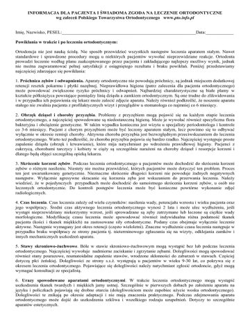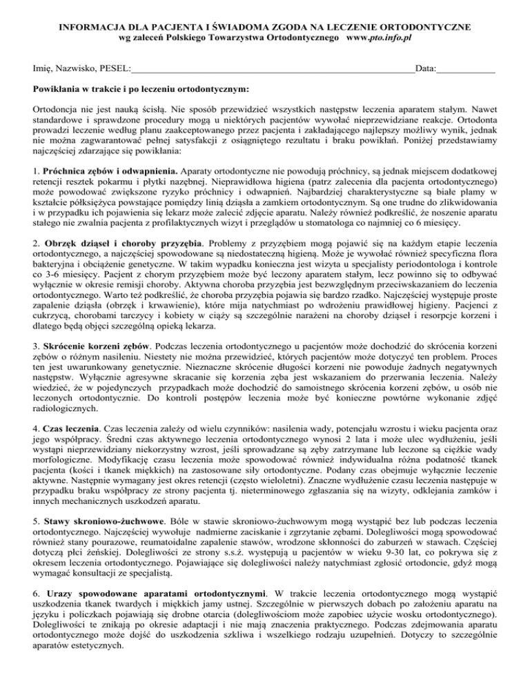 INFORMACJA DLA PACJENTA I ŚWIADOMA ZGODA NA LECZENIE ORTODONTYCZNE wg zaleceń Polskiego Towarzystwa Ortodontycznego www.pto.info.pl Imię, Nazwisko, PESEL:__________________________________________________________Data:____________ Powikłania w trakcie i po leczeniu ortodontycznym: Ortodoncja nie jest nauką ścisłą. Nie sposób przewidzieć wszystkich następstw leczenia aparatem stałym. Nawet standardowe i sprawdzone procedury mogą u niektórych pacjentów wywołać nieprzewidziane reakcje. Ortodonta prowadzi leczenie według planu zaakceptowanego przez pacjenta i zakładającego najlepszy możliwy wynik, jednak nie można zagwarantować pełnej satysfakcji z osiągniętego rezultatu i braku powikłań. Poniżej przedstawiamy najczęściej zdarzające się powikłania: 1. Próchnica zębów i odwapnienia. Aparaty ortodontyczne nie powodują próchnicy, są jednak miejscem dodatkowej retencji resztek pokarmu i płytki nazębnej. Nieprawidłowa higiena (patrz zalecenia dla pacjenta ortodontycznego) może powodować zwiększone ryzyko próchnicy i odwapnień. Najbardziej charakterystyczne są białe plamy w kształcie półksiężyca powstające pomiędzy linią dziąsła a zamkiem ortodontycznym. Są one trudne do zlikwidowania i w przypadku ich pojawienia się lekarz może zalecić zdjęcie aparatu. Należy również podkreślić, że noszenie aparatu stałego nie zwalnia pacjenta z profilaktycznych wizyt i przeglądów u stomatologa co najmniej co 6 miesięcy. 2. Obrzęk dziąseł i choroby przyzębia. Problemy z przyzębiem mogą pojawić się na każdym etapie leczenia ortodontycznego, a najczęściej spowodowane są niedostateczną higieną. Może je wywołać również specyficzna flora bakteryjna i obciążenie genetyczne. W takim wypadku konieczna jest wizyta u specjalisty periodontologa i kontrole co 3-6 miesięcy. Pacjent z chorym przyzębiem może być leczony aparatem stałym, lecz powinno się to odbywać wyłącznie w okresie remisji choroby. Aktywna choroba przyzębia jest bezwzględnym przeciwskazaniem do leczenia ortodontycznego. Warto też podkreślić, że choroba przyzębia pojawia się bardzo rzadko. Najczęściej występuje proste zapalenie dziąsła (obrzęk i krwawienie), które mija natychmiast po wdrożeniu prawidłowej higieny. Pacjenci z cukrzycą, chorobami tarczycy i kobiety w ciąży są szczególnie narażeni na choroby dziąseł i resorpcje korzeni i dlatego będą objęci szczególną opieką lekarza. 3. Skrócenie korzeni zębów. Podczas leczenia ortodontycznego u pacjentów może dochodzić do skrócenia korzeni zębów o różnym nasileniu. Niestety nie można przewidzieć, których pacjentów może dotyczyć ten problem. Proces ten jest uwarunkowany genetycznie. Nieznaczne skrócenie długości korzeni nie powoduje żadnych negatywnych następstw. Wyłącznie agresywne skracanie się korzenia zęba jest wskazaniem do przerwania leczenia. Należy wiedzieć, że w pojedynczych przypadkach może dochodzić do samoistnego skrócenia korzeni zębów, u osób nie leczonych ortodontycznie. Do kontroli postępów leczenia może być konieczne powtórne wykonanie zdjęć radiologicznych. 4. Czas leczenia. Czas leczenia zależy od wielu czynników: nasilenia wady, potencjału wzrostu i wieku pacjenta oraz jego współpracy. Średni czas aktywnego leczenia ortodontycznego wynosi 2 lata i może ulec wydłużeniu, jeśli wystąpi nieprzewidziany niekorzystny wzrost, jeśli sprowadzane są zęby zatrzymane lub leczone są ciężkie wady morfologiczne. Modyfikację czasu leczenia może spowodować również indywidualna różna podatność tkanek pacjenta (kości i tkanek miękkich) na zastosowane siły ortodontyczne. Podany czas obejmuje wyłącznie leczenie aktywne. Następnie wymagany jest okres retencji (często wieloletni). Znaczne wydłużenie czasu leczenia następuje w przypadku braku współpracy ze strony pacjenta tj. nieterminowego zgłaszania się na wizyty, odklejania zamków i innych mechanicznych uszkodzeń aparatu. 5. Stawy skroniowo-żuchwowe. Bóle w stawie skroniowo-żuchwowym mogą wystąpić bez lub podczas leczenia ortodontycznego. Najczęściej wywołuje nadmierne zaciskanie i zgrzytanie zębami. Dolegliwości mogą spowodować również stany pourazowe, reumatoidalne zapalenie stawów, wrodzone skłonności do zaburzeń w stawach. Częściej dotyczą płci żeńskiej. Dolegliwości ze strony s.s.ż. występują u pacjentów w wieku 9-30 lat, co pokrywa się z okresem leczenia ortodontycznego. Pojawiające się dolegliwości należy natychmiast zgłosić ortodoncie, gdyż mogą wymagać konsultacji ze specjalistą. 6. Urazy spowodowane aparatami ortodontycznymi. W trakcie leczenia ortodontycznego mogą wystąpić uszkodzenia tkanek twardych i miękkich jamy ustnej. Szczególnie w pierwszych dobach po założeniu aparatu na języku i policzkach pojawiają się drobne otarcia (dolegliwościom może zapobiec użycie wosku ortodontycznego). Dolegliwości te znikają po okresie adaptacji i nie mają znaczenia praktycznego. Podczas zdejmowania aparatu ortodontycznego może dojść do uszkodzenia szkliwa i wszelkiego rodzaju uzupełnień. Dotyczy to szczególnie aparatów estetycznych. 7. Nawroty. Zakończone leczenie ortodontyczne nie gwarantuje idealnie prostych zębów do końca życia. W celu utrzymania pozycji zębów wymagane jest noszenie indywidualnie dobranych retejnerów zgodnie z zaleceniami ortodonty. Pomimo wszystko zmiany ustawienia zębów mogą wystąpić z przyczyn naturalnych jak nawyki: tłoczenie języka, oddychanie przez usta oraz wzrost i starzenie się. Niewielkie stłoczenia, szczególnie siekaczy dolnych, pojawiają się z czasem i często muszą być zaakceptowane. 8.Alergia. U pacjentów z uczuleniami objawy alergiczne mogą ujawnić się podczas leczenia ortodontycznego w odpowiedzi na wzrost stężenia jonów niklu, chromu, miedzi pochodzących z aparatu ortodontycznego. Reakcje alergiczne mogą wystąpić równie