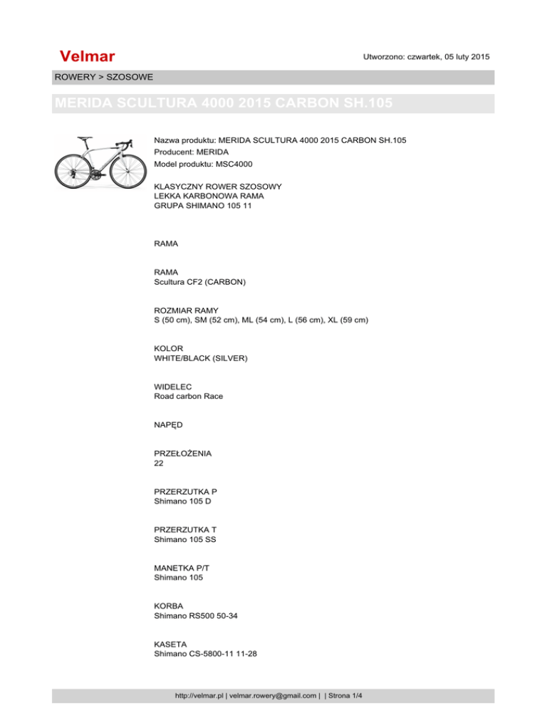 Velmar Utworzono: czwartek, 05 luty 2015 ROWERY > SZOSOWE MERIDA SCULTURA 4000 2015 CARBON SH.105 Nazwa produktu: MERIDA SCULTURA 4000 2015 CARBON SH.105 Producent: MERIDA Model produktu: MSC4000 KLASYCZNY ROWER SZOSOWY LEKKA KARBONOWA RAMA GRUPA SHIMANO 105 11 RAMA RAMA Scultura CF2 (CARBON) ROZMIAR RAMY S (50 cm), SM (52 cm), ML (54 cm), L (56 cm), XL (59 cm) KOLOR WHITE/BLACK (SILVER) WIDELEC Road carbon Race NAPĘD PRZEŁOŻENIA 22 PRZERZUTKA P Shimano 105 D PRZERZUTKA T Shimano 105 SS MANETKA P/T Shimano 105 KORBA Shimano RS500 50-34 KASETA Shimano CS-5800-11 11-28 http://velmar.pl | [email protected] | | Strona 1/4 Velmar Utworzono: czwartek, 05 luty 2015 ROWERY > SZOSOWE MERIDA SCULTURA 4000 2015 CARBON SH.105 ŁAŃCUCH FSA F11S KOŁA ROZMIAR KÓŁ 700C PIASTA P/T Formula Road Bearing/Formula Road Bearing OBRĘCZE Merida comp 24 pair SZPRYCHY Black stainless DĘTKI Ultralite 48 OPONA P/T Conti Ultra Sport II 700x23 zw. KOMPONENTY HAMULEC P/T Merida Road Pro KIEROWNICA Controltech ONE Road MOSTEK Controltech ONE -5 SIODŁO Merida Race 1 SZTYCA Controltech T5 SB10 27.2 http://velmar.pl | [email protected] | | Strona 2/4 Velmar Utworzono: czwartek, 05 luty 2015 ROWERY > SZOSOWE MERIDA SCULTURA 4000 2015 CARBON SH.105 Dołożono wszelkich starań, aby opisy i zdjęcia produktow były dokładne i aktualne. Specyfikacje i ceny mogą ulec zmianie bez uprzedzenia. DOBÓR RAMY Dołożono wszelkich starań, aby opisy i zdjęcia produktow były dokładne i aktualne. Specyfikacje i ceny mogą ulec zmianie bez uprzedzenia. NANO MATRIX CARBON Nanocząstki wzmacniają oparte na żywicy epoksydowej wiązanie, co daje nawet 40% wyższą odporność na uderzenia. AWS – ANTI WRINKLE SYSTEM Technologia antyfałdowa pozwalająca na maksymalne wygładzenie wewnętrznych powierzchni rur karbonowych. Poprawiona struktura oznacza mniejszą wagę, większą wytrzymałość oraz poprawiony rozkład obciążeń. FLEX STAY Specjalne ukształtowanie rur tylnego widelca lepiej tłumi wibracje i poprawia komfort jazdy. To rozwiązanie zapewnia także optymalne przeniesienie siły pedałowania. INTERNAL CABLE Prowadzenie linki tylnego hamulca, a w niektorych modelach także linki przerzutek, wewnątrz rur ramy. To rozwiązanie nie tylko poprawia wygląd roweru, ale także chroni linki przed zabrudzeniem. CARBON FORK Przedni widelec wykonany z kompozytu węglowego, w niektorych modelach w 100%. Karbonowe widelce MERIDY zachwycają pochłanianiem wibracji oraz sztywnością podczas hamowania i w zakrętach. http://velmar.pl | [email protected] | | Strona 3/4 Velmar Utworzono: czwartek, 05 luty 2015 ROWERY > SZOSOWE MERIDA SCULTURA 4000 2015 CARBON SH.105 X-TAPER HEADTUBE Rozszerzająca się rura sterowa z łożyskiem 1 1/8” na gorze i 1,5” na dole pozwala na usztywnienie głowki ramy, co zwiększa precyzję sterowania. DOUBLE CHAMBER TECHNOLOGY Wewnętrzne żebrowanie dzieli mocno obciążone rury z włokien węglowych na dwie osobne komory. Poprawia to wytrzymałość na skręcanie i uderzenia. Technologia ta jest stosowana w karbonowych ramach i widelcach, zapewniając także lepsze pochłanianie drgań. DI2 READY Rozwiązanie wprost z World Touru dla wszystkich miłośnikow nowinek technologicznych na szosie. Pozwala zamontować elektroniczny system przerzutek Di2 Shimano, ktory charakteryzuje się dużą niezawodnością i wydajną, bezproblemową obsługą. Rowery i ramy z symbolem „Di2 Ready” są optymalnie przygotowane do montażu tej technologii, łącznie z możliwością montażu baterii pod dolnymi rurami tylnego trojkąta bądź w sztycy. Cena: 6490.00zł Opcje dostępne dla MERIDA SCULTURA 4000 2015 CARBON SH.105 : rozmiar ramy 50, 52, 54, 56, 59. Dostępność: Ten produkt został dodany do sklepu w dniu niedziela, 25 styczeń 2015 http://velmar.pl | [email protected] | | Strona 4/4