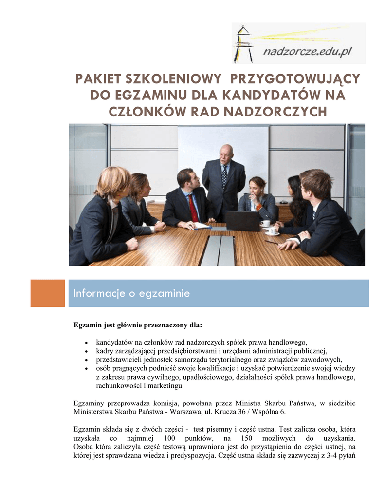 PAKIET SZKOLENIOWY PRZYGOTOWUJĄCY DO EGZAMINU DLA KANDYDATÓW NA CZŁONKÓW RAD NADZORCZYCH Informacje o egzaminie Egzamin jest głównie przeznaczony dla: kandydatów na członków rad nadzorczych spółek prawa handlowego, kadry zarządzającej przedsiębiorstwami i urzędami administracji publicznej, przedstawicieli jednostek samorządu terytorialnego oraz związków zawodowych, osób pragnących podnieść swoje kwalifikacje i uzyskać potwierdzenie swojej wiedzy z zakresu prawa cywilnego, upadłościowego, działalności spółek prawa handlowego, rachunkowości i marketingu. Egzaminy przeprowadza komisja, powołana przez Ministra Skarbu Państwa, w siedzibie Ministerstwa Skarbu Państwa - Warszawa, ul. Krucza 36 / Wspólna 6. Egzamin składa się z dwóch części - test pisemny i część ustna. Test zalicza osoba, która uzyskała co najmniej 100 punktów, na 150 możliwych do uzyskania. Osoba która zaliczyła część testową uprawniona jest do przystąpienia do części ustnej, na której jest sprawdzana wiedza i predyspozycja. Część ustna składa się zazwyczaj z 3-4 pytań Pakiet szkoleniowy przygotowujący do egzaminu dla kandydatów na członków rad nadzorczych i odbywa się w ten sam dzień co część testowa. Opłata egzaminacyjna wynosi 850 zł. W sytuacji niezdania egzaminu w którejś z dwóch części, można przystąpić do ponownego egzaminu w innym terminie. Wówczas wymagane jest zdanie obu części egzaminu i ponowne wniesienie opłaty egzaminacyjnej. Osoby, które zdadzą egzamin, uzyskują dyplom poświadczający zdobytą wiedzę i umiejętności. Do egzaminu dopuszczane są osoby z wykształceniem średnim, bądź wyższym. Tradycyjne szkolenie nie jest obowiązkowe i do egzaminu mogą przystąpić osoby, które nie odbyły szkolenia dla kandydatów na członków rad nadzorczych. Najbliższe terminy egzaminów umieszczone są na stronie: http://bip.msp.gov.pl/bip/ogloszenia/egzaminy-dlakandydato/2483,dok.html#do%20ad%202 O mnie Nazywam się Marcin Reszka. Jestem licencjonowanym Doradcą Inwestycyjny numer 335. Od 2007 roku skutecznie przygotowuję osoby do egzaminu dla kandydatów na członków rad nadzorczych spółek z udziałem Skarbu Państwa organizowanego przez MSP. Do tej pory ponad 250 osób zdało ten egzamin dzięki skorzystaniu z mojej oferty. Ponad 95% tych osób udało się to za pierwszym podejściem, często uzyskując najlepszy wynik na danym egzaminie. W 2007 roku zdałem egzamin dla kandydatów na członków rad nadzorczych spółek z udziałem Skarbu Państwa z najlepszym wynikiem roku. Od 2008 roku przygotowuję kandydatów do egzaminu na Doradcę Inwestycyjnego organizowanego przez KNF. Osiągnąłem na tym polu duże sukcesy - aż 70 osób, które zdecydowały się na moją ofertę zdobyło licencję Doradcy Inwestycyjnego. I etap egzaminu dla Doradców Inwestycyjnych zdałem z jednym z najlepszych wyników w historii tego egzaminu. Jestem pionierem, który zapoczątkował tworzenie pakietów do samodzielnej nauki na egzaminy państwowe w Polsce. Strona 1 Pakiet szkoleniowy przygotowujący do egzaminu dla kandydatów na członków rad nadzorczych Opis pakietu szkoleniowego W skład pakietu szkoleniowego wchodzi: - ponad 1150 pytań testowych przygotowujących do egzaminu testowego wbudowane w program do efektywnej nauki, który bardzo uławia przyswojenie wiedzy. Do wszystkich pytań są odpowiedzi a do większości wyjaśnienia i podstawa prawna. Pytania testowe i odpowiedzi do nich są systematycznie aktualizowane. Obecnie na 150 pytań testowych na egzaminie można spodziewać się około 130 takich pytań jak w pakiecie szkoleniowym, Opis programu do nauki: http://nadzorcze.edu.pl/uploads/Program%20do%20nauki.pdf Korzystając z programu nie jest konieczne połączenie z internetem. Istnieje możliwość instalacji programu w środowisku Androida bądź Windows mobile i korzystania z niego na telefonie komórkowym! Na komputerze program działa na systemie Windows, Linux, bądź Mac. Nauka z tym programem jest bardzo chwalona przez użytkowników, jeżeli jednak z jakiś przyczyn nie przypadnie do gustu to z materiałów można uczyć się także w sposób tradycyjny. - 8 przykładowych testów do rozwiązywania przed egzaminem z uwzględnieniem struktury tematycznej pytań tak, jak na egzaminie (wersja papierowa), - klucz z odpowiedziami do pytań testowych (wersja papierowa), Strona 2 Pakiet szkoleniowy przygotowujący do egzaminu dla kandydatów na członków rad nadzorczych - zestaw ponad 80 pytań najczęściej zadawanych na ustnym, z zaznaczeniem tych, które są najważniejsze opracowane w sposób rzeczowy, bardzo na temat, bez niepotrzebnie rozwiniętych zagadnień. Dokładnie tak, jak jest to wymagane podczas egzaminu ustnego (wersja papierowa), - aktualne ustawy (na płycie CD), -rozbudowany i przystępnie opracowany materiał o Spółkach, KRS, zagadnieniach z Kodeksu Cywilnego (wersja papierowa), - obszerne praktyczne wskazówki, plan nauki, strategie pomocne na egzaminie, jak i w przygotowaniu do niego...(wersja papierowa), - relacje z egzaminu od osób, które zdawały w ostatnim okresie. Wrażenia i przemyślenia innych osób, które przechodziły przez egzamin pomagają zminimalizować stres egzaminacyjny., - dodatkowe wyjaśnienia i możliwość konsultacji poprzez pocztę elektroniczną, - bezpłatna aktualizacja przez 6 miesięcy od zakupu. Materiały dostarczane są częściowo w formie papierowej (około 500 stron) i częściowo w formie elektronicznej na płycie CD. Całość jest opracowana bardzo starannie i na bieżąco aktualizowana (mam stały kontakt z osobami podchodzącymi do egzaminu). Wszystko jest przygotowane konkretnie pod ten egzamin i nie potrzeba do nauki nic więcej. Silne strony pakietu: - nauka w dogodnej chwili i w dogodnym miejscu, - brak dodatkowych kosztów (dojazdy, noclegi...), - wsparcie i możliwość konsultacji z doświadczonym ekspertem, - bezpłatne aktualizacje przez 6 miesi