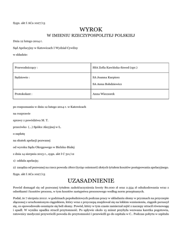 Sygn. akt I ACa 1027/13 WYROK W IMIENIU RZECZYPOSPOLITEJ POLSKIEJ Dnia 12 lutego 2014 r. Sąd Apelacyjny w Katowicach I Wydział Cywilny w składzie: Przewodniczący : SSA Zofia Kawińska-Szwed (spr.) Sędziowie : SA Joanna Kurpierz SA Anna Bohdziewicz Protokolant : Anna Wieczorek po rozpoznaniu w dniu 12 lutego 2014 r. w Katowicach na rozprawie sprawy z powództwa M. T. przeciwko (...) Spółce Akcyjnej w Ł. o zapłatę na skutek apelacji pozwanej od wyroku Sądu Okręgowego w Bielsku-Białej z dnia 14 sierpnia 2013 r., sygn. akt I C 311/12 1) oddala apelację; 2) zasądza od pozwanej na rzecz powoda 1800 (tysiąc osiemset) złotych tytułem kosztów postępowania apelacyjnego. Sygn. akt I ACa 1027/13 UZASADNIENIE Powód domagał się od pozwanej tytułem zadośćuczynienia kwoty 80.000 zł oraz 2.554 zł odszkodowania wraz z odsetkami i kosztów procesu, w tym kosztów zastępstwa procesowego według norm przepisanych. Podał, że 7 sierpnia 2011r. w godzinach popołudniowych podczas pracy w układaniu słomy w pryzmach na przyczepie złączonej z uruchomionym ciągnikiem, który wraz z przyczepą znajdował się na lekkim wzniesieniu, ciągnik poruszył się, co spowodowało osunięcie się beli słomy. Powód, który w tym czasie zamierzał zejść z naczepy utracił równowagę i spadł. W wyniku upadku stracił przytomność. Po upływie około 15 minut przybyła wezwana karetka pogotowia, ratownicy medyczni przywrócili powoda do przytomności i przewieźli go do szpitala w C.. Podczas pobytu w szpitalu od dnia 7 sierpnia 2011r. do dnia 19 sierpnia 2011r. na oddziale chirurgii (...) przeszedł skomplikowaną operację obu rąk, a po upływie kolejnych 10 dni z opatrunkiem gipsowym został wypisany do domu. W wyniku wypadku doznał wieloodłamowego odstawowego złamania bliższej kości łokciowej prawej, złamania nasady dalszej kości promieniowej lewej i głowy kości promieniowej prawej, stłuczenia łuku brwiowego, stłuczenia żeber, wybicia dwóch zębów, połamania protezy zębowej, zniszczenia okularów i obrączki ślubnej, którą musiano przeciąć ze względu na opuchliznę ręki i palców. 27 września 2011r. ponownie trafił do szpitala, gdzie wykonano zabieg usunięcia drutów stabilizujących z nadgarstka ręki lewej. W łokciu stabilizacja drutami pozostaje nadal, a powód czeka na kolejną operację. Stale się leczy oraz przechodzi kolejne cykle rehabilitacji. Po powrocie ze szpitala w sierpniu 2011r. przy wszelkich czynnościach pomagała mu żona w wymiarze co najmniej 2 godziny dziennie. Powód przebywał na zwolnieniu lekarskim przez 9 miesięcy bez przerwy. Nadal odczuwa znaczące dolegliwości związane z ograniczeniem ruchomości w obu rękach, osłabieniem siły rąk, stałymi dolegliwościami bólowymi promieniującymi do palców i barków. Dolegliwości spowodowały ograniczenie powoda w możliwości wykonywania czynności życia codziennego, a w realiach charakteru zatrudnienia, konieczne czynności pracownicze potęgują znacząco dolegliwości związane z urazami. Zarówno na ciągnik, jak i na przyczepę została zawarta umowa ubezpieczenia odpowiedzialności cywilnej. Pozwana nie kwestionowała zasady odpowiedzialności i przyznała świadczenie z tytułu zadośćuczynienia w wysokości 12.000 zł. Domagając się zasądzenia kosztów opieki sprawowanej przez żonę powód wyliczył, że sprawowała ją przez 62 dni, po 2 godziny dziennie, plus 54 godziny opieki związanej z dowozem na rehabilitację. Koszt jednej godziny opieki wycenił według godziny pracy opiekunki w opiece pielęgnacyjnej według stawek miejscowych, który wynosi 8 zł netto za godzinę. Odnośnie wynagrodzenia za dowożenie na rehabilitację powód wskazał, że po urazie nie mógł prowadzić auta. Konieczne było dowożenie i odwożenie autem powoda. Koszty zakupu paliwa w związku z dojazdami do szpitala żony oraz powoda na rehabilitację wyniosły 1.130 zł. W odpowiedzi na pozew pozwana wniosła o oddalenie powództwa w całości i zasądzenie od powoda kosztów postępowania, w tym kosztów zastępstwa adwokackiego według norm przepisanych. Przyznała, że przyjęła co do zasady odpowiedzialność odszkodowawczą z tytułu zdarzenia uszkodzenia ciała powoda, powstałego na skutek wypadku do którego doszło w dniu 7 sierpnia 2011r., która wynika z polisy OC samoistnych posiadaczy pojazdów mechanicznych. Pozwana udzielała ochrony ubezpieczeniowej kierującemu pojazdem (...) nr rej. (...). Po zgłoszeniu szkody oraz przeprowadzeniu postępowania likwidacyjnego szkody wypłaciła na rzecz powoda kwotę 12.000 zł tytułem zadośćuczynienia. Przyznane i zapłacone zadośćuczynienie pieniężne za doznaną na skutek wypadku krzywdę, ból, cierpienie fizyczne i psychiczne, ustalone zostało przy uwzględnieniu rozmiaru doznanych cierpień, ich intensywności, trwałości oraz nieodwracalnego charakteru obrażeń. Zdaniem strony pozwanej przyznane i wypłacone poszkodowanemu zadośćuczynienie jest „odpowiednią sumą pieniężną” w rozumieniu art. 445 § 1 kc, odpowiadającą w tym zakresie wytycznym i orzeczeniom Sądu Najwyższego. W ocenie pozwanego żądana przez powoda dalsza kwota 80.000 zł jest kwotą nadmierną. Pozwana podniosła także zarzut przyczynienia powoda do powstania szkody, gdyż jak wynika z karty informacyjnej leczenia szpitalnego u powoda stwierdzono 0,56 promila alkoholu we krwi, co niewątpliwie miało wpływ na zaistnienie wypadku. Przyczynienie powoda nie może być niższe niż 50%, co skutkować winno stosownym obniżeniem odszkodowania oraz zadośćuczynienia zgodnie z treścią art. 362 k.c. Zaskarżonym wyrokiem Sąd Okręgowy zasądził od pozwanej na rzecz powoda 61.625 zł z odsetkami od kwoty 60.000 zł od 13 września 2012 r., od kwoty 1.625 zł od 16 czerwca 2013 r., w pozostałej części powództwo oddalił oraz orzekł o kosztach procesu. Sąd Okręgowy ustalił następujący stan faktyczny: W dniu 7 sierpnia 2011r. 