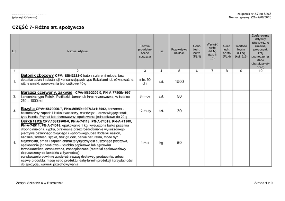………………………….…. (pieczęć Oferenta) załącznik nr 2.7 do SIWZ Numer sprawy: ZSnr4/06/2015 CZĘŚĆ 7- Różne art. spożywcze L.p. 1 j.m. Przewidywa na ilość Cena jedn. netto (PLN) Wartość netto (PLN) (kol. 5 x6) Cena jedn. brutto (PLN) Wartość brutto (PLN) (kol. 5x8) Zaoferowane artykuły równoważne (nazwa, producent, kraj pochodzenia, dane charakterysty czne) 3 4 5 6 7 8 9 10 Nazwa artykułu Termin przydatno ści do spożycia 2 Batonik zbożowy CPV: 15842222-0 baton z ziaren i miodu, bez 1. dodatku cukru i substancji konserwujących typu Bakalland lub równoważne, różne smaki, opakowania jednostkowe 40 g min. 90 dni szt. 1500 2. Barszcz czerwony, zakwas CPV:15892200-9, PN-A-77805:1997 koncentrat typu Rolnik, Pudliszki, Jamar lub inne równoważne, w butelce 250 – 1000 ml 3 m-ce szt. 50 12 m-cy szt. 20 1 m-c kg 50 3. 4. Bazylia CPV:15870000-7, PNA-86959:1997/Az1:2002, korzenno balsamiczny zapach i lekko kwaskowy, chłodząco - orzeźwiający smak, typu Kamis, Prymat lub równoważny, opakowania jednostkowe do 20 g Bułka tarta CPV:15612500-6, PN-A-74113, PN-A-74015, PN-A-74108, PN-A-74014, PN-A-74016, opakowanie 1 kg, wysuszona bułka pszenna drobno mielona, sypka, otrzymana przez rozdrobnienie wysuszonego pieczywa pszennego zwykłego i wyborowego, bez dodatku nasion, nadzień, zdobień, sypka, bez grudek, barwa naturalna, może być niejednolita, smak i zapach charakterystyczny dla suszonego pieczywa, opakowanie jednostkowe – torebka papierowa lub zgrzewka termokurczliwa, oznakowana, zabezpieczona (materiał opakowaniowy dopuszczony do kontaktu z żywnością), oznakowanie powinno zawierać: nazwę dostawcy-producenta, adres, nazwę produktu, masę netto produktu, datę-termin produkcji i przydatności do spożycia, warunki przechowywania Zespół Szkół Nr 4 w Rzeszowie Strona 1 z 9 Chrupki kukurydziane CPV: 15800000-6 produkt naturalnie bezglutenowy, bez konserwantów, bez GMO składniki: grys kukurydziany 98%, olej roślinny, sól typu Rymut lub równoważne, różne smaki, opakowania jednostkowe 200 g 5. min. 90 dni szt. 250 12 m-cy szt. 5 min. 90 dni szt. 1200 12 m-cy kg 200 12 m-cy szt. 15 min. 90 dni szt. 500 12 m-cy szt. 20 12 m-cy szt. 50 12 m-cy szt. 20 Chrzan tarty CPV:15331400-1, PN-A-77806, PN-A-86951, PN-A6. 7. 8. 9. 10. 11. 12. 13. 77807, PN-A-77701:1997 produkt spożywczy otrzymany ze świeżych, pozbawionych skórki tartych korzeni chrzanu, kwasku cytrynowego z dodatkiem soli i cukru, struktura – przetarta masa z zawartością drobnych fragmentów korzeni chrzanu, smak i zapach – charakterystyczny dla chrzanu, lekko piekący, kwaśnosłodki, zawartość soli kuchennej nie więcej niż – 2,0 %, barwa biała lub biało kremowa, opakowania słoiki o pojemności do 200 ml Ciasteczka zbożowe CPV:15842300-5 różne rodzaje, skład: Płatki owsiane, mąka pszenna tłuszcz roślinny, ekstrudat pszenno-ryżowy, otręby pszenne, bez barwników i konserwantów, typu W SAM RAZ NA RAZ Kupiec lub równoważne, opakowanie jednostkowe 50g Cukier biały kryształ CPV:15831200-4, PN-A-74850:1996/Az1:2005 opakowanie jednostkowe – torebki papierowe 1 kg Cynamon mielony CPV:15870000-7, BN-68/8132-09 typu Kamis, Prymat lub równoważny, opakowania jednostkowe do 20 g Czekolada mleczna bez dodatku cukru CPV:15840000-8 czekolada mleczna bez dodatku cukru z dodatkiem substancji słodzącej maltitol , typu Wawel lub równoważne. Opakowanie jednostkowe czekolada formowana w tabliczki o masie 100g, opakowane w papier pergaminowy, folię z tworzyw sztucznych lub aluminiową laminowaną (materiał opakowaniowy dopuszczony do kontaktu z żywnością). Opakowania jednostkowe powinny zabezpieczać produkt przed zniszczeniem i zanieczyszczeniem, powinny być czyste, bez obcych zapachów i uszkodzeń mechanicznych Czosnek suszony granulowany CPV:15870000-7, PN-72/A77603 suszony czosnek 100%, smak ostry, kolor jasnokremowy, konsystencja sypka, zapach swoisty dla czosnku, typu Kamis, Prymat lub równoważny, opakowania jednostkowe do 20 g Filet z makreli w sosie pomidorowym CPV:15241500 – 4, PN – 91/A – 86763 konserwa rybna sterylizowana – puszka łatwo otwieralna 170-190 g/1szt. typu Graal, King Oscar lub równoważny Groszek zielony konserwowy CPV:15331462-3, PN-76/A-77803 kolor zielony, soczysty, ziarna całe, nie zepsute, bez obcych zapachów, opakowania puszki łatwo otwieralne o pojemności do 300 g Zespół Szkół Nr 4 w Rzeszowie Strona 2 z 9 14. 15. 16. Grzyby suszone CPV:15893000-4PN-A-78509 produkt otrzymany ze świeżych grzybów oczyszczonych z zanieczyszczeń, pokrojonych, wysuszonych w stopniu zapewniającym ich trwałość, opakowanie jednostkowe 30g Herbata zwykła granulowana CPV:15863000-5, PN-ISO 3720:1997 czarna, po zaparzeniu esencjonalny napar, wyraźnie wyczuwalny smak herbaty, po zaparzeniu kolor ciemnobrązowy, bez obcych zapachów, op.80-100g Kakao naturalne, holenderskie ,,ekstra” ciemne CPV – 15841000 – 5 Decomoreno lub równoważne, w opak. 80 g 12 m-cy opak. 15 12 m-cy szt. 150 12 m-cy szt. 20 12 m-cy kg 30 12 m-cy opak. 10 12 m-cy kg 30 12 m-cy kg 12 12 m-cy kg 10 12 m-cy kg 5 12 m-cy szt. 10 12 m-cy szt. 60 12 m-cy szt. 25 Kasza gryczana CPV:15613000-8, PN-64/A-74204 cała, po 17. 18. 19. 20. 21. ugotowaniu powinna być sypka i nie powinna się sklejać, w opakowaniach o masie 1 kg, Kasza jaglana CPV:15613300-1 , PN-64/A-74204 średnia, po ugotowaniu powinna być sypka i nie powinna się sklejać, w opakowaniach o masie 500g, Kasza jęczmienna CPV:15600000-7, PN-64/A-74204 średnia, perłowa mazurska, po ugotowaniu powinna być sypka i nie powinna się sklejać, w opakowaniach o masie 1 kg, Kasza kuskus CPV:15851250-5 Kupiec, Halina lub równoważna Kasza kuskus w opak. 250-500 g lub w saszetkach Kasza manna CPV 15613300-1, PN-88/A-74203 PN-A-7-74013:1964 Lubella, Melvit lub równoważne, opakowania jednostkowe do 1kg Kaszka kukurydziana CPV 15613100-9, PN-A-74205:1997 po 22. 23. 24. ugotowaniu powinna być syp