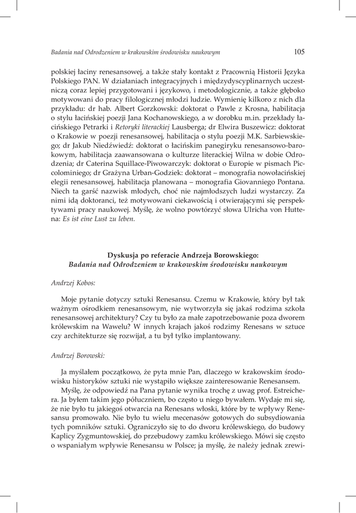 Badania nad Odrodzeniem w krakowskim środowisku naukowym 105 polskiej łaciny renesansowej, a także stały kontakt z Pracownią Historii Języka Polskiego PAN. W działaniach integracyjnych i międzydyscyplinarnych uczestniczą coraz lepiej przygotowani i językowo, i metodologicznie, a także głęboko motywowani do pracy filologicznej młodzi ludzie. Wymienię kilkoro z nich dla przykładu: dr hab. Albert Gorzkowski: doktorat o Pawle z Krosna, habilitacja o stylu łacińskiej poezji Jana Kochanowskiego, a w dorobku m.in. przekłady łacińskiego Petrarki i Retoryki literackiej Lausberga; dr Elwira Buszewicz: doktorat o Krakowie w poezji renesansowej, habilitacja o stylu poezji M.K. Sarbiewskiego; dr Jakub Niedźwiedź: doktorat o łacińskim panegiryku renesansowo-barokowym, habilitacja zaawansowana o kulturze literackiej Wilna w dobie Odrodzenia; dr Caterina Squillace-Piwowarczyk: doktorat o Europie w pismach Piccolominiego; dr Grażyna Urban-Godziek: doktorat – monografia nowołacińskiej elegii renesansowej, habilitacja planowana – monografia Giovanniego Pontana. Niech ta garść nazwisk młodych, choć nie najmłodszych ludzi wystarczy. Za nimi idą doktoranci, też motywowani ciekawością i otwierającymi się perspektywami pracy naukowej. Myślę, że wolno powtórzyć słowa Ulricha von Huttena: Es ist eine Lust zu leben. Dyskusja po referacie Andrzeja Borowskiego: Badania nad Odrodzeniem w krakowskim środowisku naukowym Andrzej Kobos: Moje pytanie dotyczy sztuki Renesansu. Czemu w Krakowie, który był tak ważnym ośrodkiem renesansowym, nie wytworzyła się jakaś rodzima szkoła renesansowej architektury? Czy tu było za małe zapotrzebowanie poza dworem królewskim na Wawelu? W innych krajach jakoś rodzimy Renesans w sztuce czy architekturze się rozwijał, a tu był tylko implantowany. Andrzej Borowski: Ja myślałem początkowo, że pyta mnie Pan, dlaczego w krakowskim środowisku historyków sztuki nie wystąpiło większe zainteresowanie Renesansem. Myślę, że odpowiedź na Pana pytanie wynika trochę z uwag prof. Estreichera. Ja byłem takim jego półuczniem, bo często u niego bywałem. Wydaje mi się, że nie było tu jakiegoś otwarcia na Renesans włoski, które by te wpływy Renesansu promowało. Nie było tu wielu mecenasów gotowych do subsydiowania tych pomników sztuki. Ograniczyło się to do dworu królewskiego, do budowy Kaplicy Zygmuntowskiej, do przebudowy zamku królewskiego. Mówi się często o wspaniałym wpływie Renesansu w Polsce; ja myślę, że należy jednak zrewi- 106 Andrzej BOROWSKI dować poglądy na ten tak zwany mecenat renesansowy w Polsce. Wymienia się tu Zamoyskiego, ale ten mecenat arystokracji nie był taki efektywny. O te sprawy zabiegał głównie Kościół i hierarchia duchowna. Ten tak zwany złoty wiek skończył się jednak dość prędko. Karolina Targosz: Ja jednak jako historyk sztuki chciałabym bronić tego polskiego Renesansu, a krakowskiego w szczególności. Renesans polski zaczął się rzeczywiście na Wawelu i musimy docenić, czego dokonał tu król Zygmunt Stary; Zygmunt August Krakowa nie lubił i ciążył do Wilna, ale czasy Zygmunta Starego, zwłaszcza pierwsza połowa wieku XVI, to jest fenomenalny rozwój zwłaszcza architektury i rzeźby. Z malarstwem jest nieco gorzej, raczej kuleje, ale też pojawił się tu jeden z rodzeństwa Dürerów, Hans, było też trochę wpływów malarstwa niderlandzkiego. Natomiast w architekturze, w rzeźbie zjechało tu wielu wybitnych artystów, dla których mecenat królewski, a potem biskupi był przyciągającym elementem. Byli to artyści włoscy, których dominacja na terenie całej Europy jest bardzo wyraźna. Byli to naprawdę świetni fachowcy. Byli tu i Berrecci, i Gucci, i Padovano, wszystko artyści w skali europejskiej najwyższej klasy. Szczególnie ważna jest tu kaplica Zygmuntowska, która ciągle jest tematem nowych opracowań. Ja na początku lat 80. też opracowałam artykuł na ten temat; są i zwolennicy, i przeciwnicy moich interpretacji, ale ciągle wiele się tu dzieje. W ubiegłym roku ukazał się cały tom Biuletynu Historii Sztuki poświęcony tym zagadnieniom. Piszą tam głównie historycy warszawscy, a nie krakowscy, ale również i młodzi, robiący z tego prace dyplomowe. Dlatego ja bronię Renesansu krakowskiego i tego, co się i teraz wokół niego także poza Krakowem dzieje. Kazimierz Grotowski: Ja mam w związku z tym pytanie, oczywiście ignoranta w tej dziedzinie. Przed laty w kamienicy Szołayskich była wystawa poświęcona sztuce kościelnej z okolic Krakowa z czasów Wita Stwosza. Czy to też należy do Renesansu? Karolina Targosz: Rok Renesansu ogłoszony w roku 1953 i tak był opóźniony w stosunku do roku Kopernikańskiego o 19 lat. Do tych 6 tomów wtedy wydanych wydaje mi się, że nikt już potem nie zaglądał. Wtedy podejście do Renesansu było bardzo silnie ideologizowane, a potem po roku 1956, a zwłaszcza po 1958 przyszła nowa fala. W tym początkowym podejściu okres Odrodzenia był strasznie rozciągnięty, bo od 1450 do 1650. Zaanektowano w ten sposób część Średniowiecza z końca XV wieku i włączono okres Baroku. W tym podejściu wszystko musiało Badania nad Odrodzeniem w krakowskim środowisku naukowym 107 być albo postępowe, albo wsteczne. Postępowe miało być to, co było mieszczańskie, plebejskie, ludowe. Poza tym doszukiwano się w tym wątków rodzimych, tego, co odróżniało nas od Zachodu. Julian Dybiec: Chciałem nawiązać w mej wypowiedzi do koncepcji Renesansu i w związku z tym przedstawić pewne swoje uwagi i postawić kilka pytań. Wydaje mi się, że ta opozycyjność w stosunku do 1953 r., którą tu przedstawiono, pojawia się już o wiele wcześniej. Była tu mowa o koncepcji pogańskiego humanizmu. Podkreś lano wtedy opozycyjność podejścia chrześcijańskiego i pogańskiego humanizmu. Ta opozycyjność ciągle się przewija do końca właściwie epoki komunizmu czy 