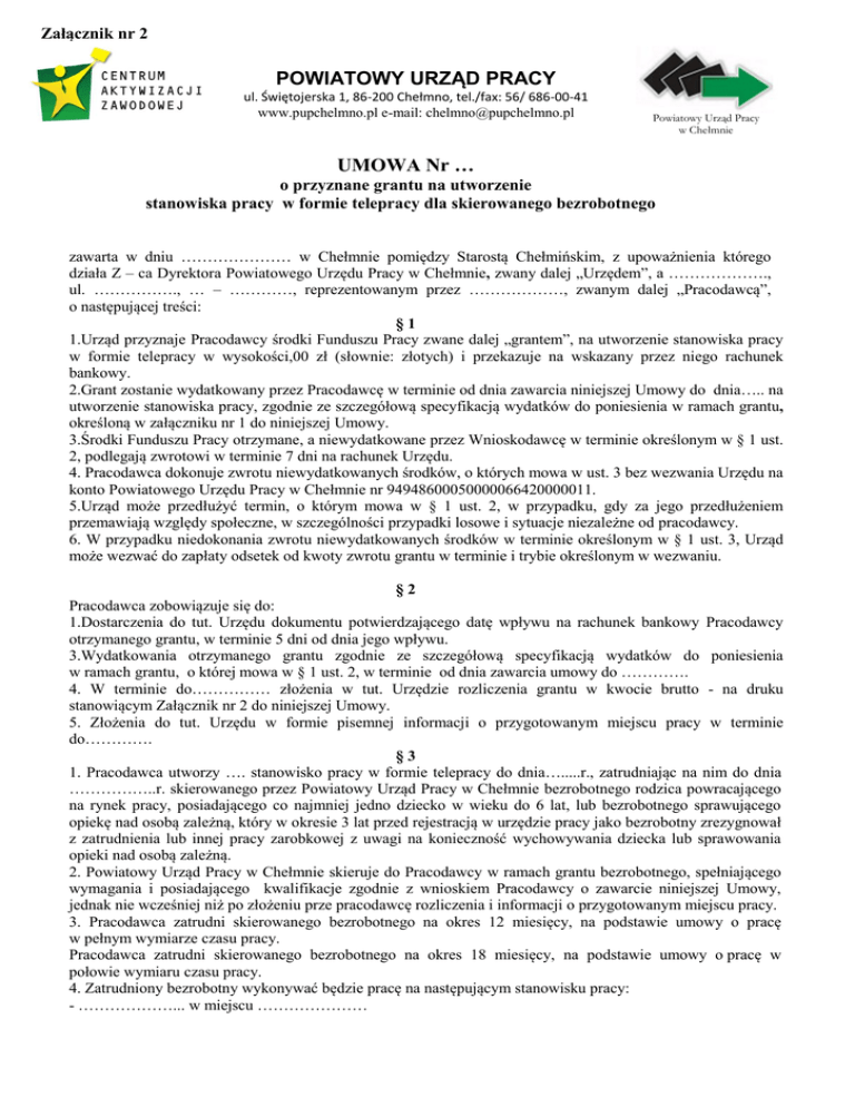Załącznik nr 2 POWIATOWY URZĄD PRACY ul. Świętojerska 1, 86-200 Chełmno, tel./fax: 56/ 686-00-41 www.pupchelmno.pl e-mail: [email protected] Powiatowy Urząd Pracy w Chełmnie UMOWA Nr … o przyznane grantu na utworzenie stanowiska pracy w formie telepracy dla skierowanego bezrobotnego zawarta w dniu ………………… w Chełmnie pomiędzy Starostą Chełmińskim, z upoważnienia którego działa Z – ca Dyrektora Powiatowego Urzędu Pracy w Chełmnie, zwany dalej „Urzędem”, a ………………., ul. ……………., … – …………, reprezentowanym przez ………………, zwanym dalej „Pracodawcą”, o następującej treści: §1 1.Urząd przyznaje Pracodawcy środki Funduszu Pracy zwane dalej „grantem”, na utworzenie stanowiska pracy w formie telepracy w wysokości,00 zł (słownie: złotych) i przekazuje na wskazany przez niego rachunek bankowy. 2.Grant zostanie wydatkowany przez Pracodawcę w terminie od dnia zawarcia niniejszej Umowy do dnia….. na utworzenie stanowiska pracy, zgodnie ze szczegółową specyfikacją wydatków do poniesienia w ramach grantu, określoną w załączniku nr 1 do niniejszej Umowy. 3.Środki Funduszu Pracy otrzymane, a niewydatkowane przez Wnioskodawcę w terminie określonym w § 1 ust. 2, podlegają zwrotowi w terminie 7 dni na rachunek Urzędu. 4. Pracodawca dokonuje zwrotu niewydatkowanych środków, o których mowa w ust. 3 bez wezwania Urzędu na konto Powiatowego Urzędu Pracy w Chełmnie nr 94948600050000066420000011. 5.Urząd może przedłużyć termin, o którym mowa w § 1 ust. 2, w przypadku, gdy za jego przedłużeniem przemawiają względy społeczne, w szczególności przypadki losowe i sytuacje niezależne od pracodawcy. 6. W przypadku niedokonania zwrotu niewydatkowanych środków w terminie określonym w § 1 ust. 3, Urząd może wezwać do zapłaty odsetek od kwoty zwrotu grantu w terminie i trybie określonym w wezwaniu. §2 Pracodawca zobowiązuje się do: 1.Dostarczenia do tut. Urzędu dokumentu potwierdzającego datę wpływu na rachunek bankowy Pracodawcy otrzymanego grantu, w terminie 5 dni od dnia jego wpływu. 3.Wydatkowania otrzymanego grantu zgodnie ze szczegółową specyfikacją wydatków do poniesienia w ramach grantu, o której mowa w § 1 ust. 2, w terminie od dnia zawarcia umowy do …………. 4. W terminie do…………… złożenia w tut. Urzędzie rozliczenia grantu w kwocie brutto - na druku stanowiącym Załącznik nr 2 do niniejszej Umowy. 5. Złożenia do tut. Urzędu w formie pisemnej informacji o przygotowanym miejscu pracy w terminie do…………. §3 1. Pracodawca utworzy …. stanowisko pracy w formie telepracy do dnia….....r., zatrudniając na nim do dnia ……………..r. skierowanego przez Powiatowy Urząd Pracy w Chełmnie bezrobotnego rodzica powracającego na rynek pracy, posiadającego co najmniej jedno dziecko w wieku do 6 lat, lub bezrobotnego sprawującego opiekę nad osobą zależną, który w okresie 3 lat przed rejestracją w urzędzie pracy jako bezrobotny zrezygnował z zatrudnienia lub innej pracy zarobkowej z uwagi na konieczność wychowywania dziecka lub sprawowania opieki nad osobą zależną. 2. Powiatowy Urząd Pracy w Chełmnie skieruje do Pracodawcy w ramach grantu bezrobotnego, spełniającego wymagania i posiadającego kwalifikacje zgodnie z wnioskiem Pracodawcy o zawarcie niniejszej Umowy, jednak nie wcześniej niż po złożeniu prze pracodawcę rozliczenia i informacji o przygotowanym miejscu pracy. 3. Pracodawca zatrudni skierowanego bezrobotnego na okres 12 miesięcy, na podstawie umowy o pracę w pełnym wymiarze czasu pracy. Pracodawca zatrudni skierowanego bezrobotnego na okres 18 miesięcy, na podstawie umowy o pracę w połowie wymiaru czasu pracy. 4. Zatrudniony bezrobotny wykonywać będzie pracę na następującym stanowisku pracy: - ………………... w miejscu ………………… 5. Pracodawca w terminie do dnia ………. r. złoży w Powiatowym Urzędzie Pracy w Chełmnie kopię zawartej umowy o pracę ze skierowanym bezrobotnym. §4 Pracodawca zobowiązuje się do: 1. Utworzenie stanowiska pracy w formie telepracy do dnia……. 2.Utrzymania zatrudnienia skierowanego bezrobotnego przez okres 12 miesięcy w pełnym wymiarze czasu pracy na utworzonym stanowisku pracy, na podstawie umowy o pracę. (utrzymania zatrudnienia skierowanego bezrobotnego przez okres 18 miesięcy w połowie wymiaru czasu pracy, na podstawie umowy o pracę) 3.Utrzymania przez okres co najmniej 12 miesięcy stanowiska pracy utworzonego w związku z przyznanym grantem. (Utrzymania przez okres co najmniej 18 miesięcy stanowiska pracy utworzonego w związku z przyznanym grantem) 4. Złożenia kopii zawartej umowy o pracę ze skierowanym bezrobotnym w terminie do dnia ………….. 5. Złożenia rozliczenia oraz dokumentów, o których mowa w § 2 ust. 4 niniejszej Umowy w terminie do dnia ……….., na druku stanowiącym załącznik nr 2 do niniejszej umowy. 6.Udostępniania na żądanie Urzędu wszelkiej dokumentacji związanej z wykonaniem zapisów niniejszej umowy. 7.Umożliwienia przeprowadzenia pracownikom Powiatowego Urzędu Pracy w Chełmnie kontroli realizacji Umowy oraz udzielania informacji i wyjaśnień w tym zakresie. 8.Niezwłocznego informowania Urzędu, nie później jednak niż w ciągu 7 dni o wypadkach wcześniejszego rozwiązania umowy o pracę ze skierowanym bezrobotnym oraz o zmianach w zawartej z bezrobotnym umowie o pracę oraz przekazania odpowiednio kopii świadectw pracy lub kopii dokumentu wprowadzającego zmiany w zawartej z bezrobotnym umowie. 9. Niezwłocznego poinformowania Urzędu w przypadku, gdy bezrobotny nie zgłosi się do wykonywania pracy. 10.Zwrotu grantu, o którym mowa w § 1 ust. 1 wraz z odsetkami ustawowymi naliczonymi od dnia otrzymania grantu, w terminie 30 dni od dnia doręczenia wezwania Urzędu, w przypadku: a) złożenia niezgodnych z prawdą oświadczeń, zaświadczeń, informacji, b) naruszenia